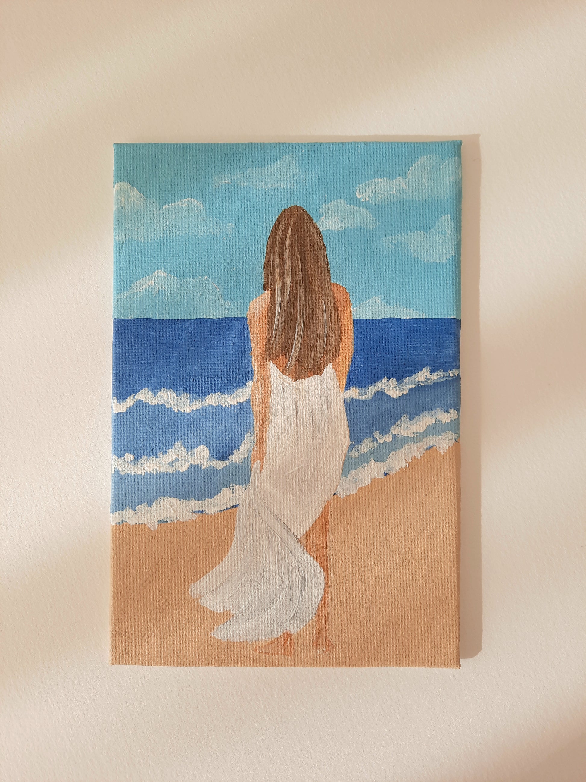 "A Walk to Remember" is a delicate original acrylic painting that portrays a woman standing on the beach, gazing at the sea in a flowing white dress. This miniature artwork captures a moment of solitude and reflection, evoking a sense of peace and nostalgia.