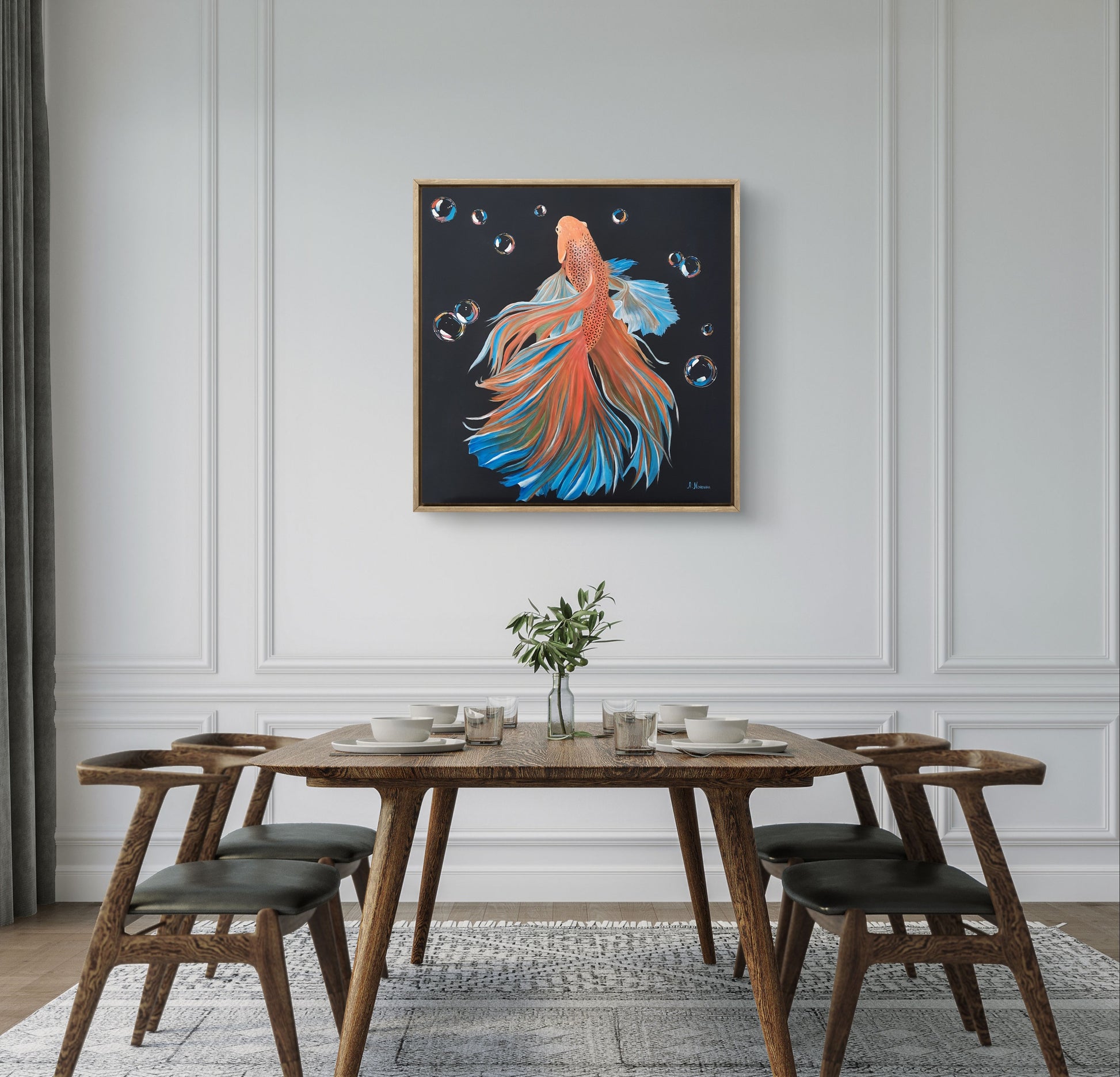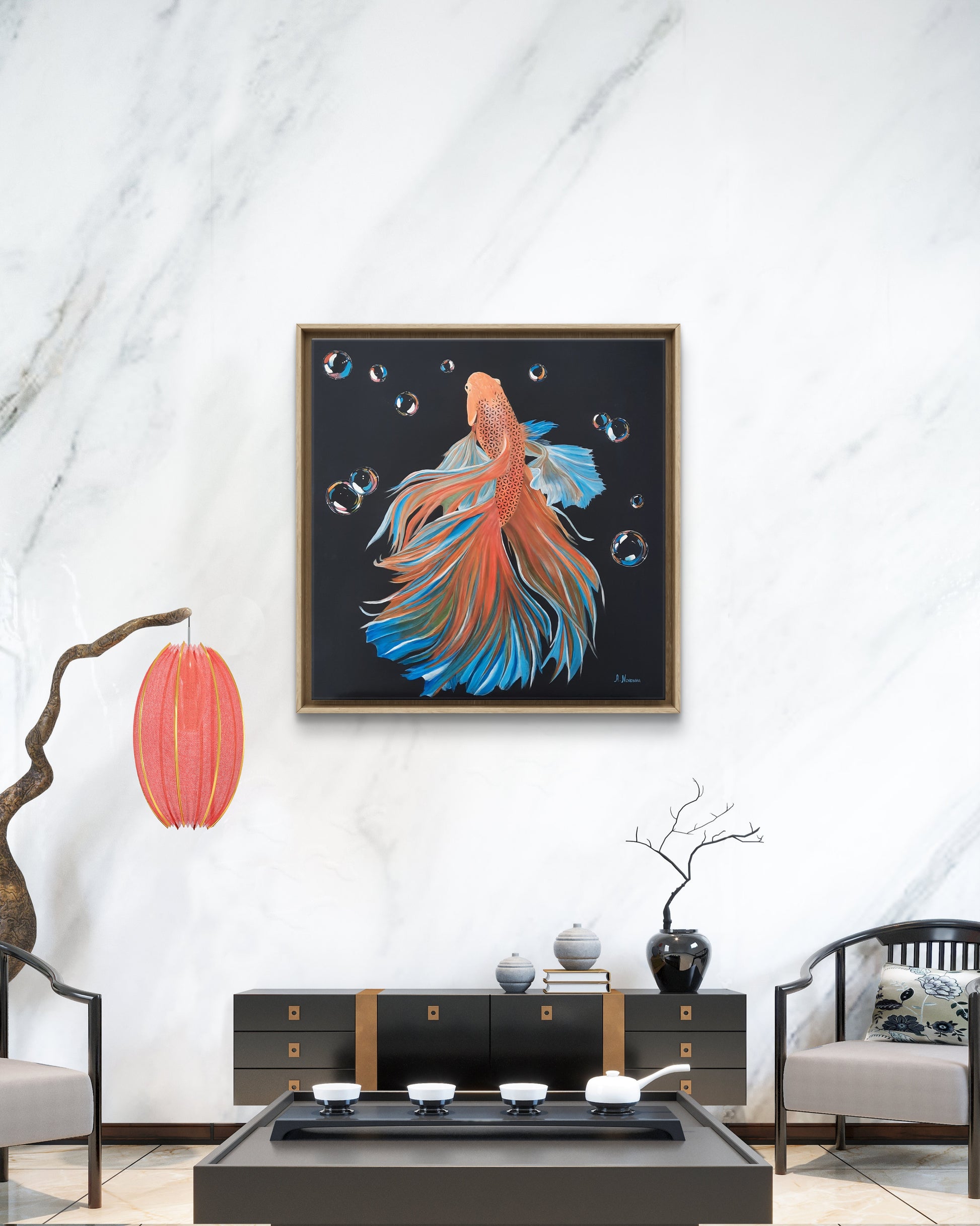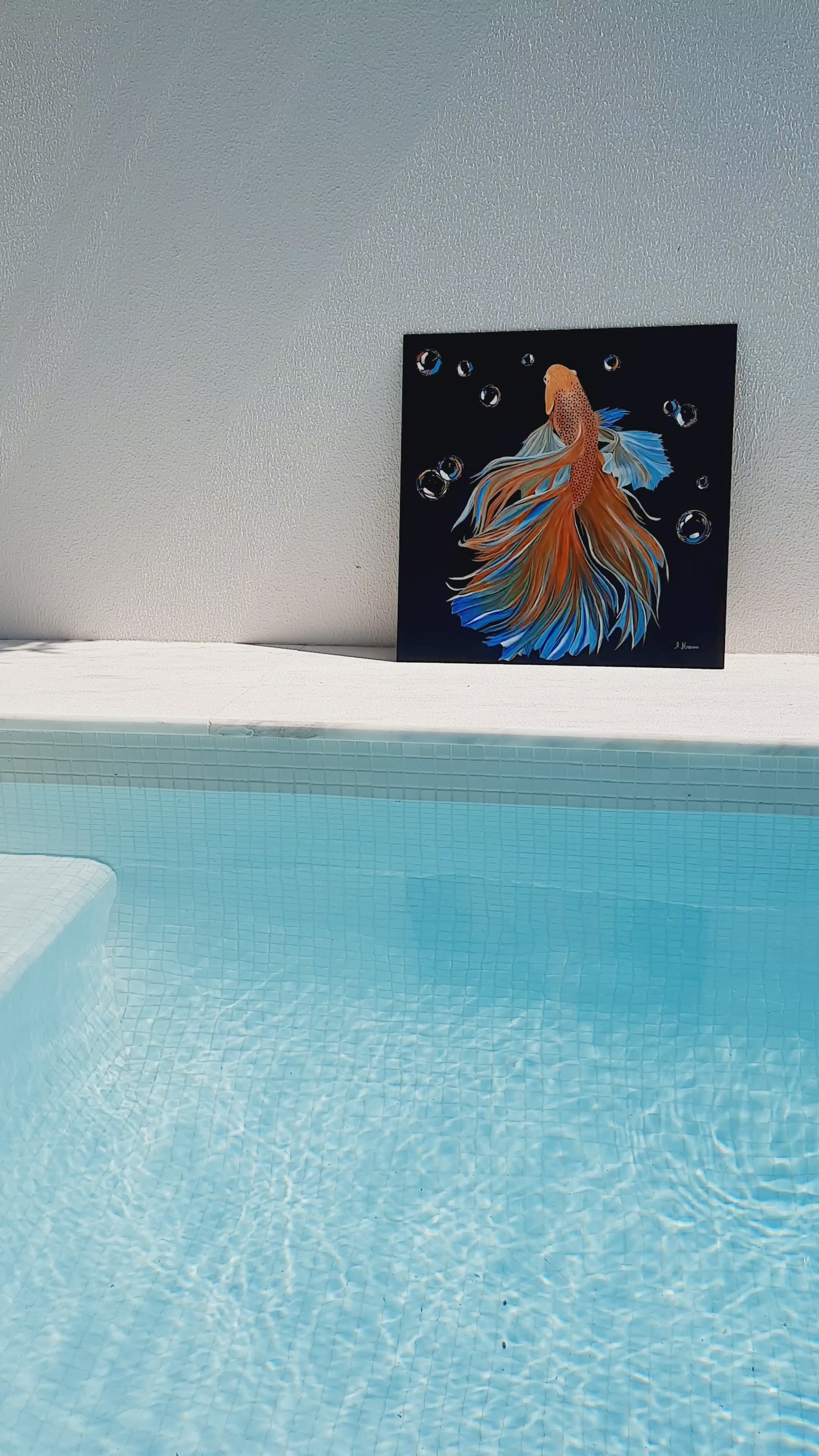 A mesmerizing acrylic painting on MDF board, capturing the elegance and fluidity of a betta fish in motion. The delicate interplay of colors and the intricate details create a stunning visual contrast against the deep black background, making this piece a striking centerpiece.