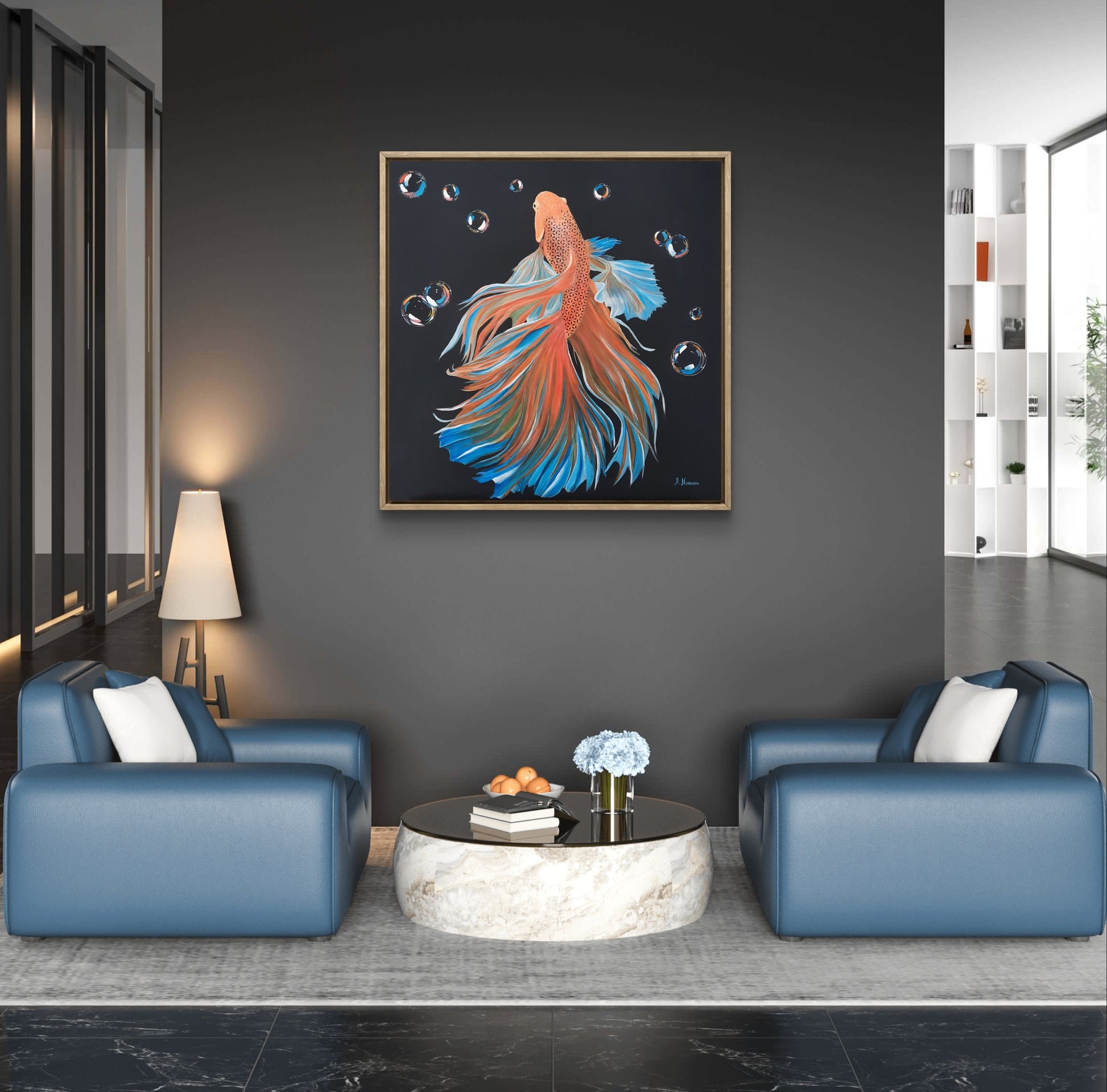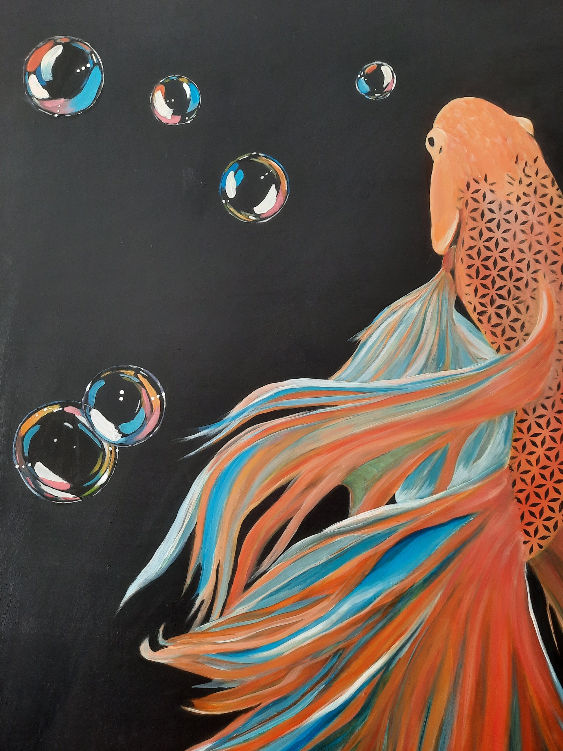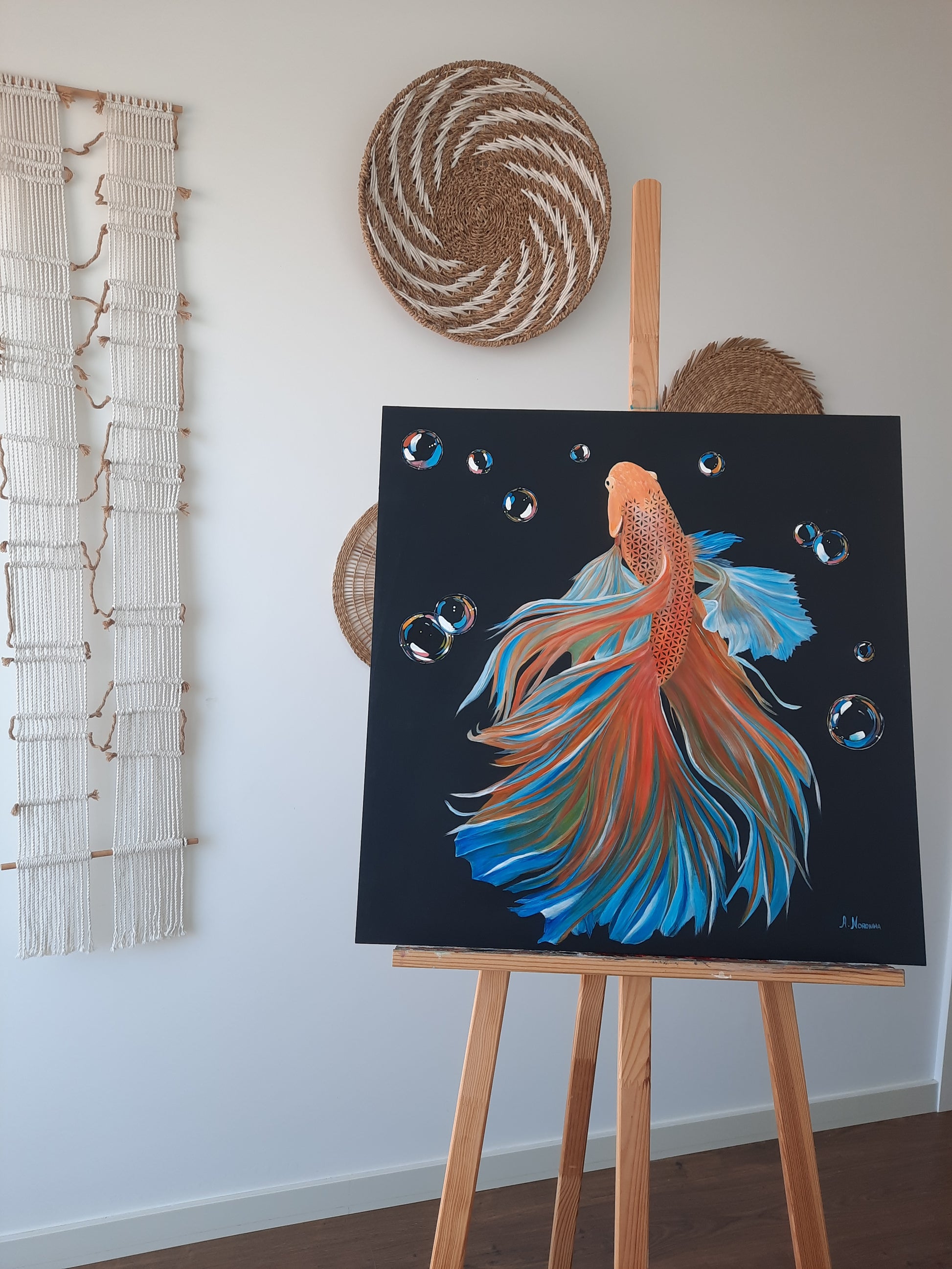 A mesmerizing acrylic painting on MDF board, capturing the elegance and fluidity of a betta fish in motion. The delicate interplay of colors and the intricate details create a stunning visual contrast against the deep black background, making this piece a striking centerpiece.