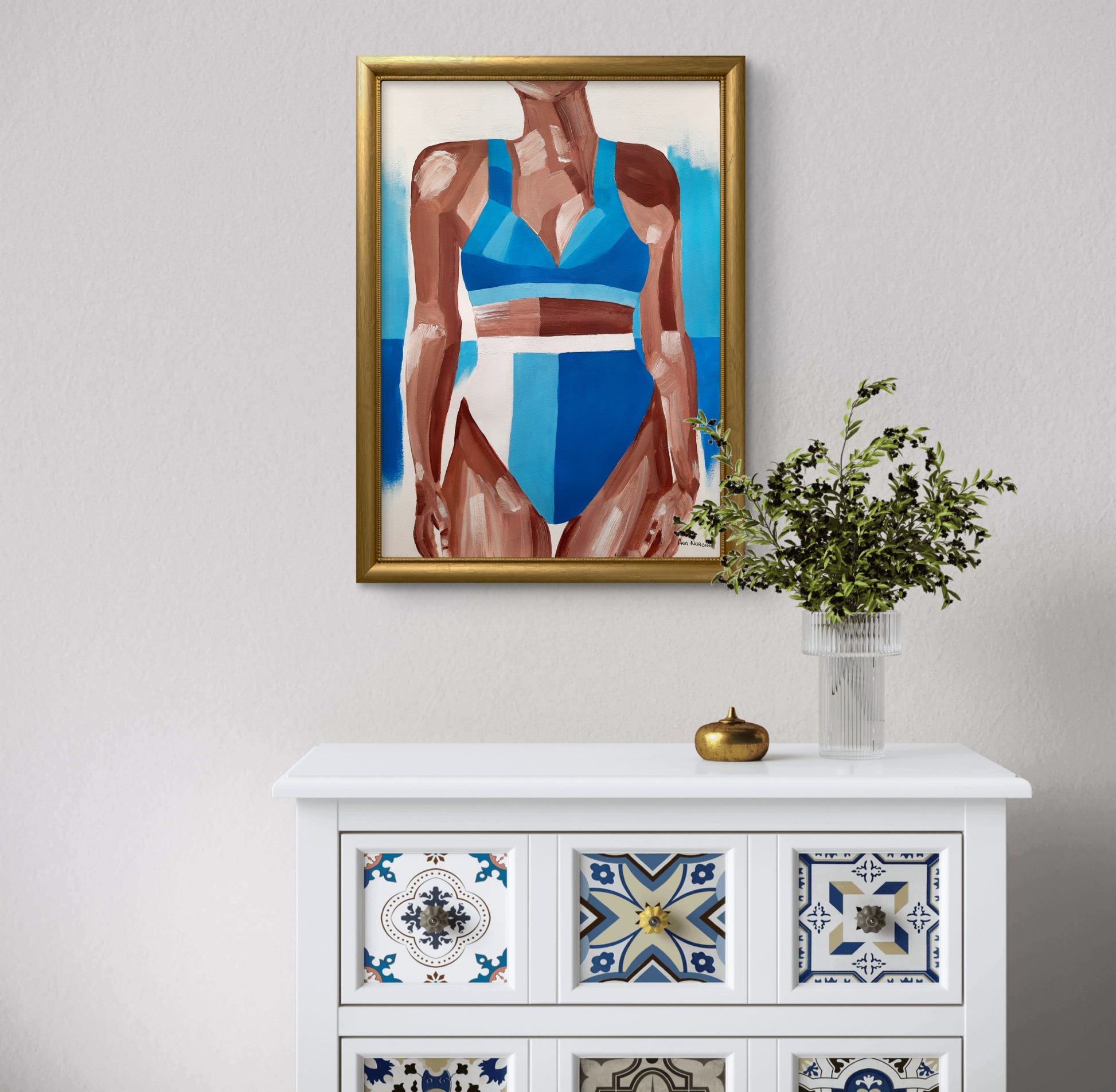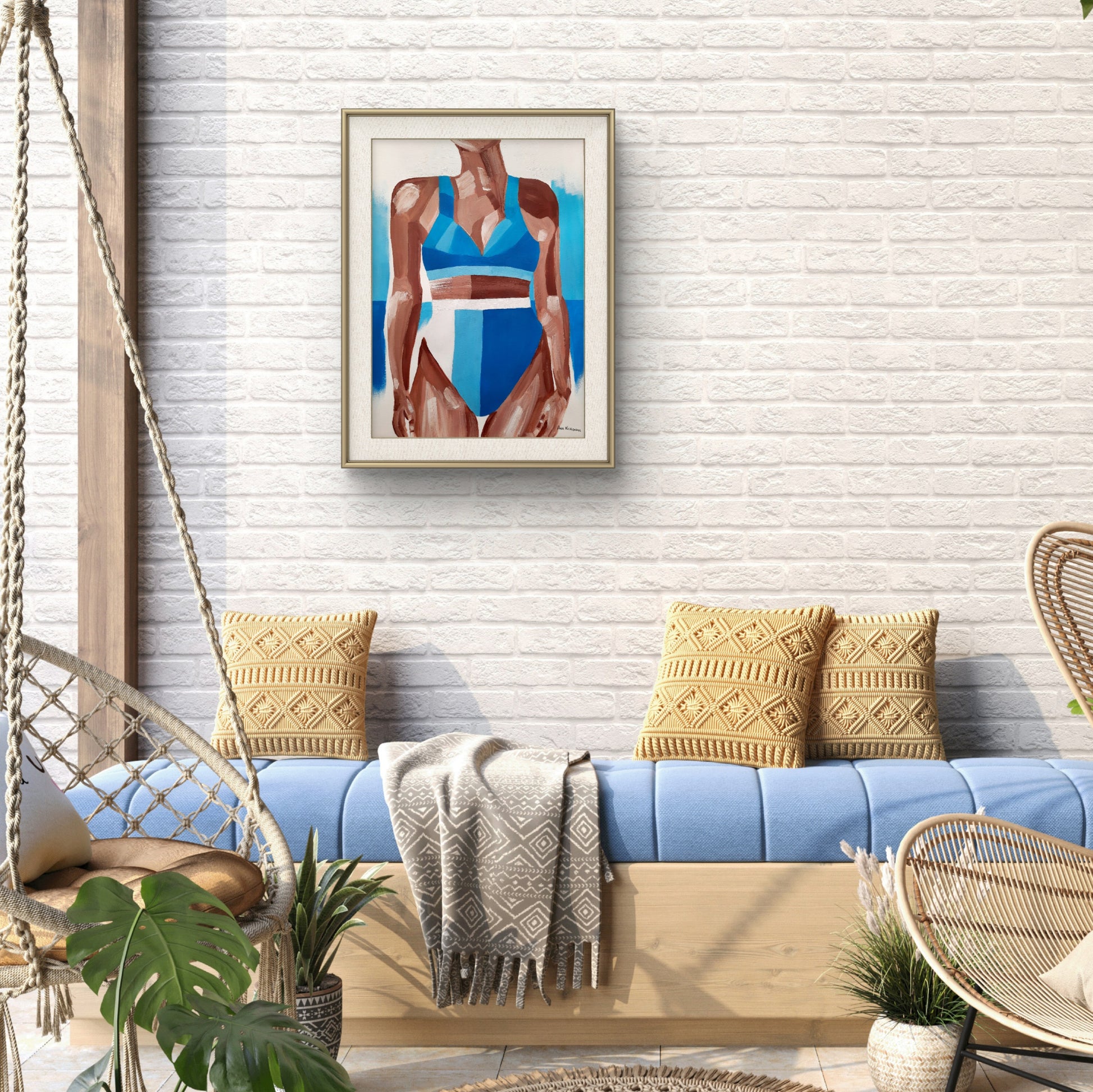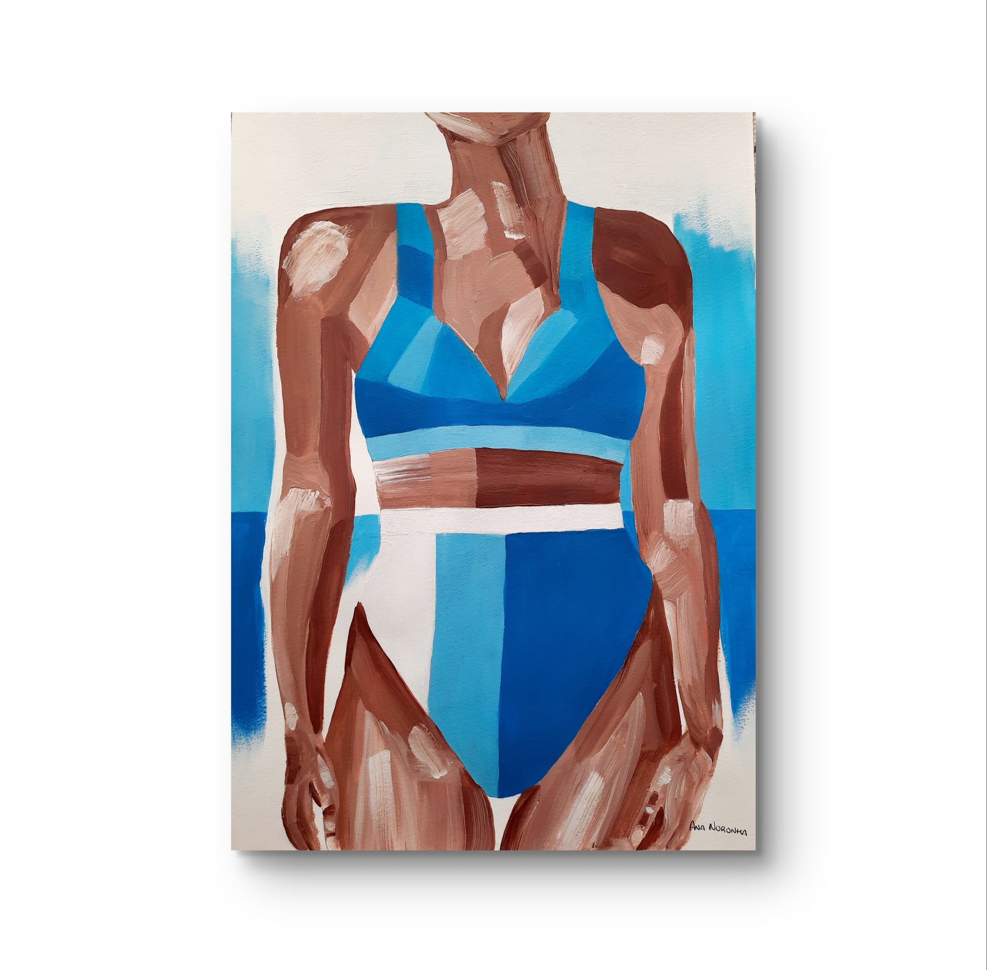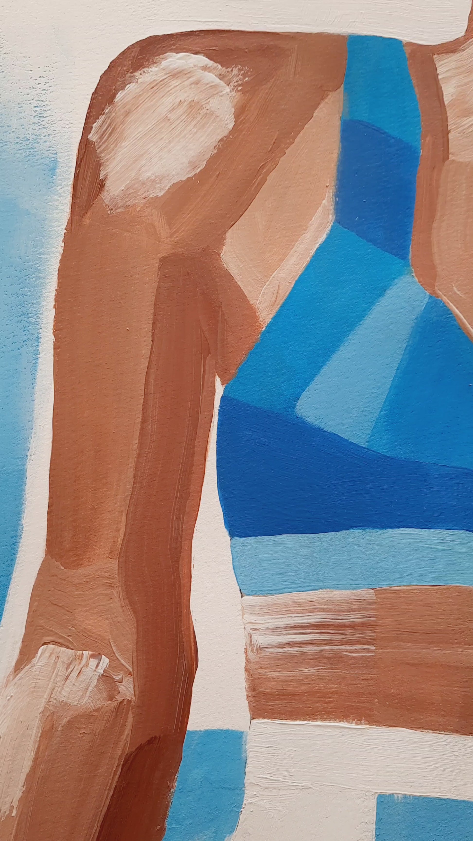 "Blue Horizon" is a striking acrylic painting on 300g watercolor paper, sized A3, that captures the essence of summer, strength, and confidence. The bold brushstrokes and geometric blocks of blue, white, and earthy tones create a dynamic composition, blending abstraction with figurative elements.