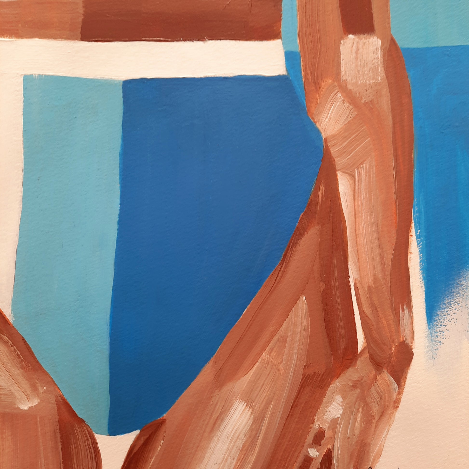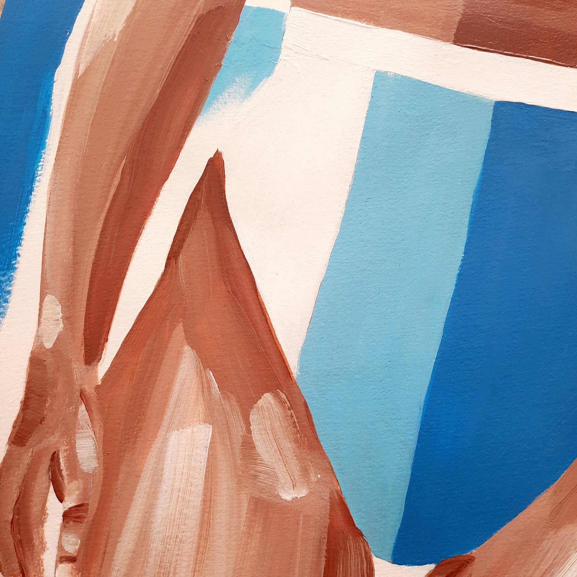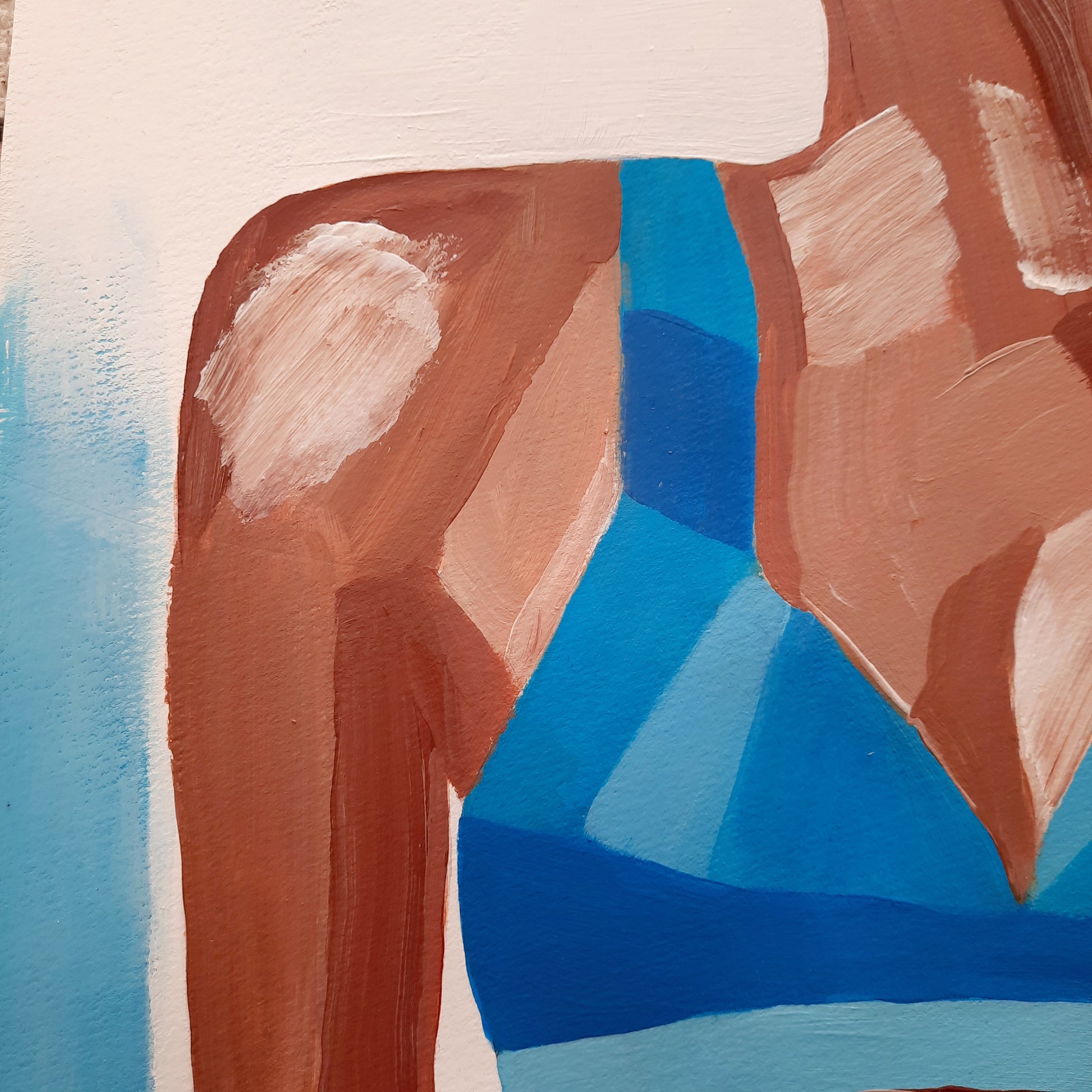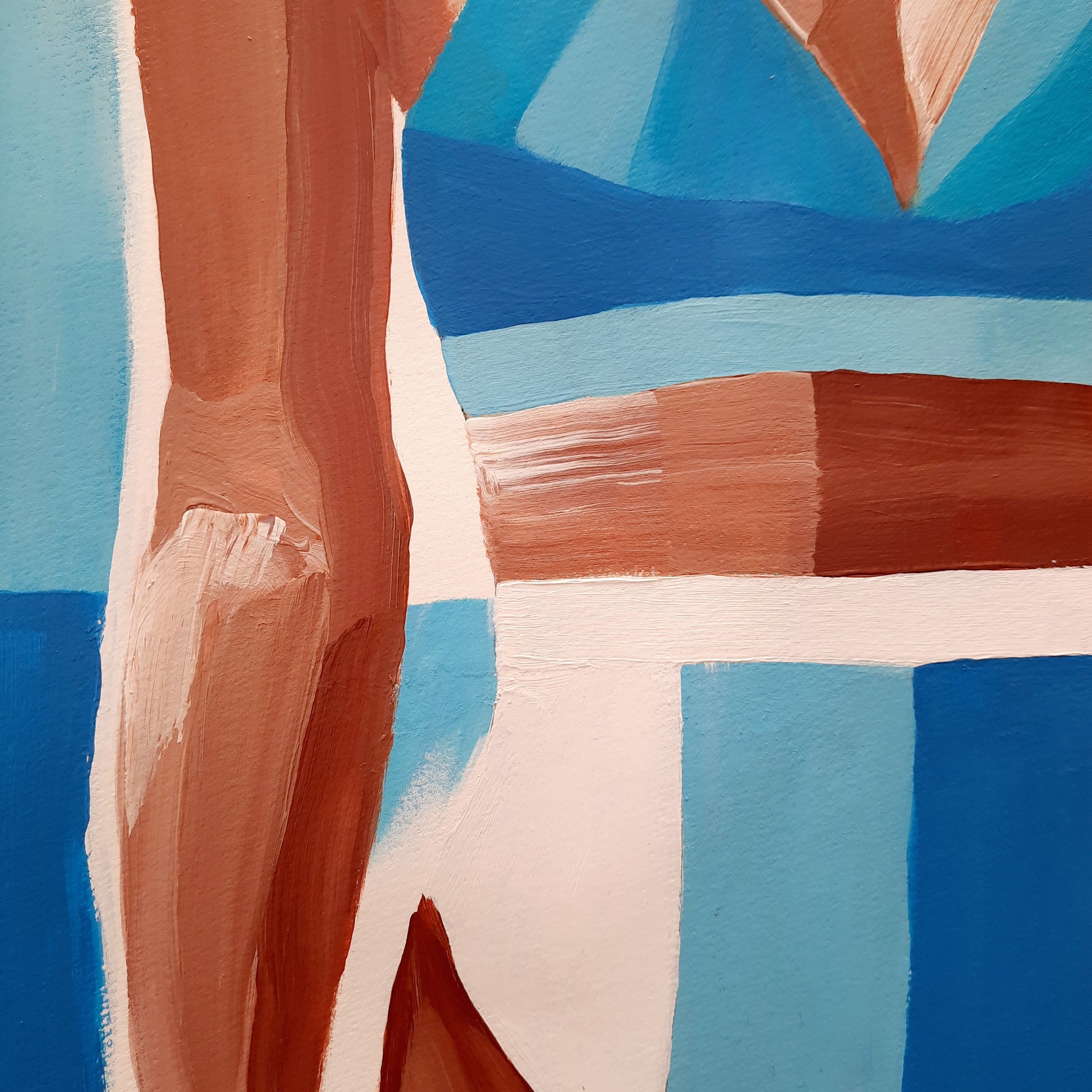 "Blue Horizon" is a striking acrylic painting on 300g watercolor paper, sized A3, that captures the essence of summer, strength, and confidence. The bold brushstrokes and geometric blocks of blue, white, and earthy tones create a dynamic composition, blending abstraction with figurative elements.