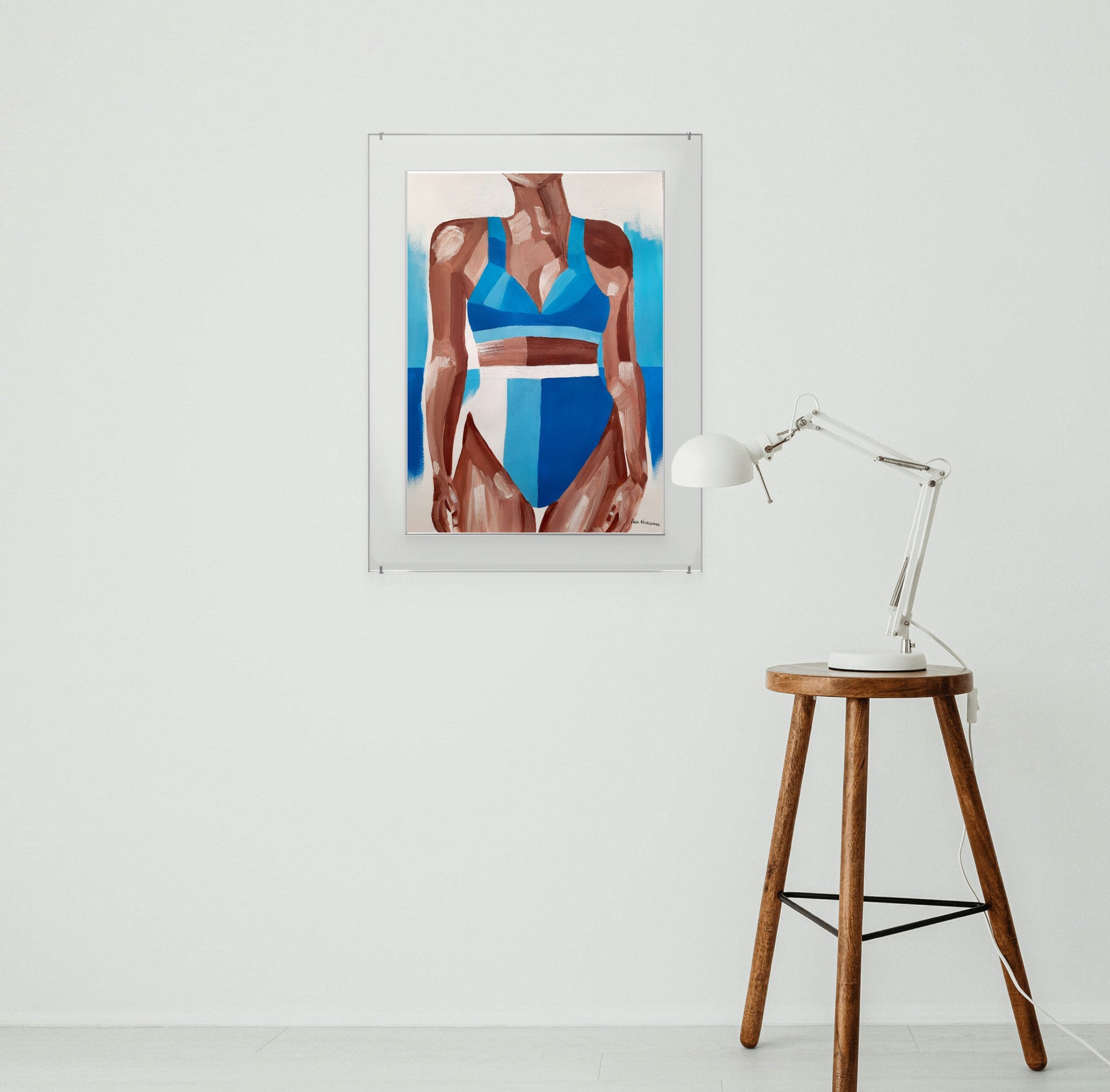 The interplay of light and shadow on the subject’s skin, painted with expressive strokes, gives the piece a sculptural quality, emphasizing movement and vitality. The vibrant shades of blue echo the sea and sky, evoking a sense of freedom and endless possibility—an open horizon both literal and metaphorical.