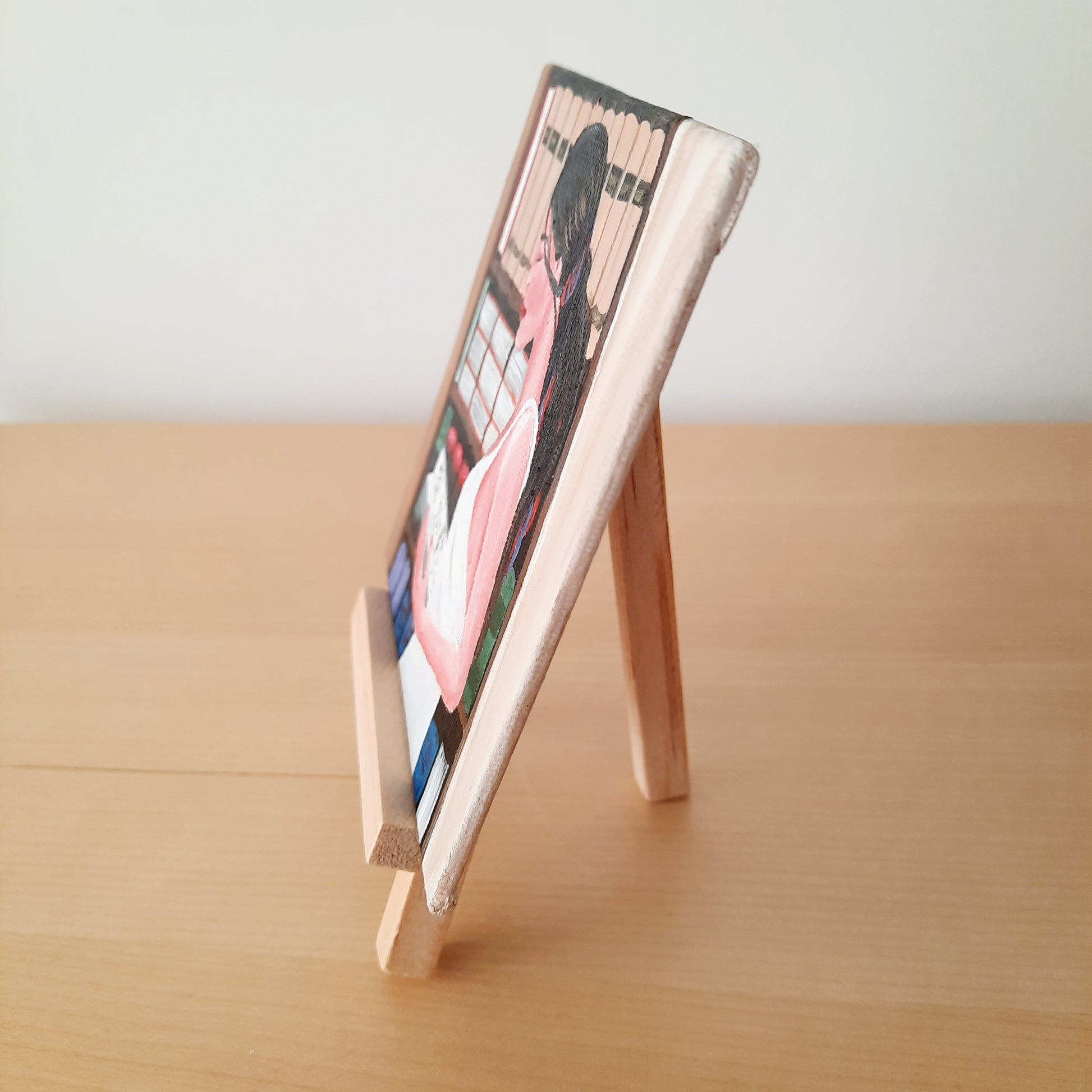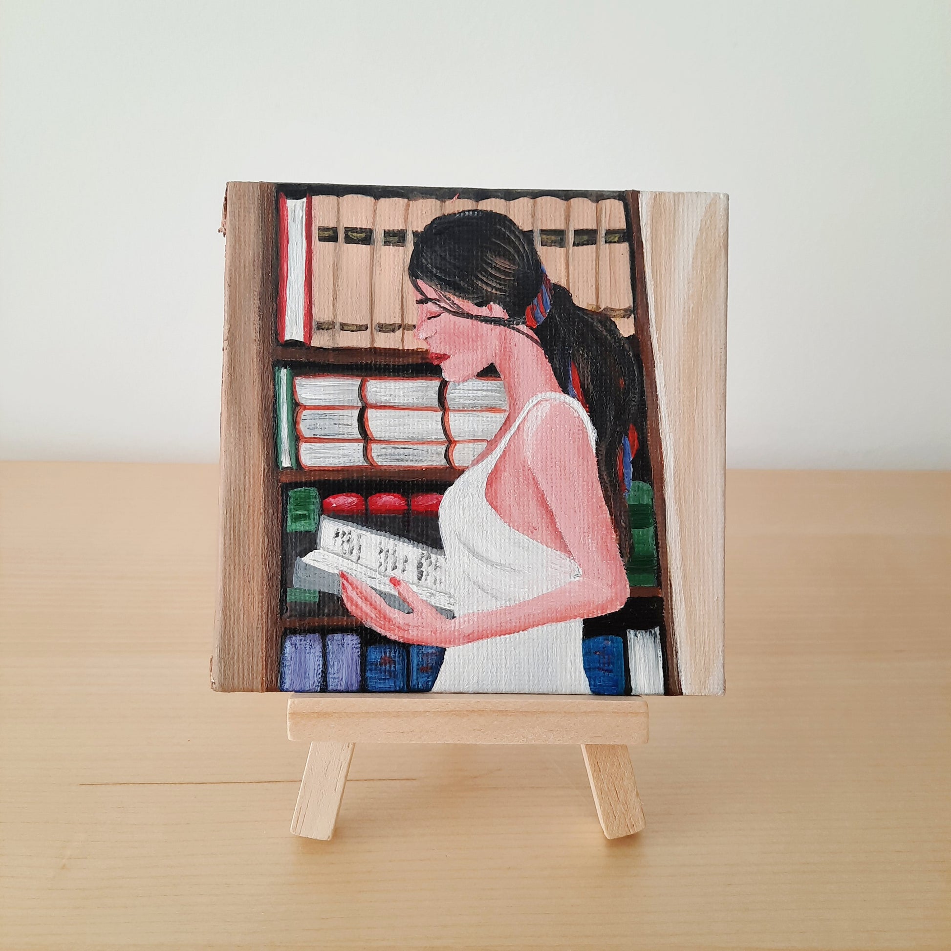 This miniature acrylic painting beautifully captures a serene moment: a woman absorbed in her book, surrounded by towering bookshelves filled with literary treasures. The warm color palette and delicate brushstrokes highlight the calm, introspective beauty of a quiet reading nook.
