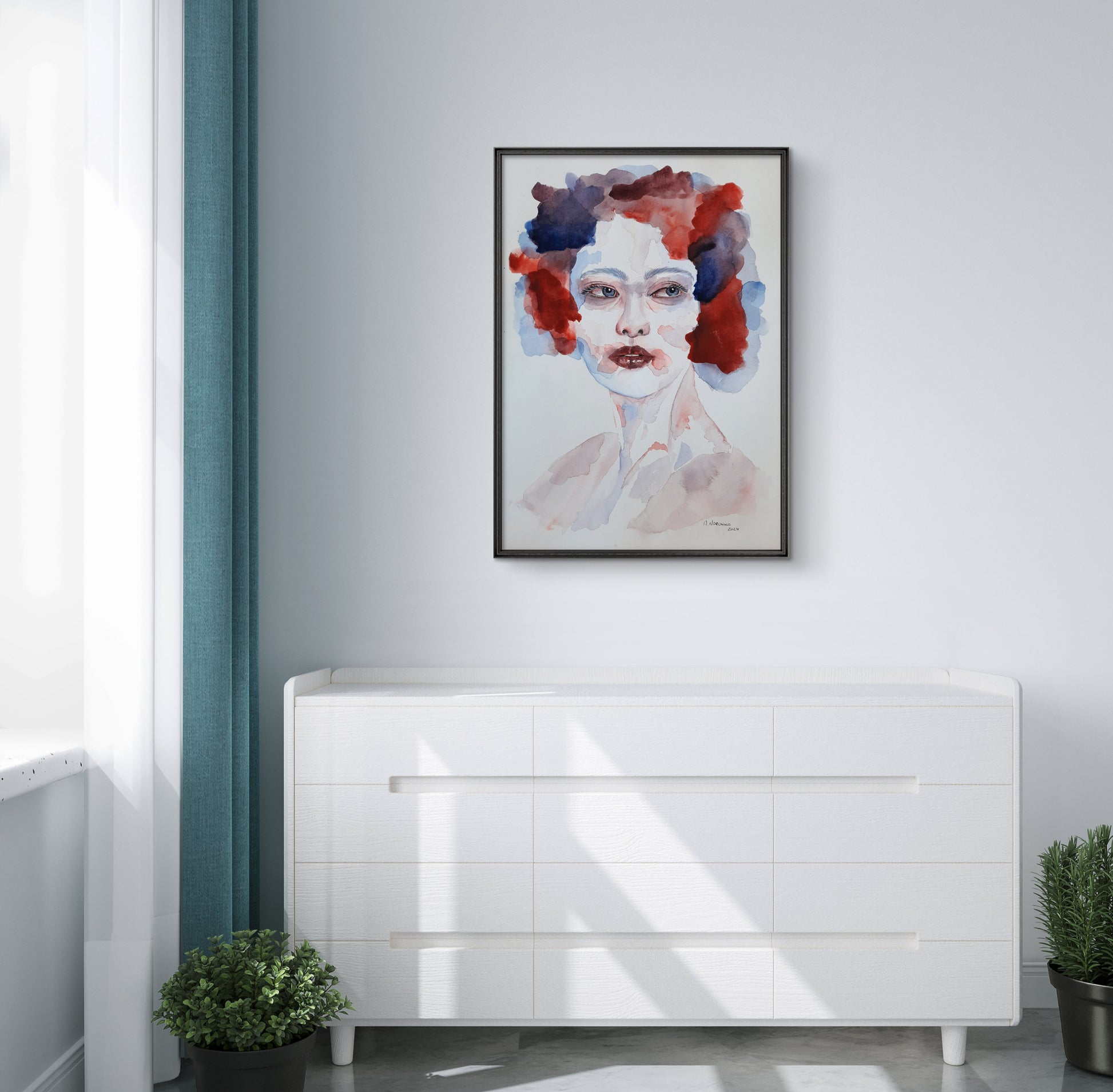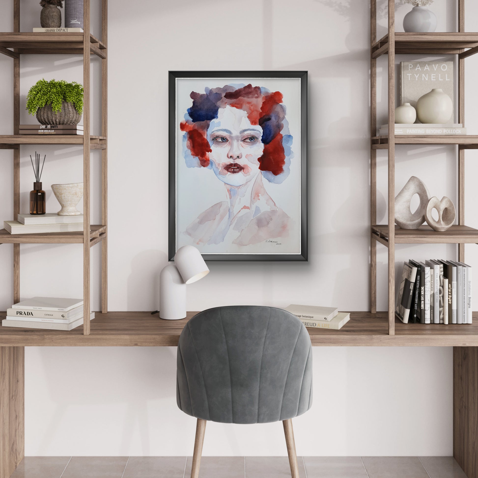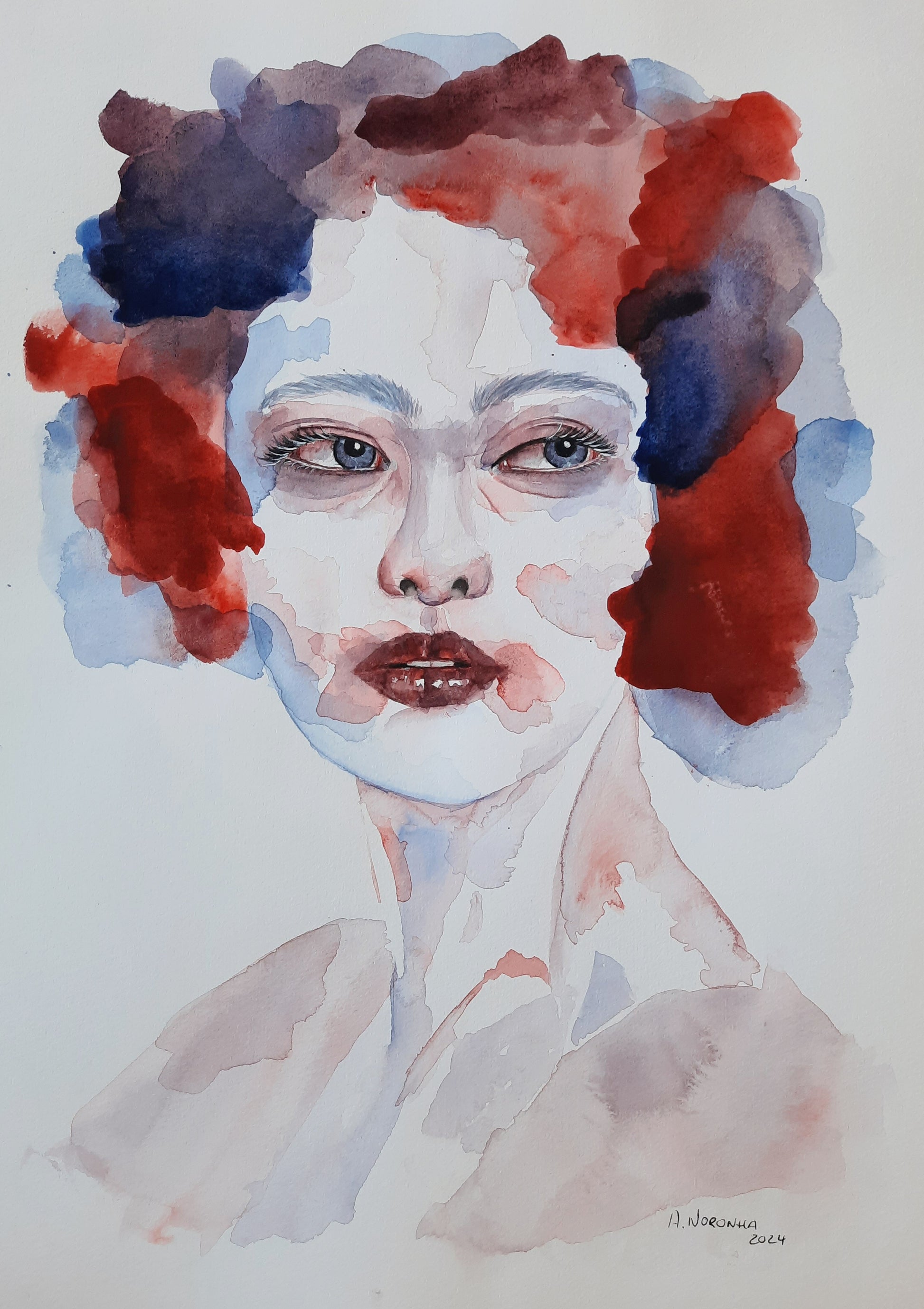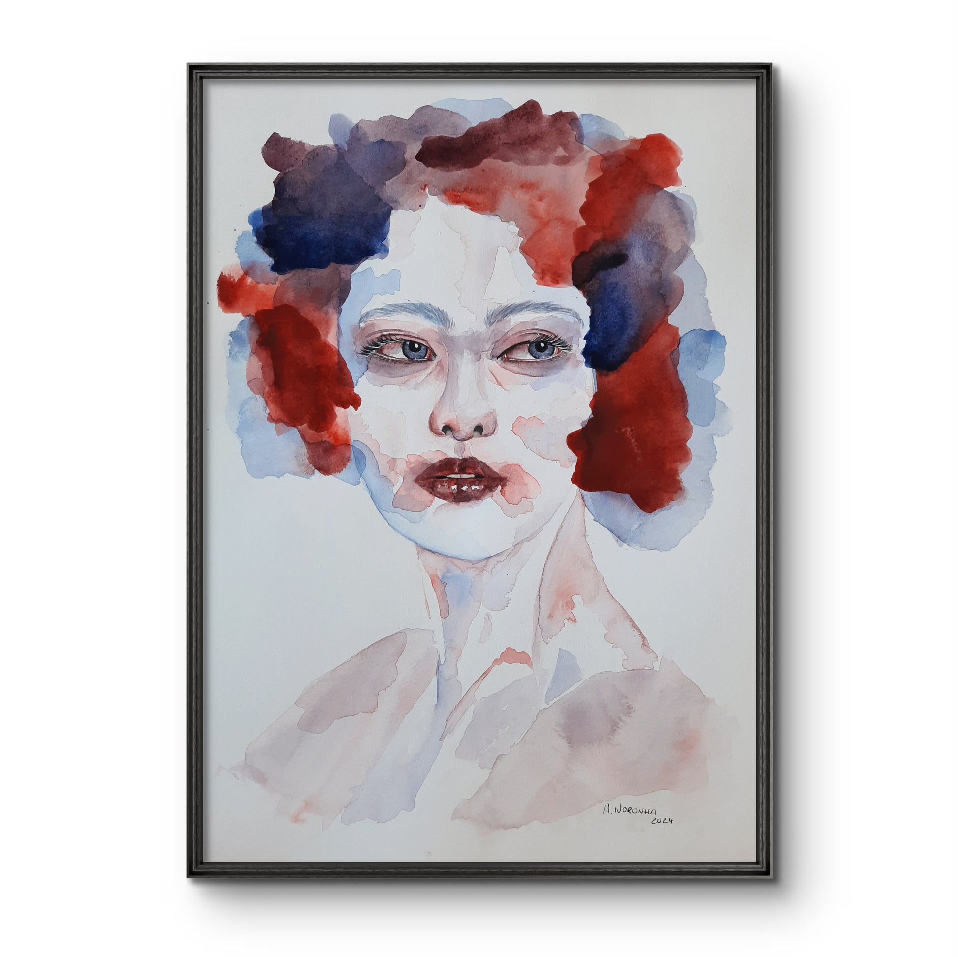 A bold and expressive portrait, "Ethereal Reflections" captures raw emotion through fluid brushstrokes and a striking contrast of deep reds and blues. The interplay of color and form evokes a sense of introspection and mystery, making it a powerful statement piece.