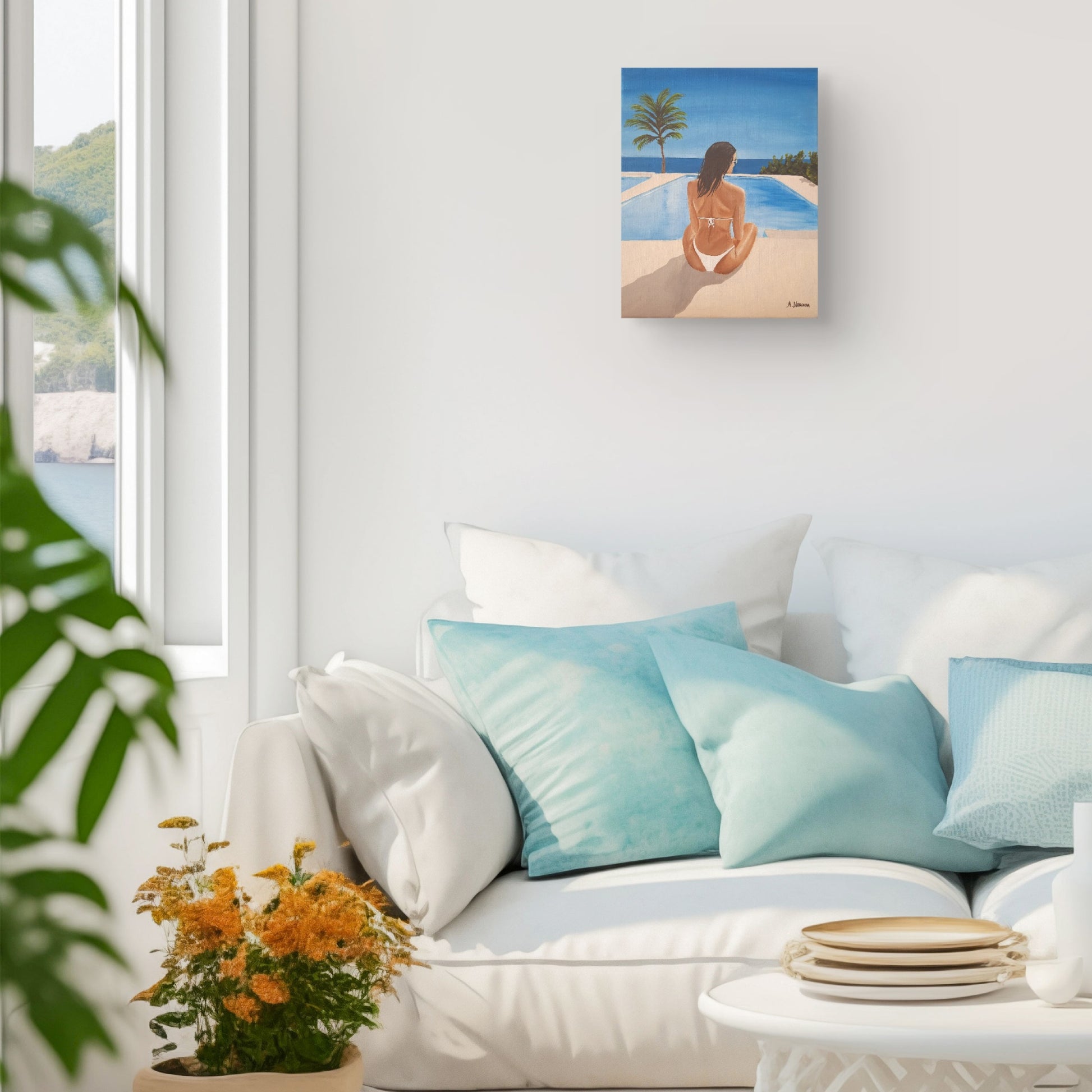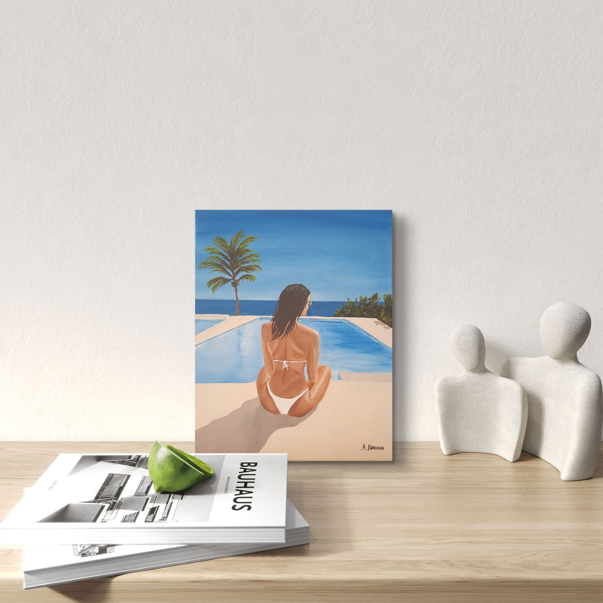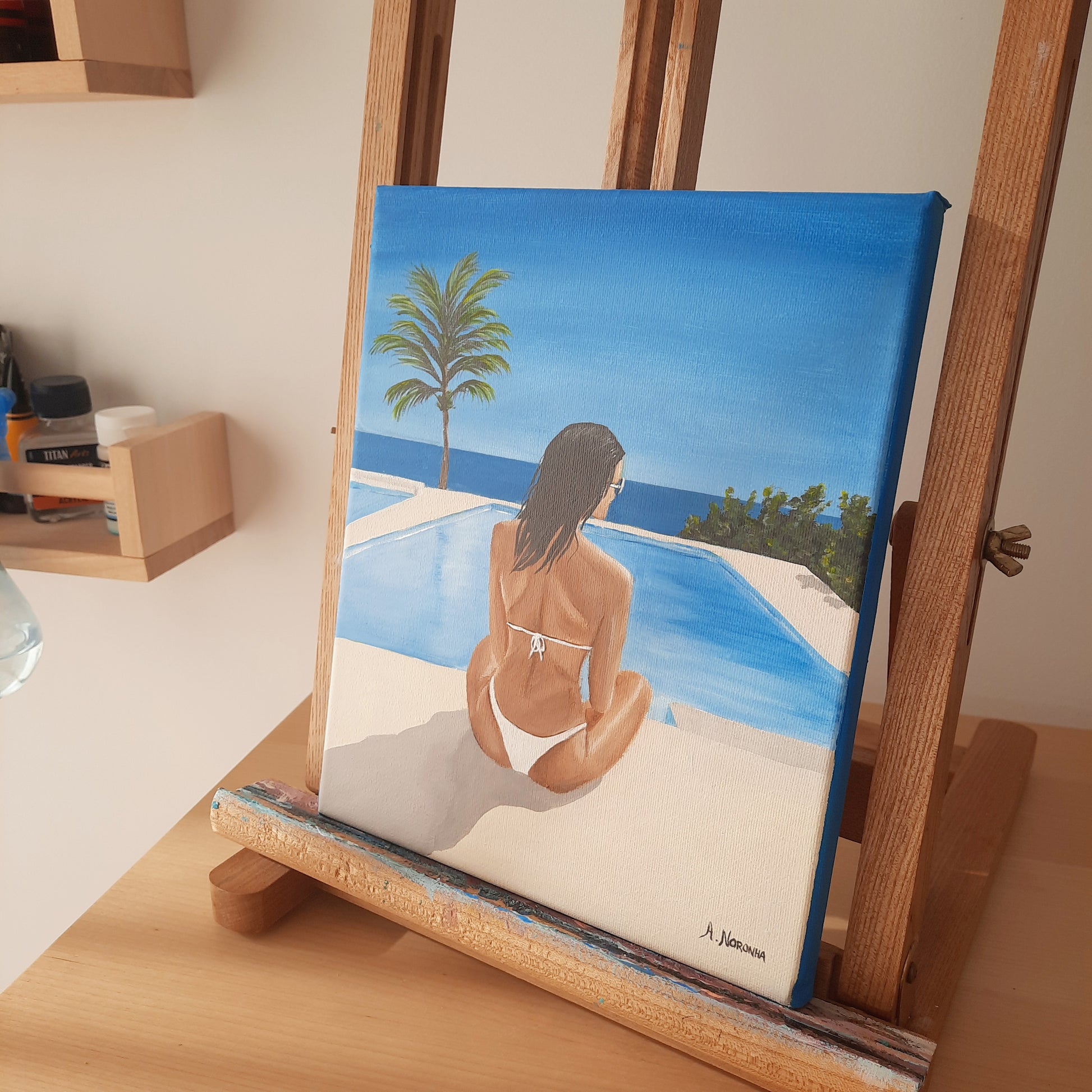 This painting exudes a sense of tranquility and warmth, capturing the perfect moment of an unforgettable summer. The woman, seated at the edge of the pool overlooking the sea, reflects the serenity of a sunlit day where time seems to slow down. The vibrant blues of the sky and water contrast harmoniously with the warm tones of the skin and sand, creating a balanced and relaxing composition.