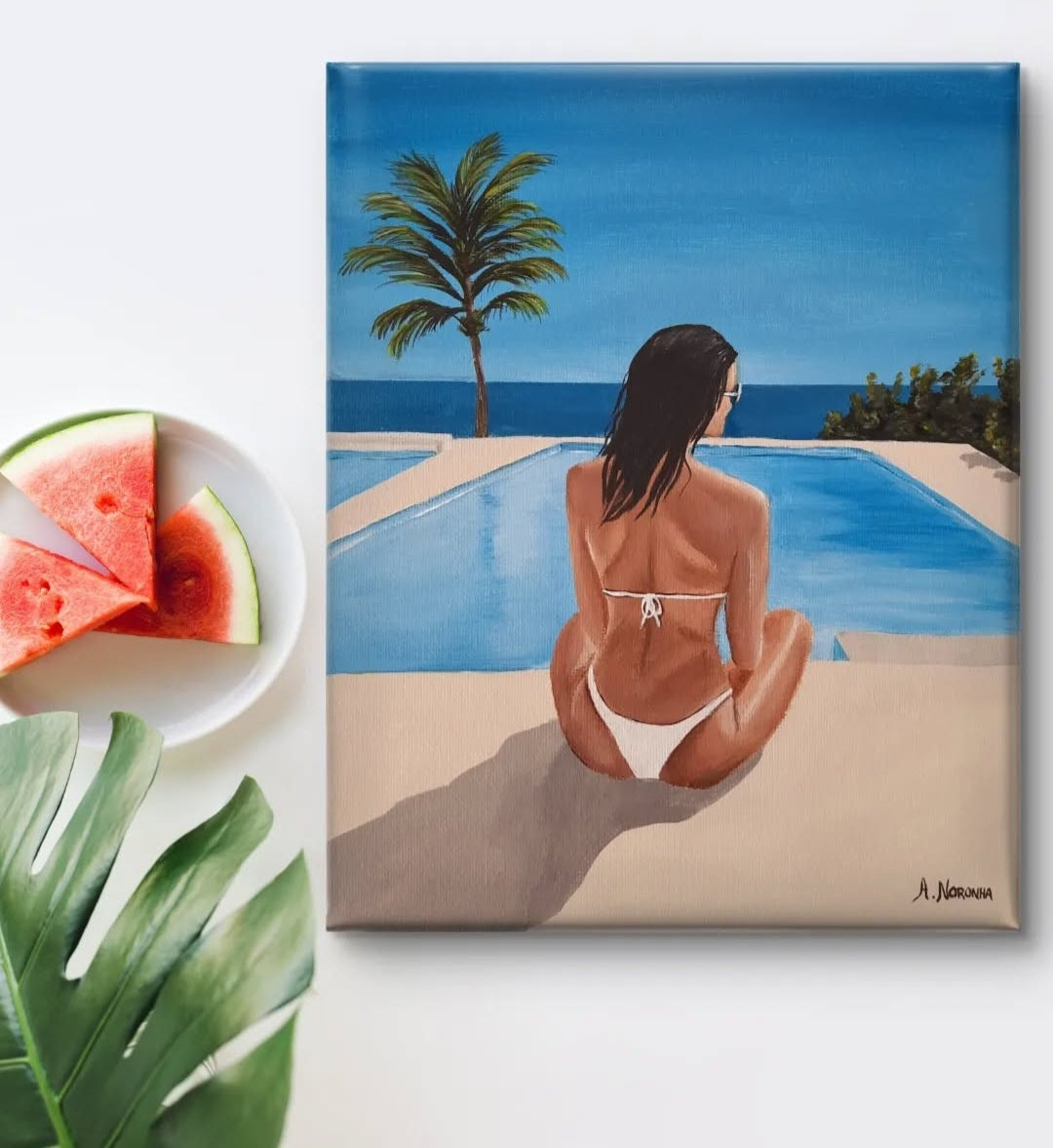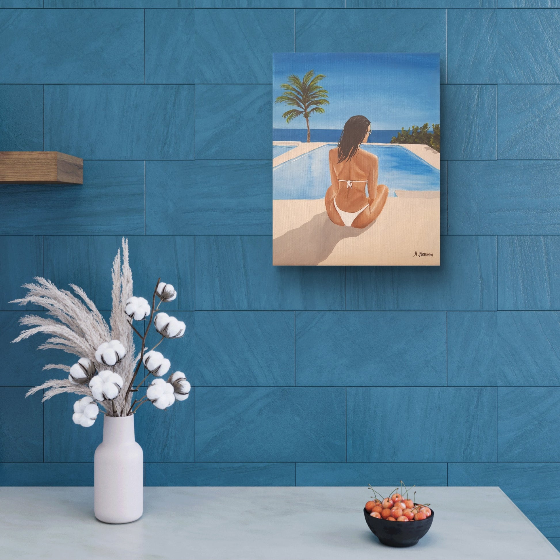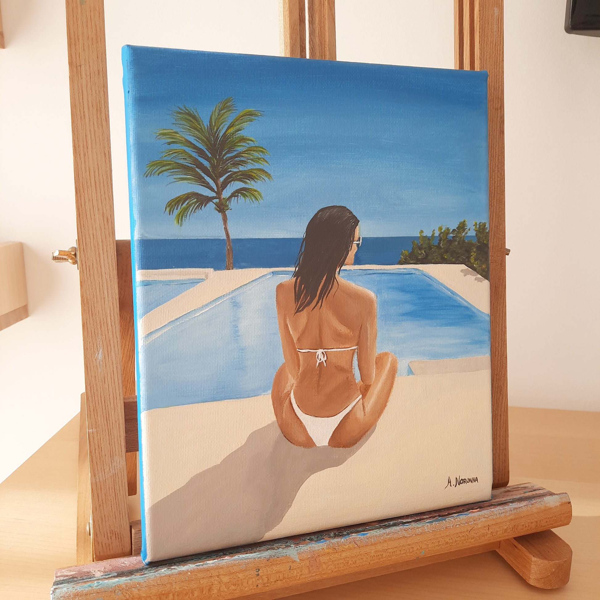 This painting exudes a sense of tranquility and warmth, capturing the perfect moment of an unforgettable summer. The woman, seated at the edge of the pool overlooking the sea, reflects the serenity of a sunlit day where time seems to slow down. The vibrant blues of the sky and water contrast harmoniously with the warm tones of the skin and sand, creating a balanced and relaxing composition.