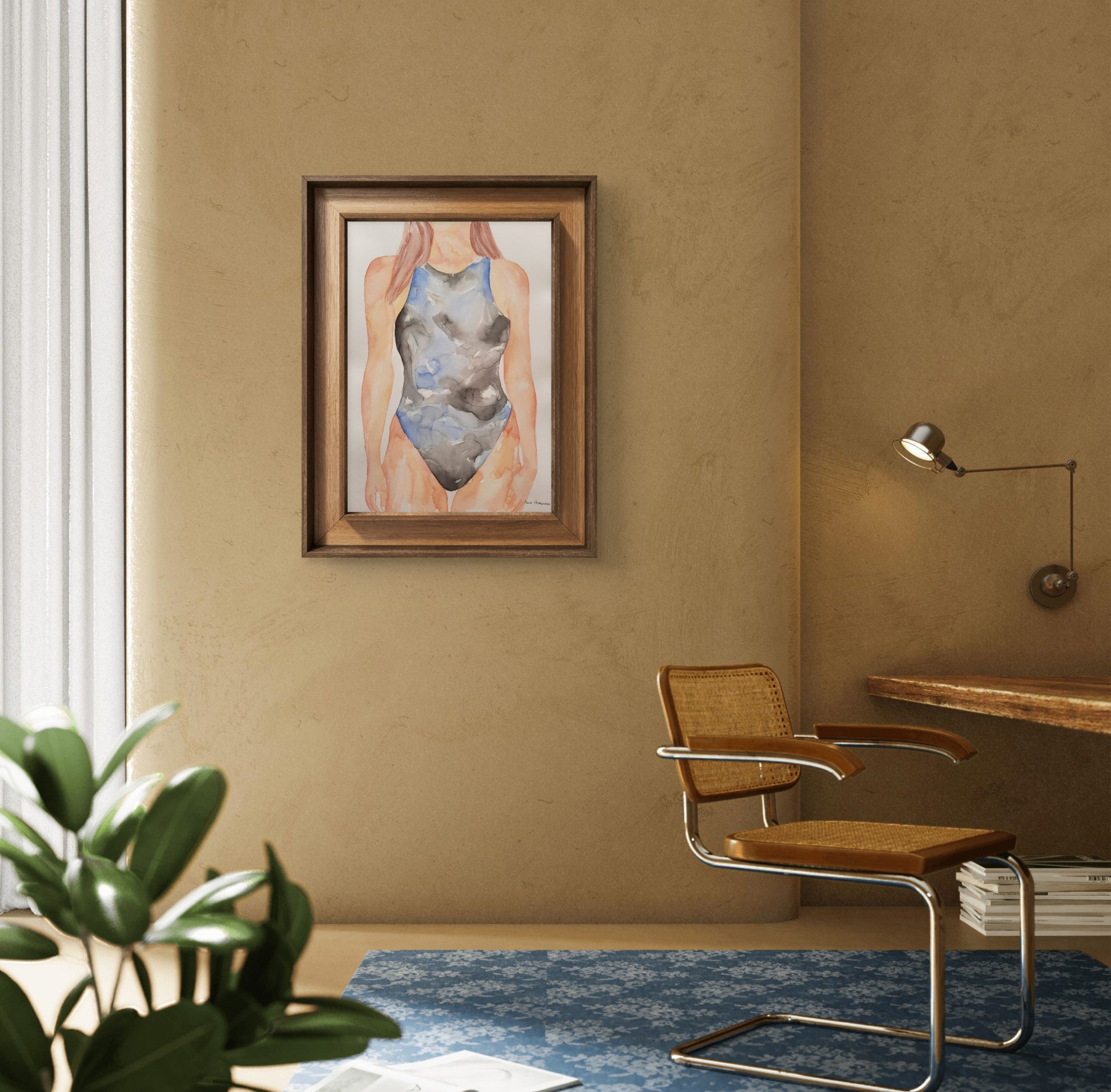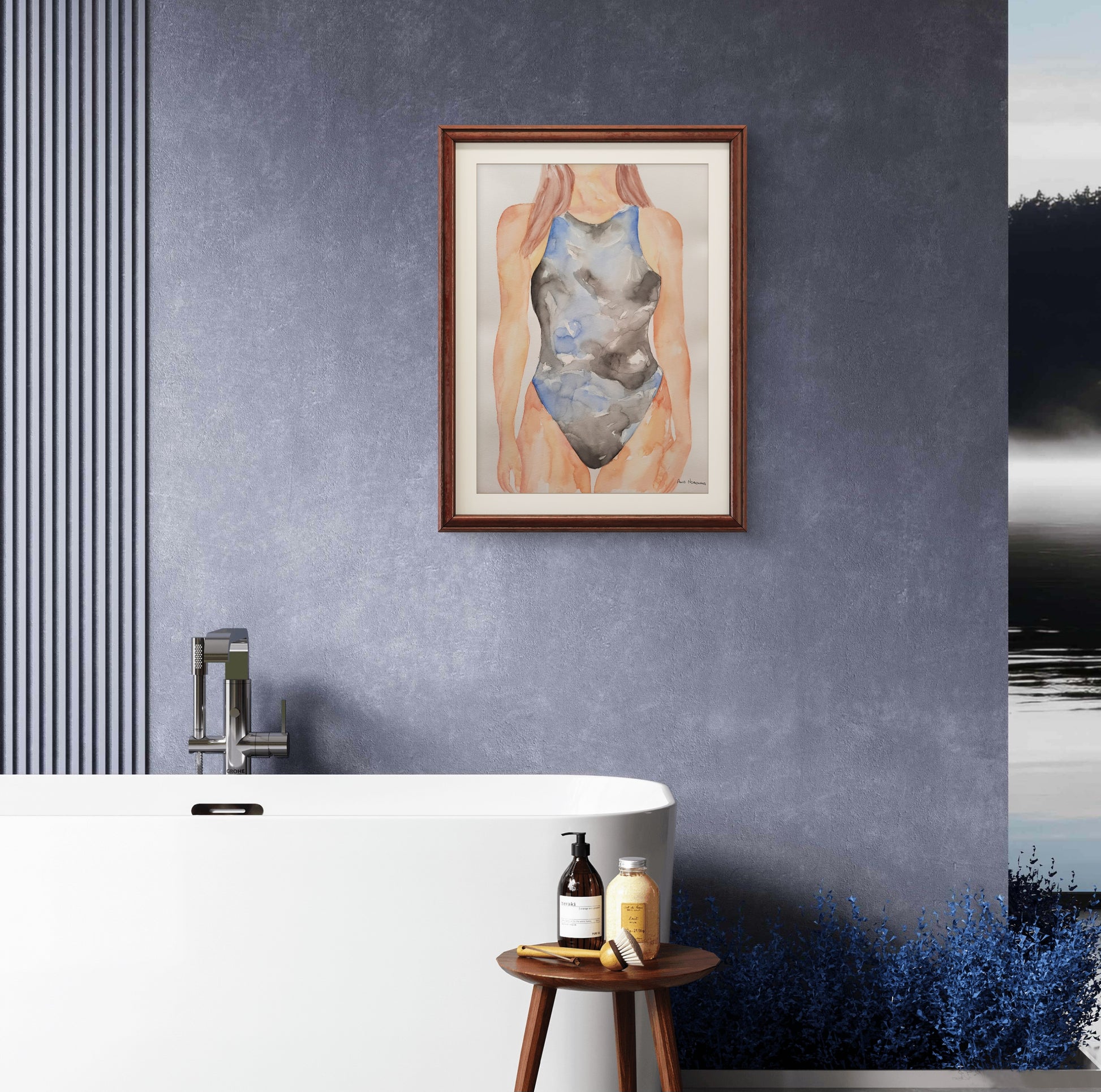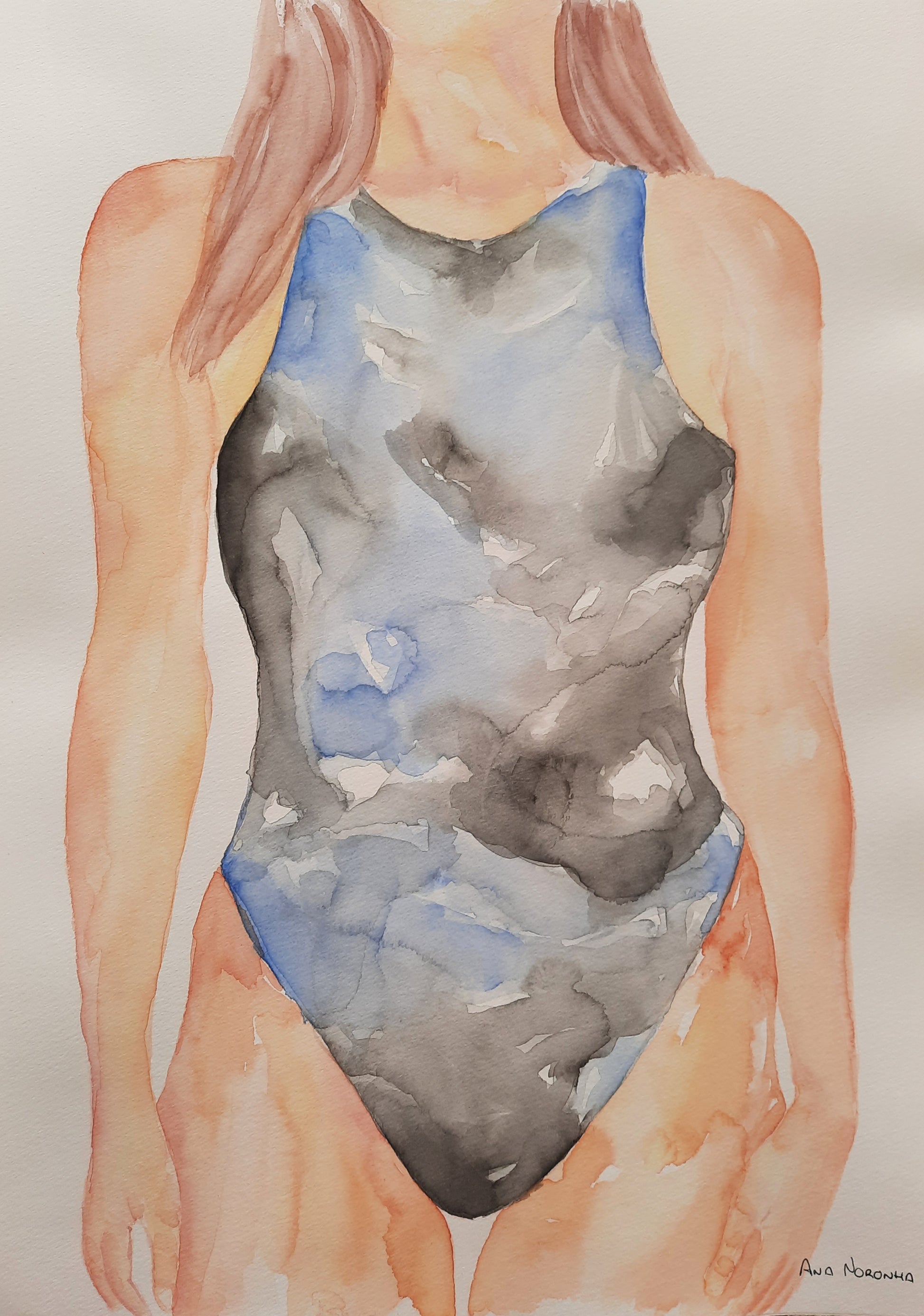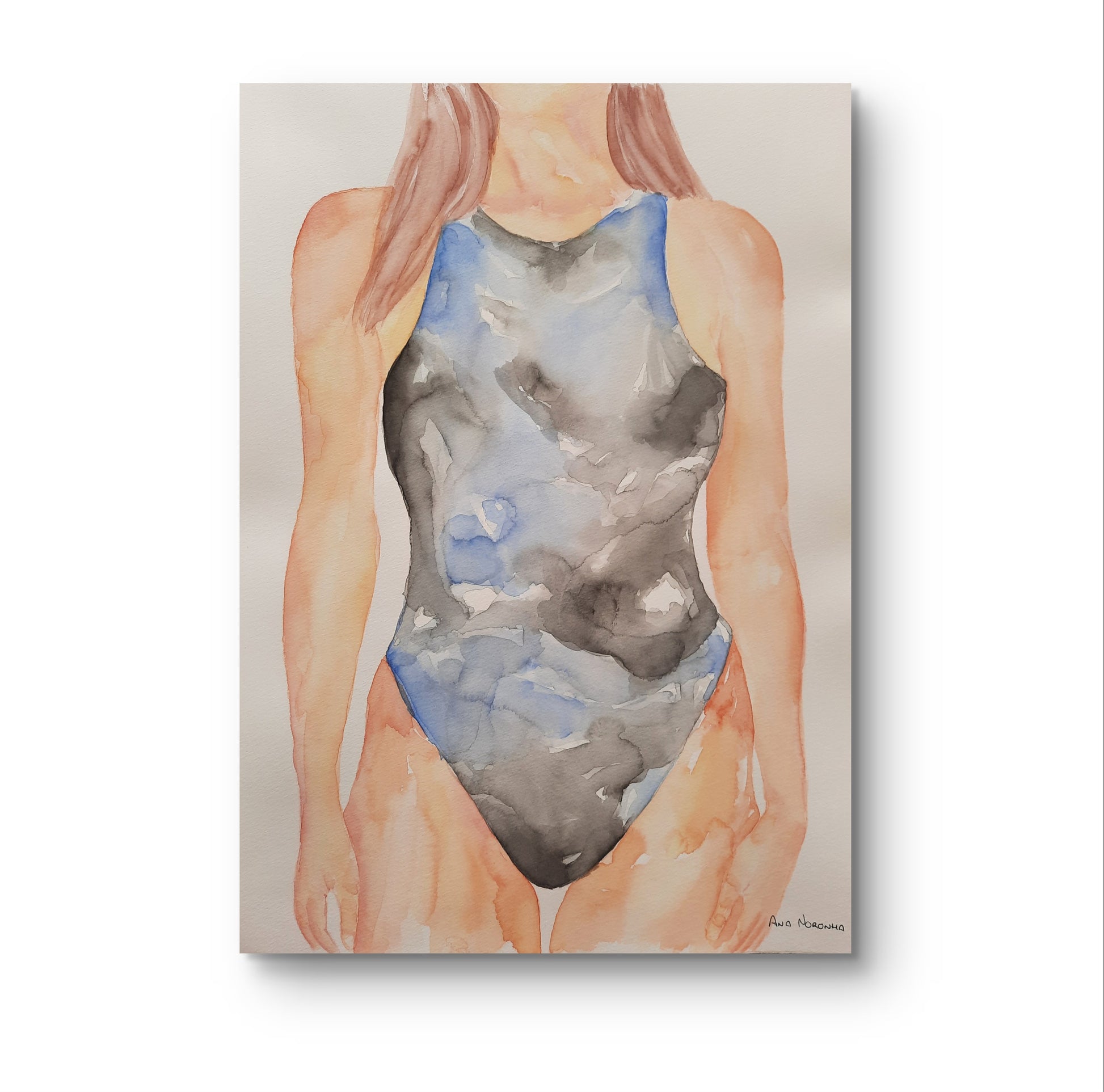 This watercolor painting beautifully captures the elegance of simplicity. The fluidity of the paint creates a dreamy, almost ethereal effect, blending soft skin tones with the abstract textures of the swimsuit. The interplay of blues, blacks, and grays suggests reflections of the sky and water, evoking a sense of calm and serenity. The lack of facial details allows the viewer to project their own emotions onto the piece, making it a deeply personal and evocative work.
