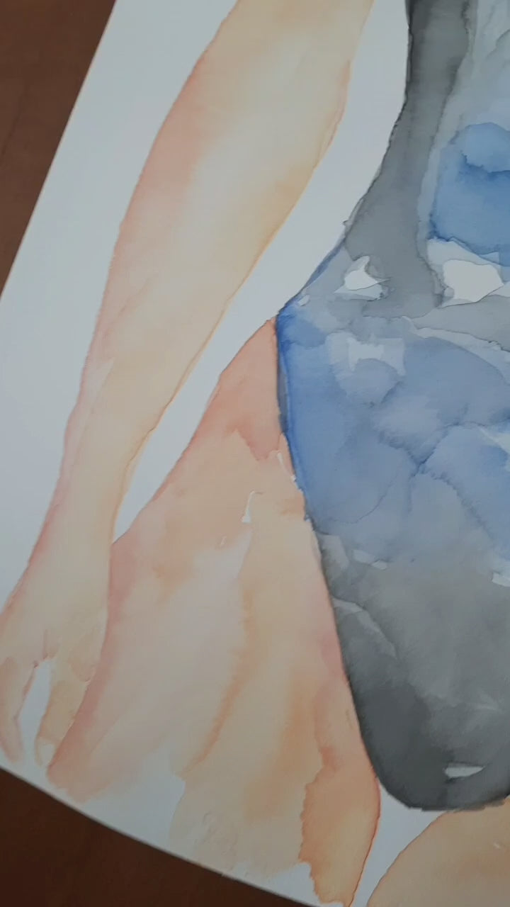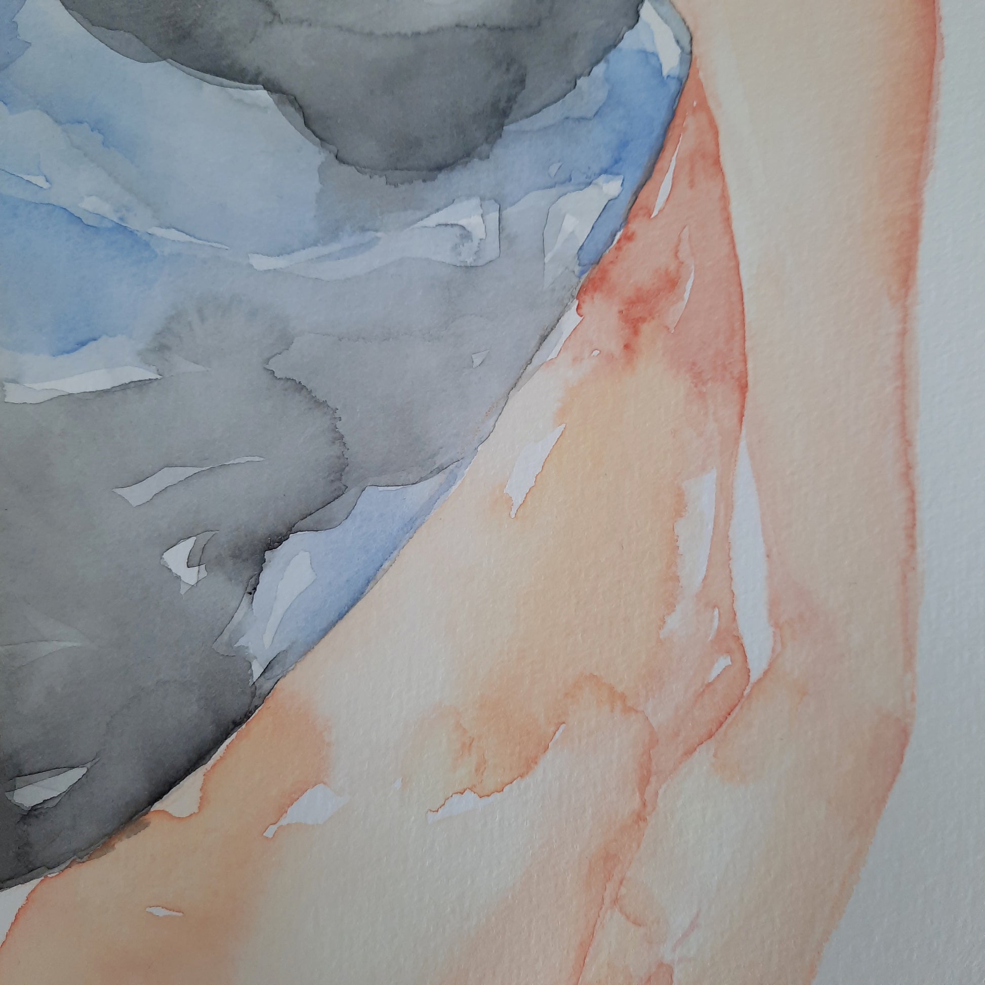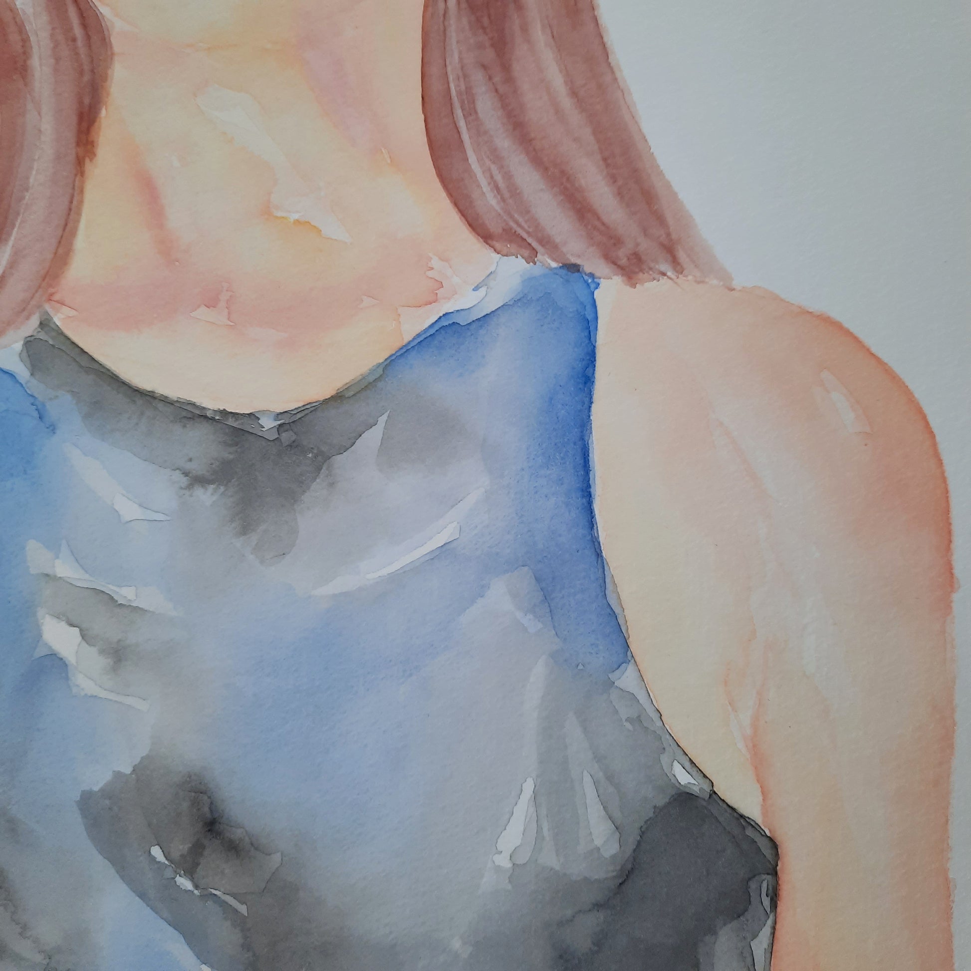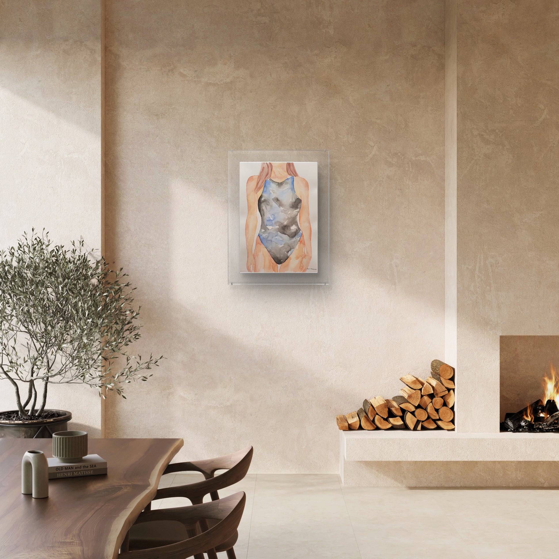 This watercolor painting beautifully captures the elegance of simplicity. The fluidity of the paint creates a dreamy, almost ethereal effect, blending soft skin tones with the abstract textures of the swimsuit. The interplay of blues, blacks, and grays suggests reflections of the sky and water, evoking a sense of calm and serenity. The lack of facial details allows the viewer to project their own emotions onto the piece, making it a deeply personal and evocative work.
