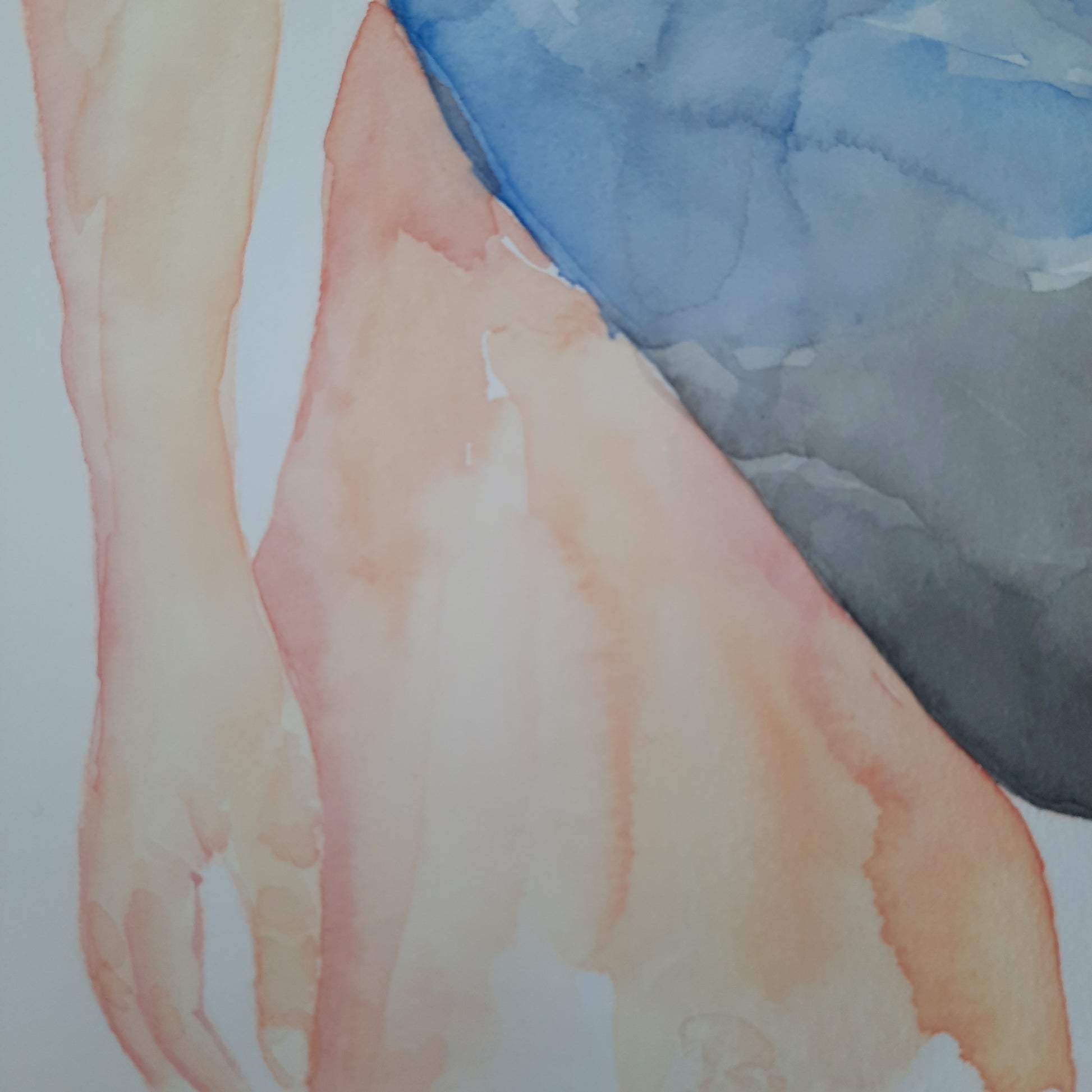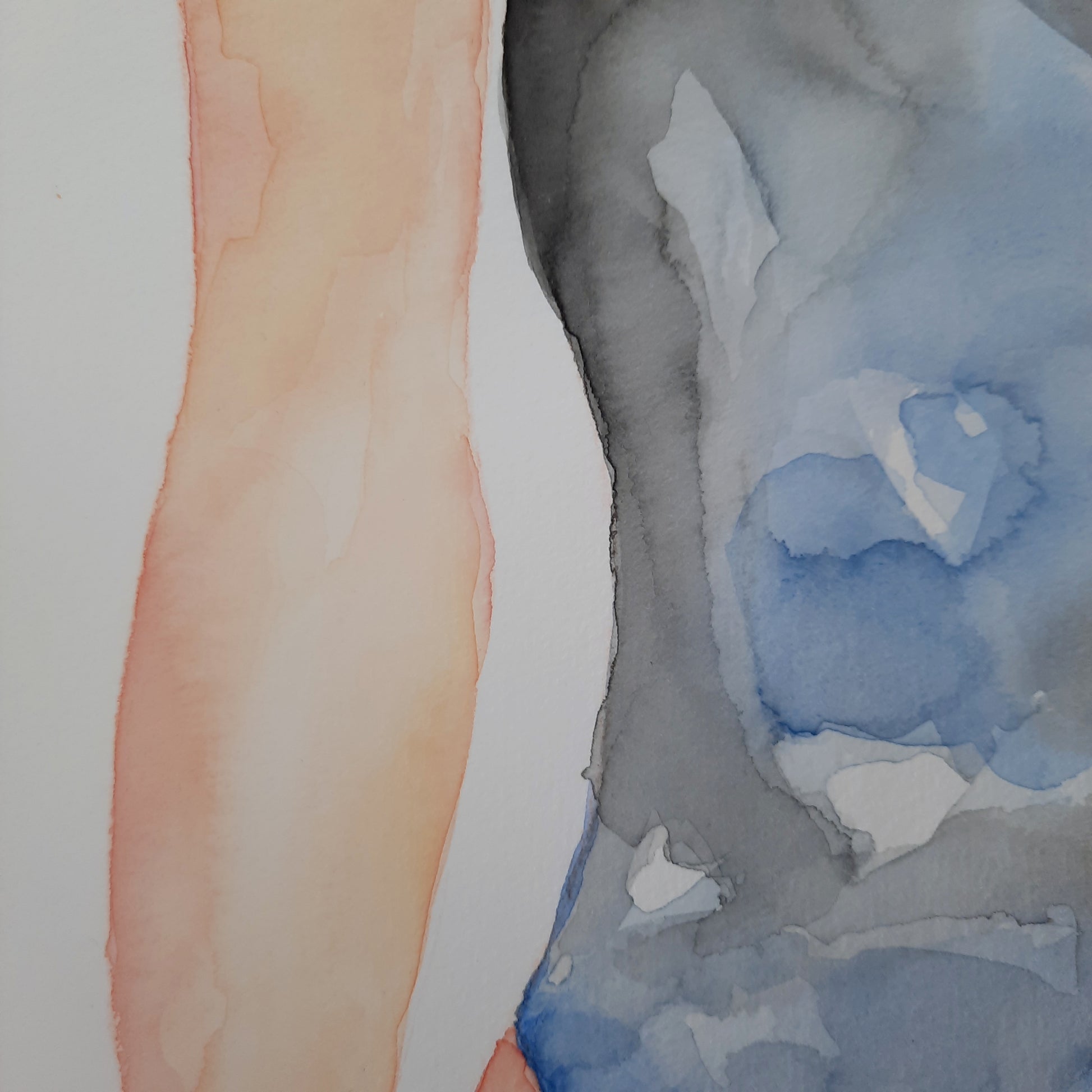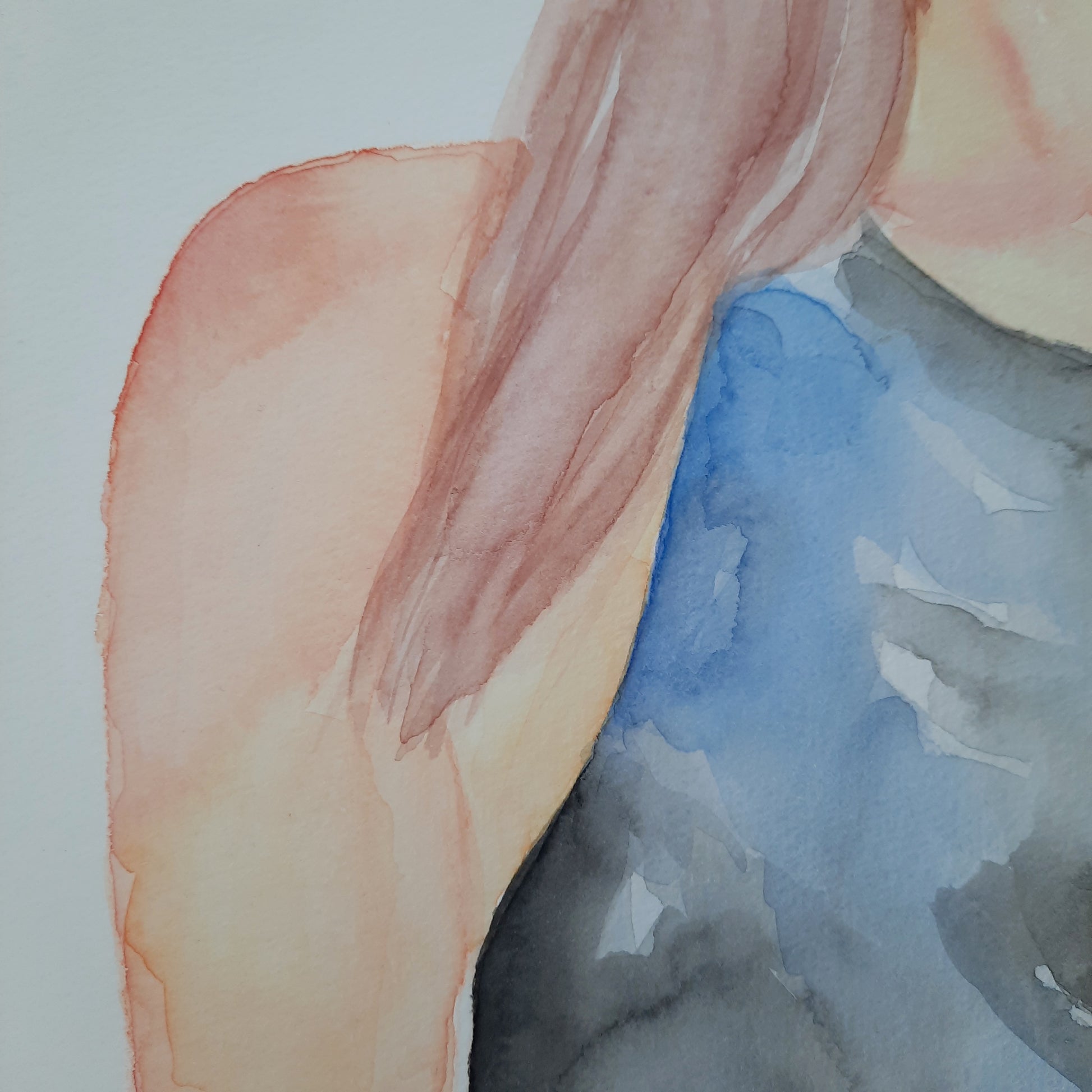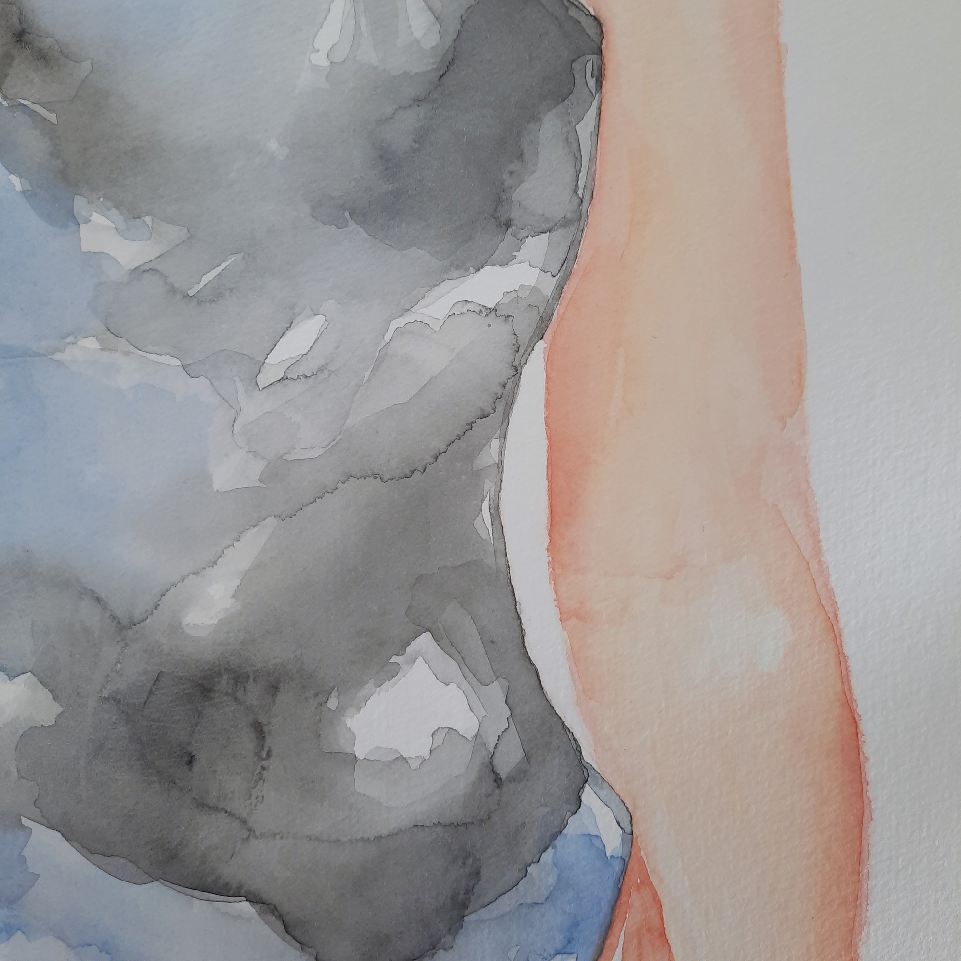 This watercolor painting beautifully captures the elegance of simplicity. The fluidity of the paint creates a dreamy, almost ethereal effect, blending soft skin tones with the abstract textures of the swimsuit. The interplay of blues, blacks, and grays suggests reflections of the sky and water, evoking a sense of calm and serenity. The lack of facial details allows the viewer to project their own emotions onto the piece, making it a deeply personal and evocative work.