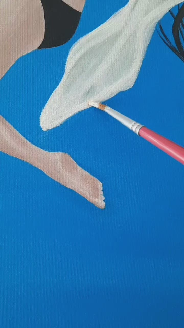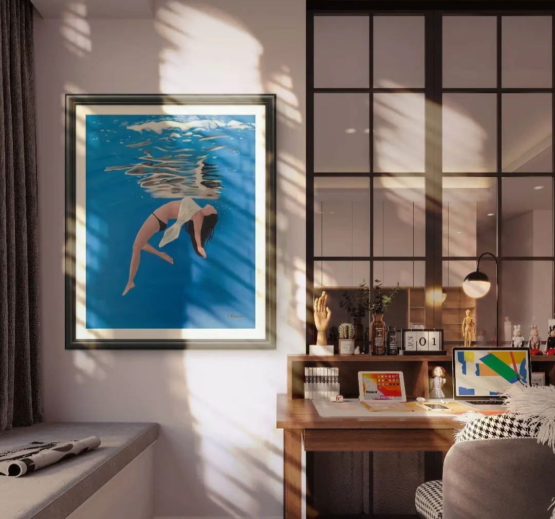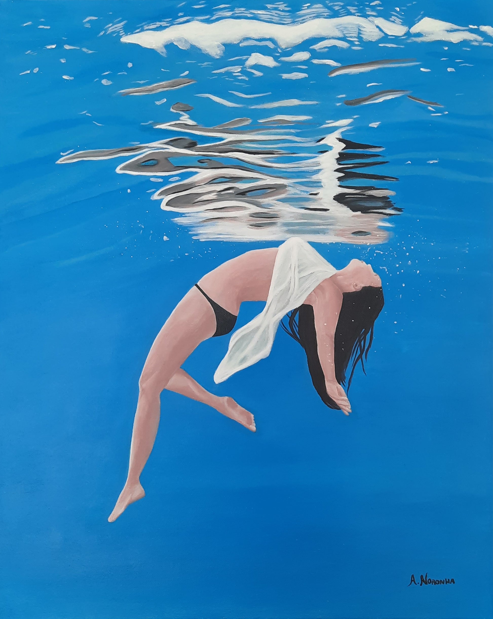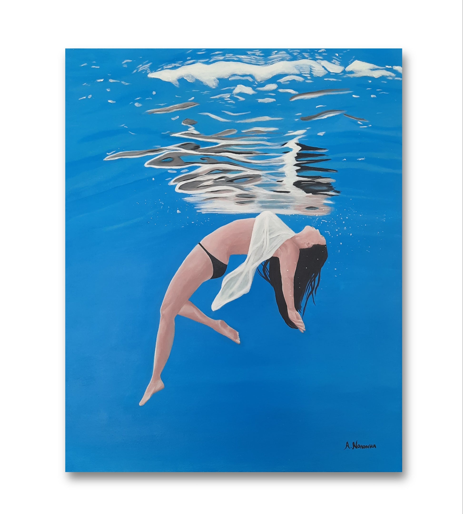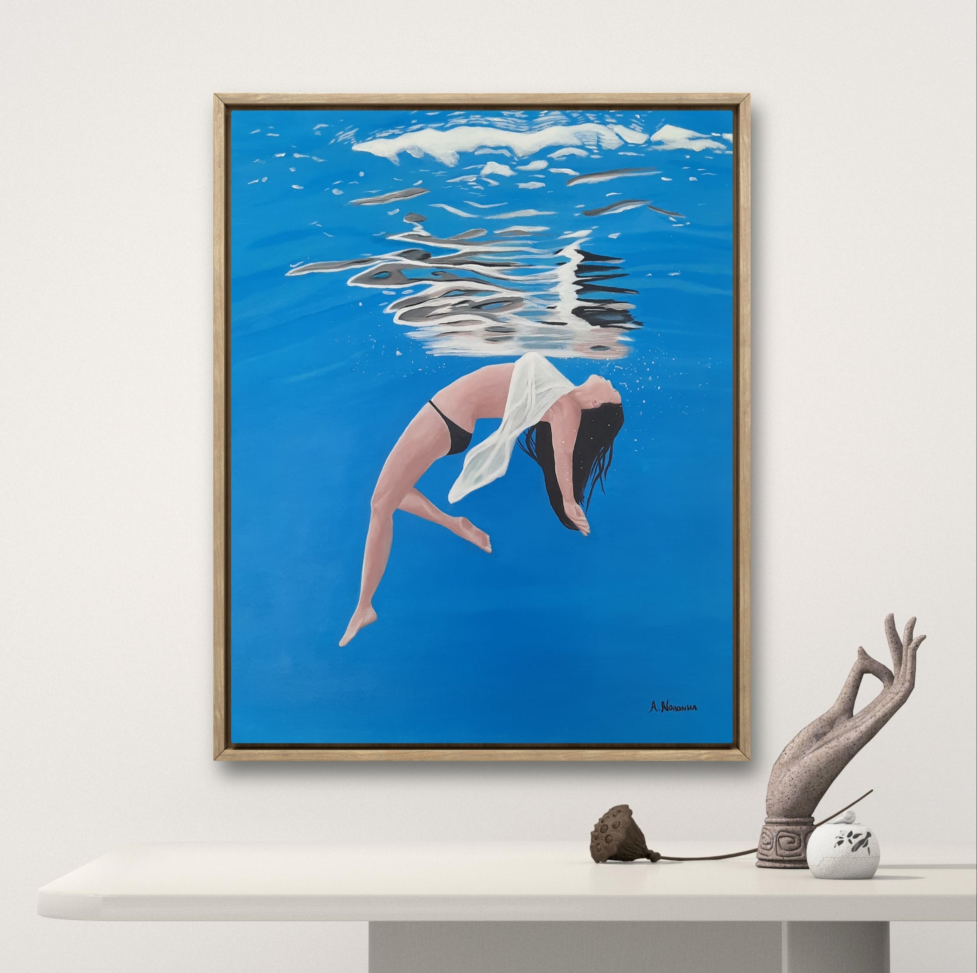 This piece, "It's Called Peace," beautifully captures the serenity of floating in the sea, fully immersed in the soothing embrace of water. The dominant blue tones evoke a sense of tranquility, reflection, and surrender.