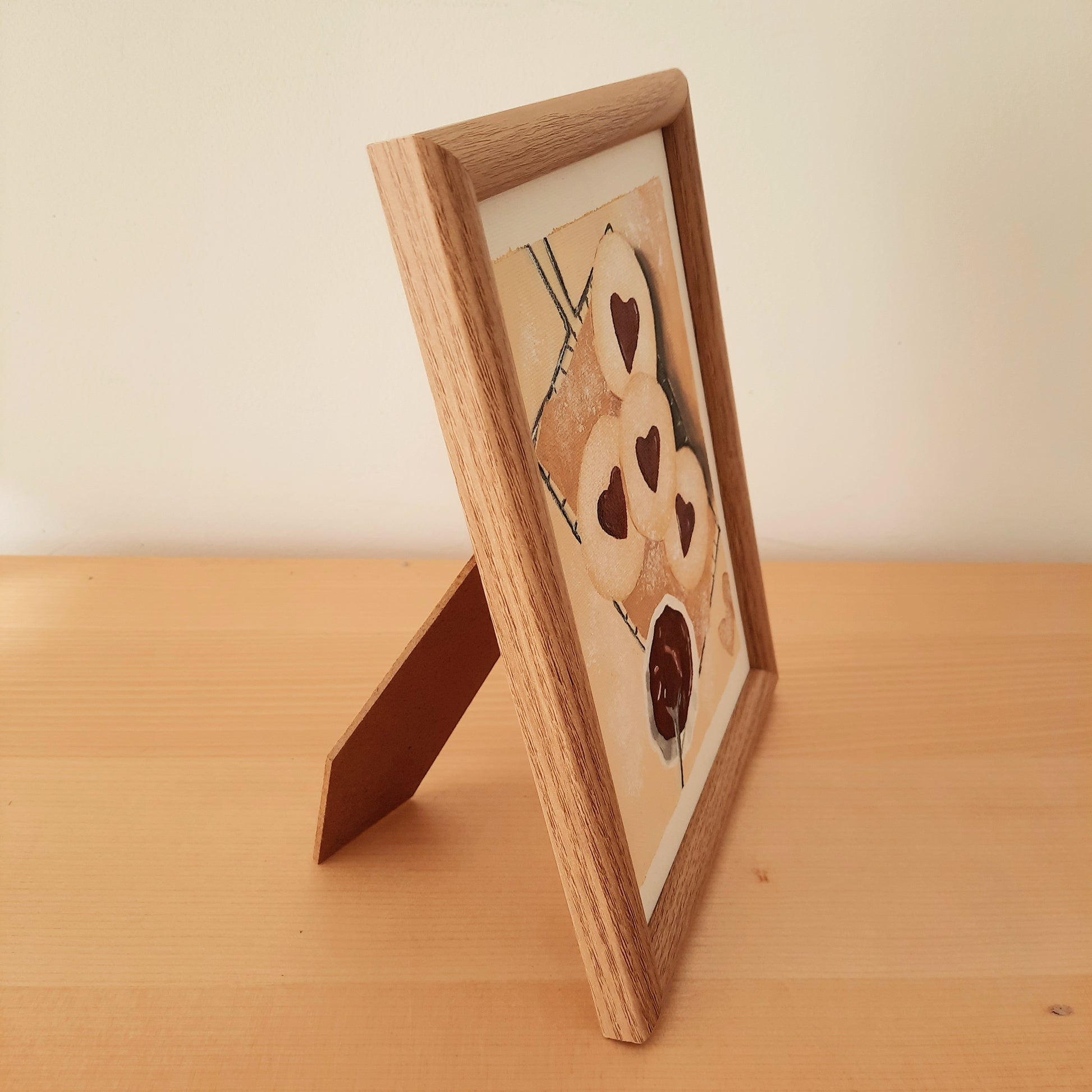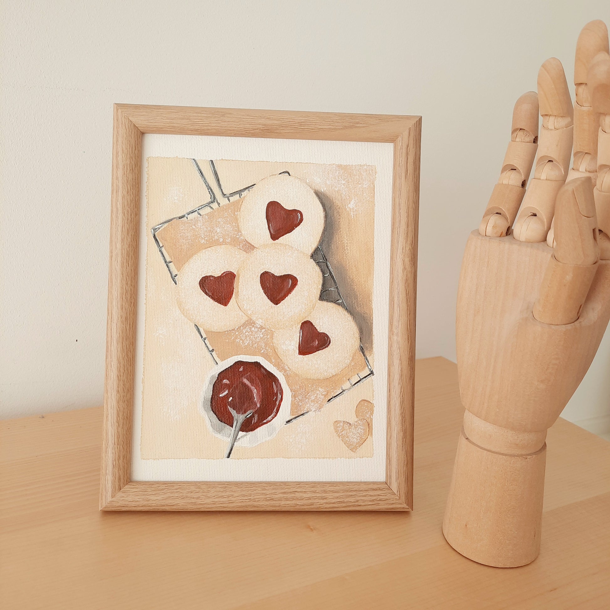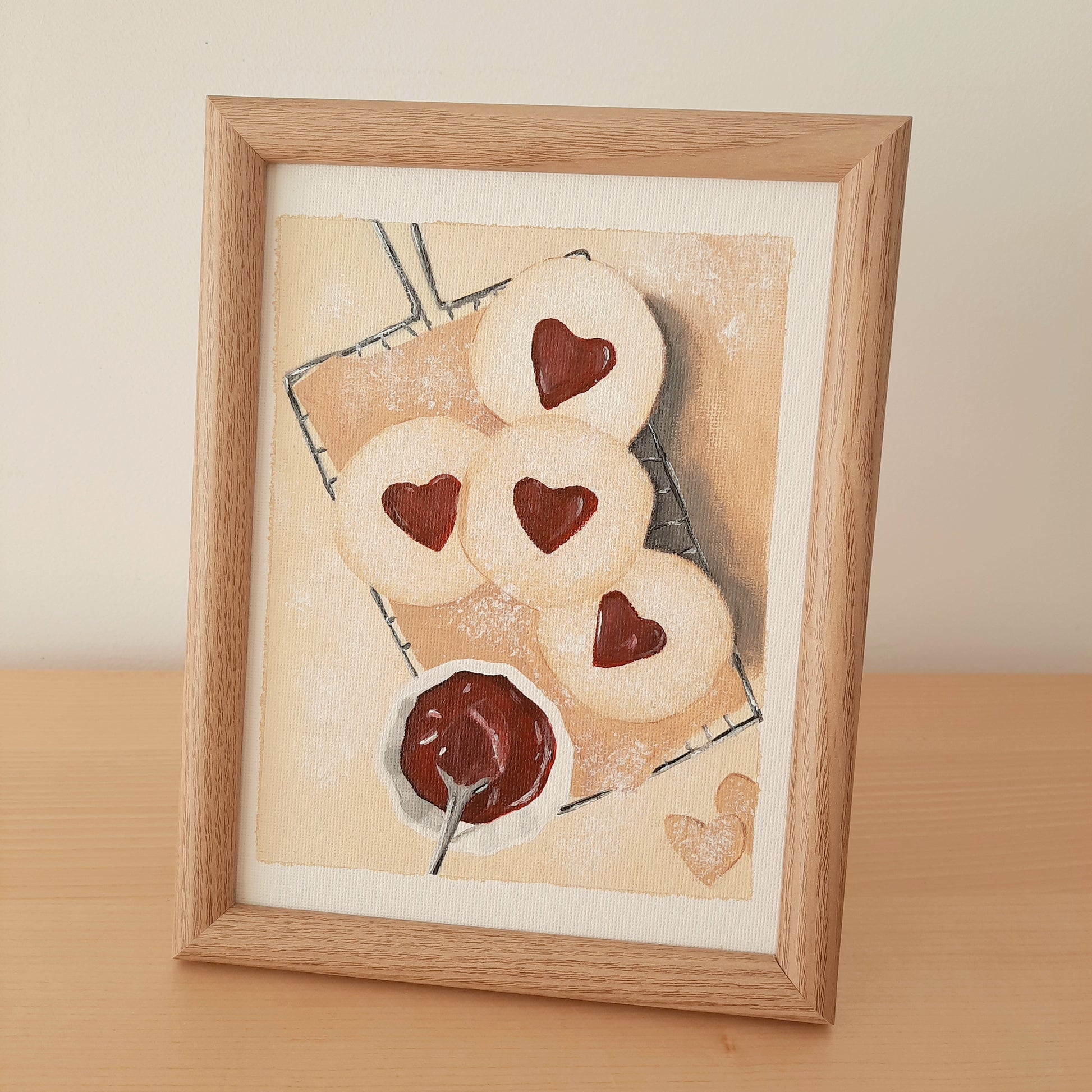 "Love in Every Bite" is a charming original acrylic painting that captures the warmth of homemade heart-shaped cookies with strawberry jam. This delightful piece brings a sense of coziness and nostalgia, perfect for any space that celebrates love and sweetness.