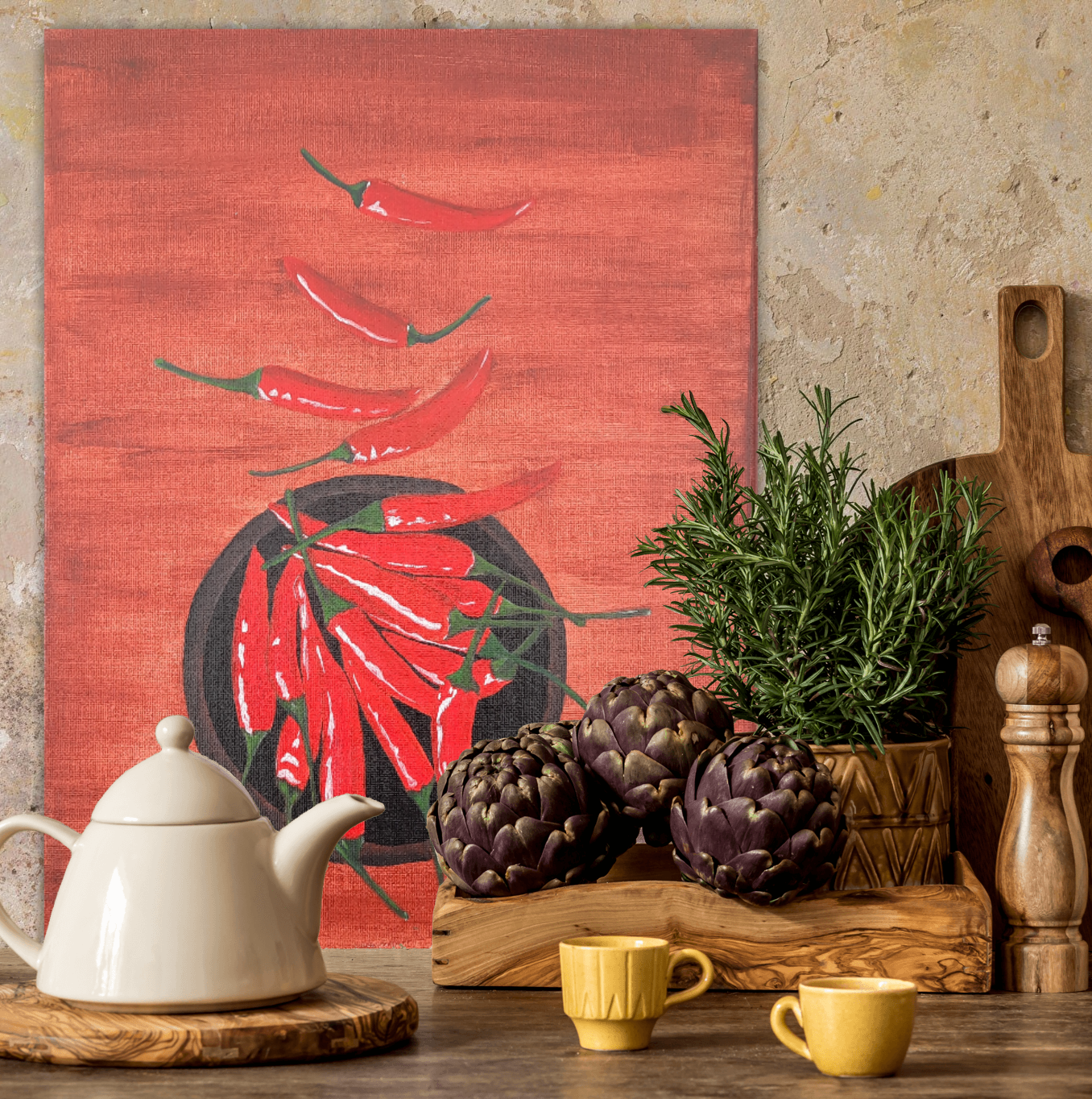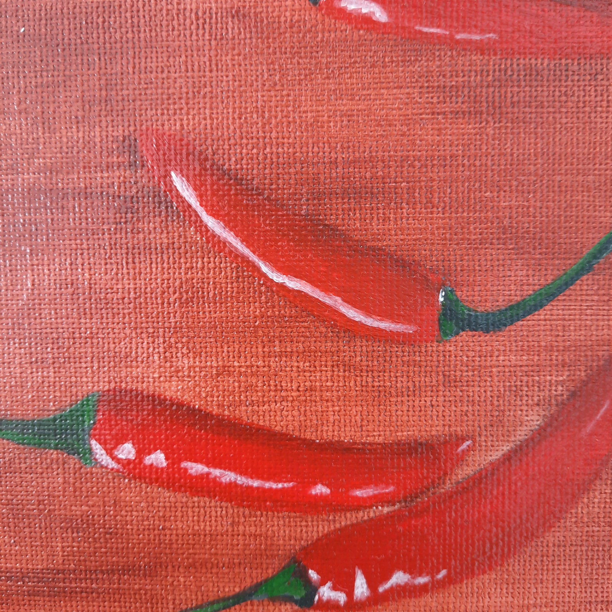 A vibrant acrylic painting on canvas, capturing the warmth and rustic charm of fresh red peppers arranged on a plate, with additional peppers scattered against a wood-like background. The bold colors and textured details bring energy and life to any space, making this artwork a striking focal point.