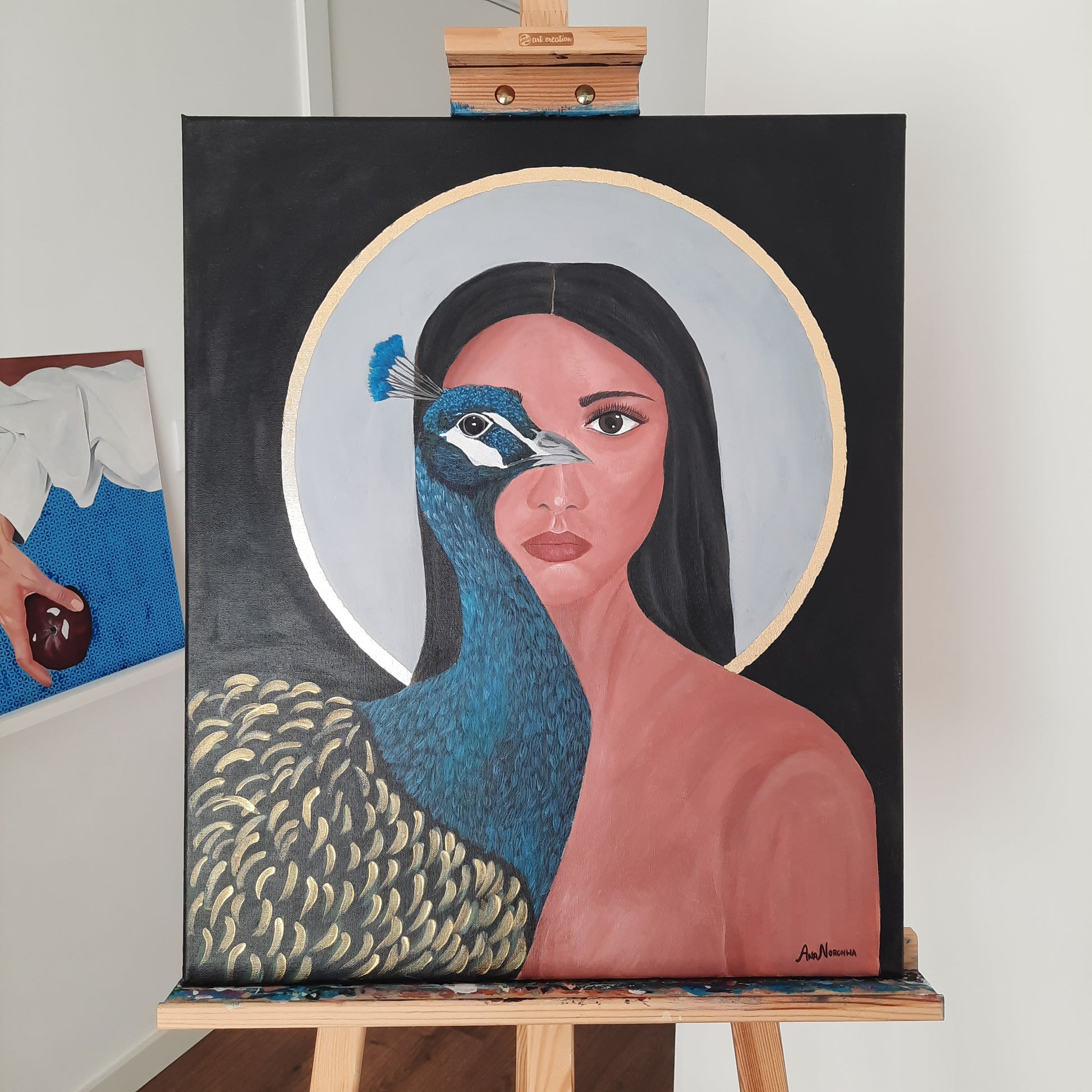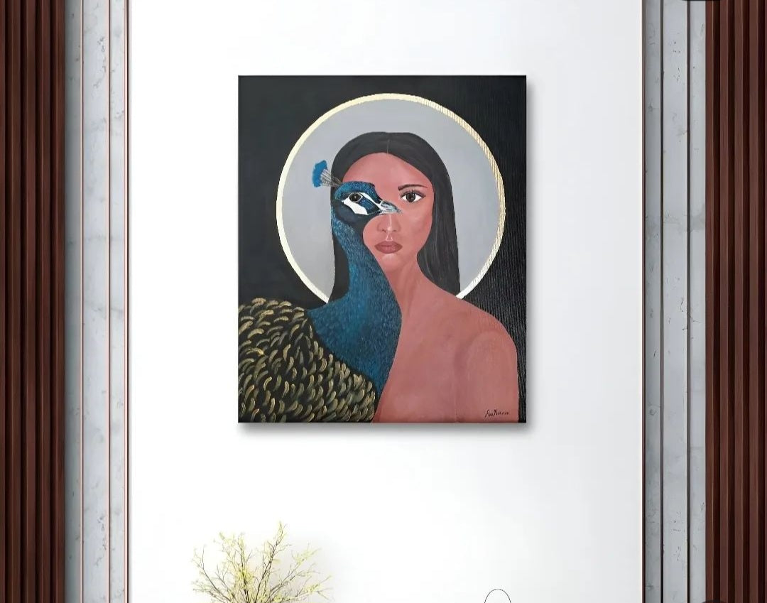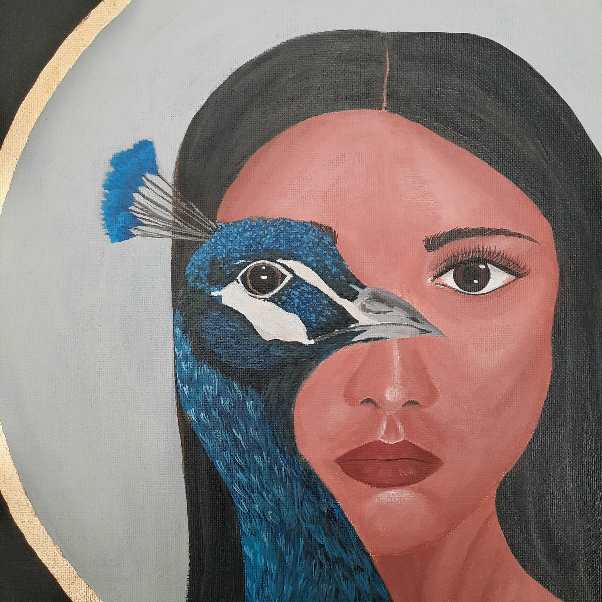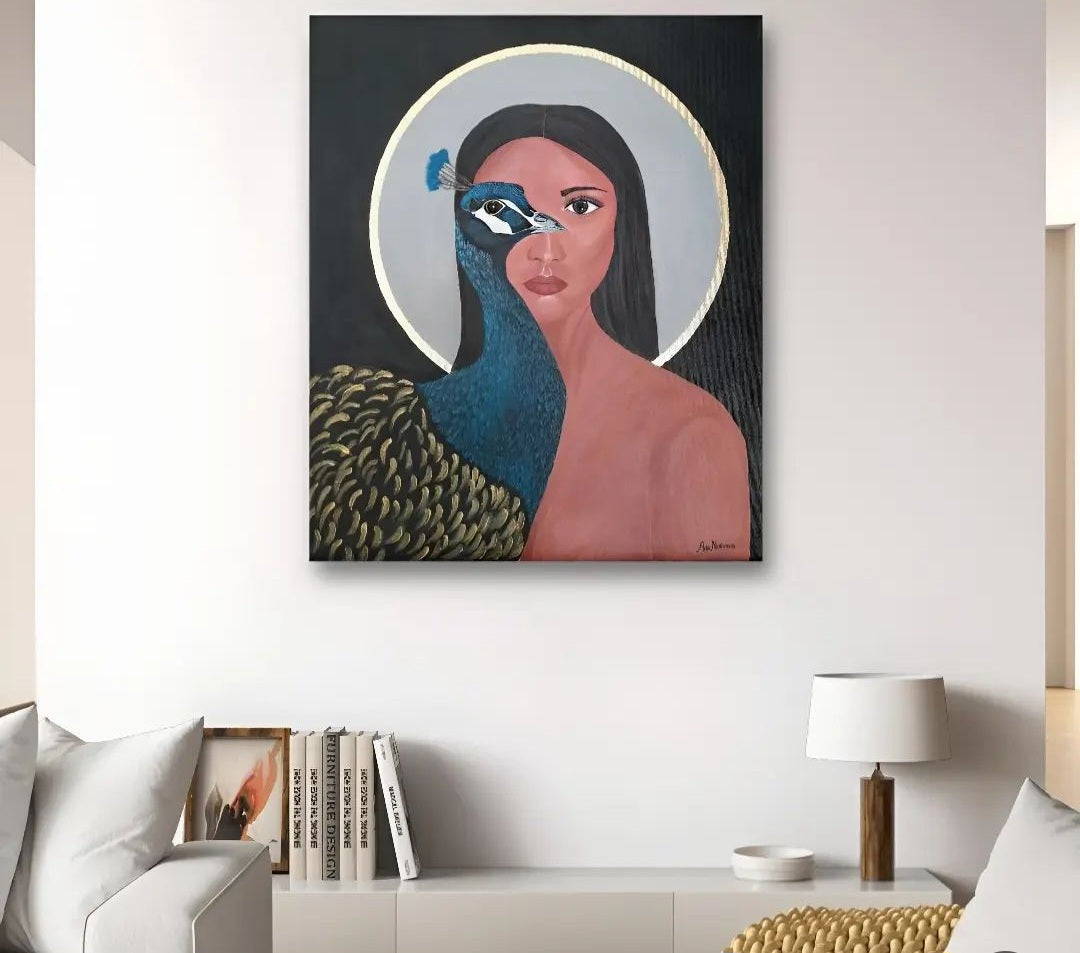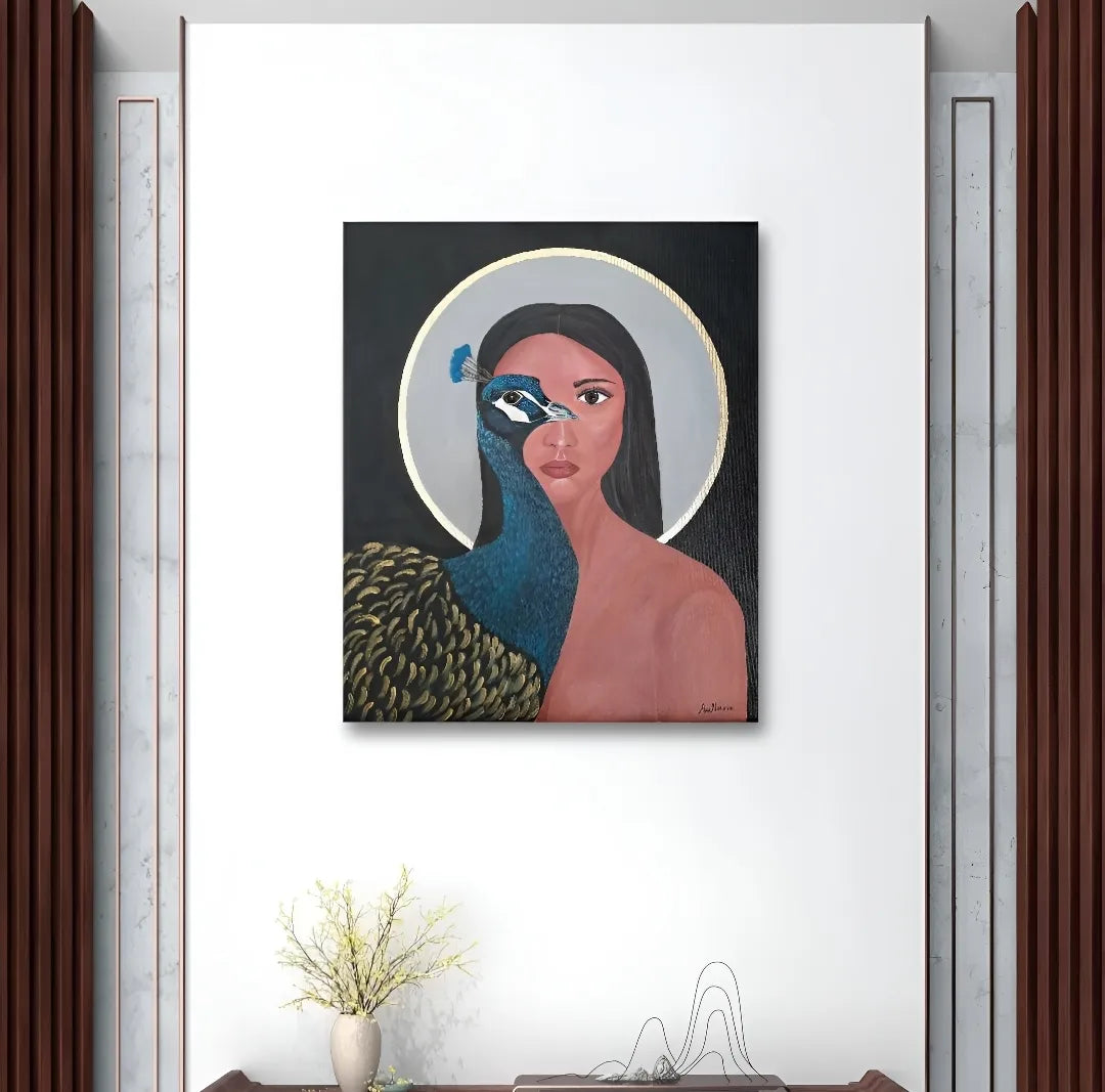 "Rebirth" is a unique acrylic painting on canvas, symbolizing transformation, self-discovery, and personal evolution. The fusion of human and peacock elements represents inner strength, beauty, and the courage to embrace change. The golden halo accentuates the sacred nature of renewal, evoking a sense of enlightenment and rebirth.