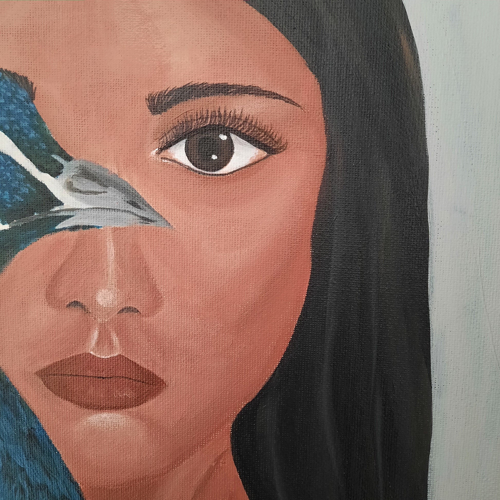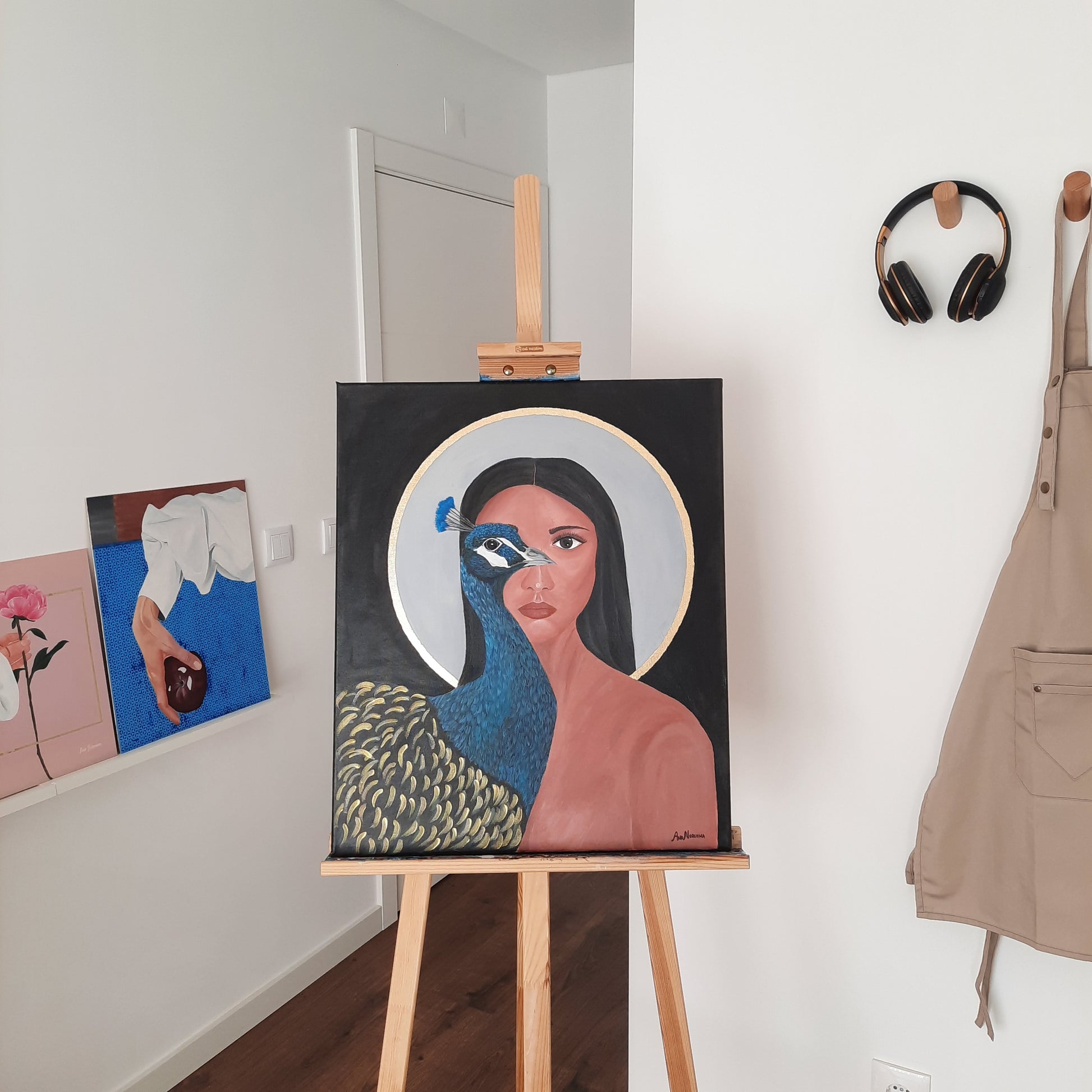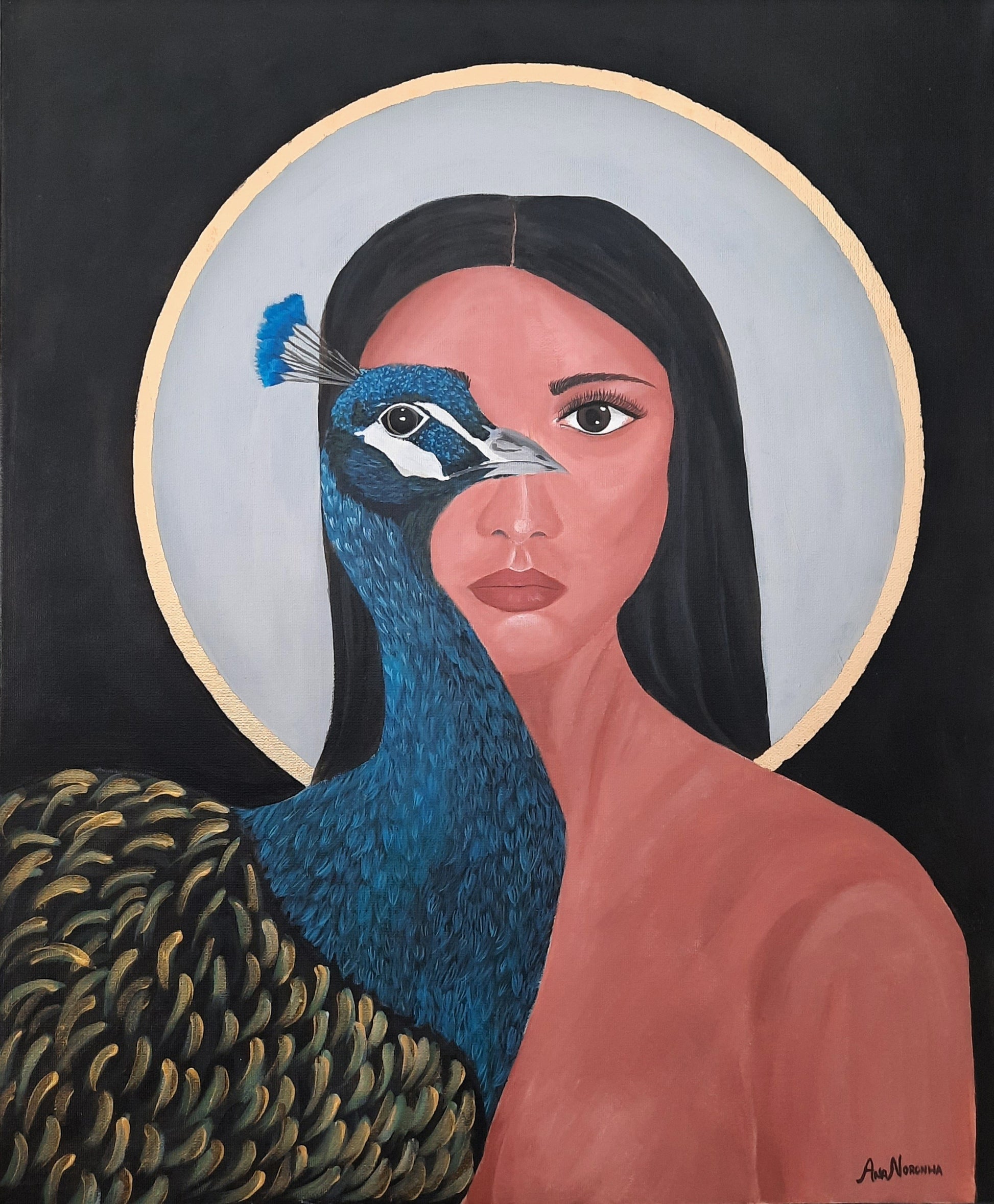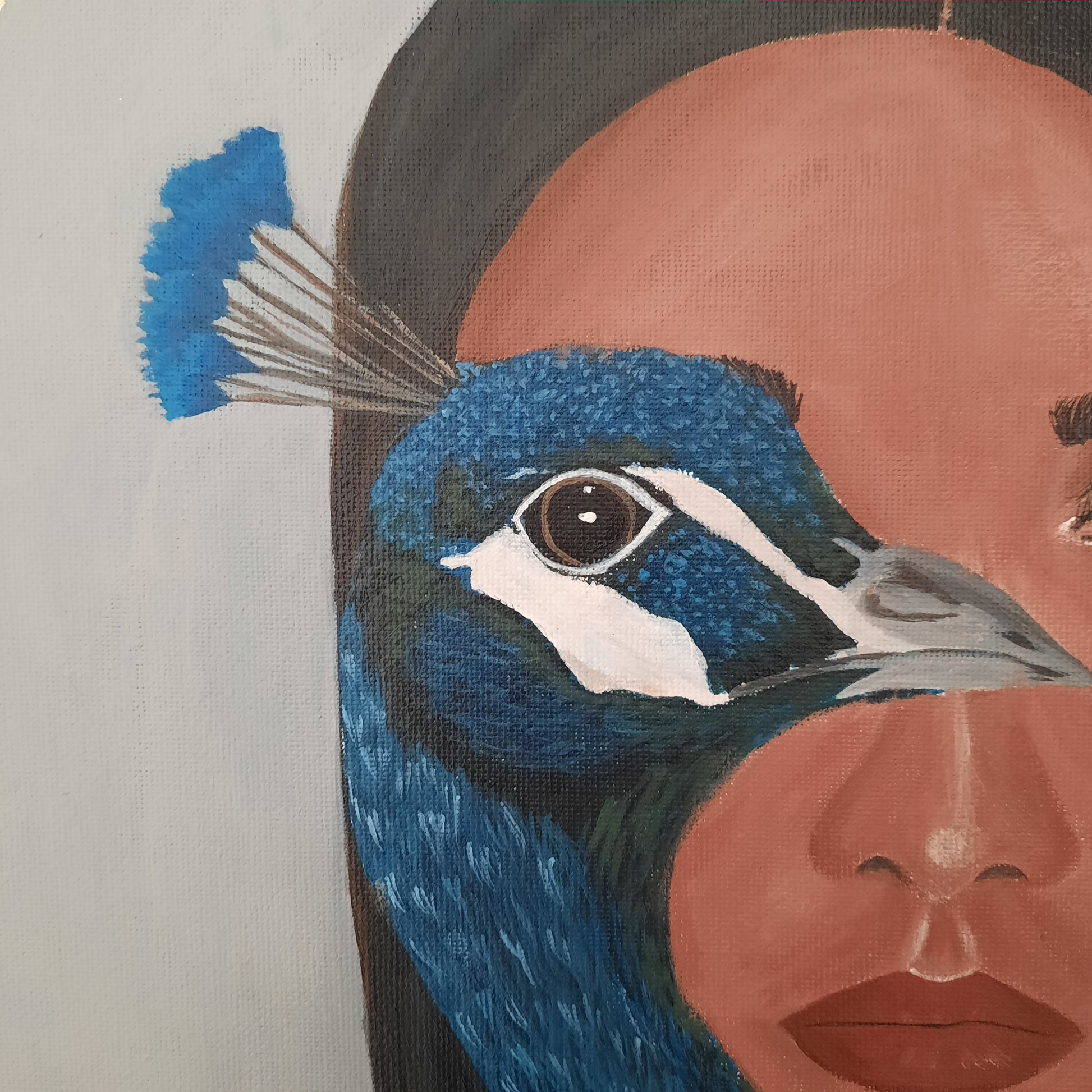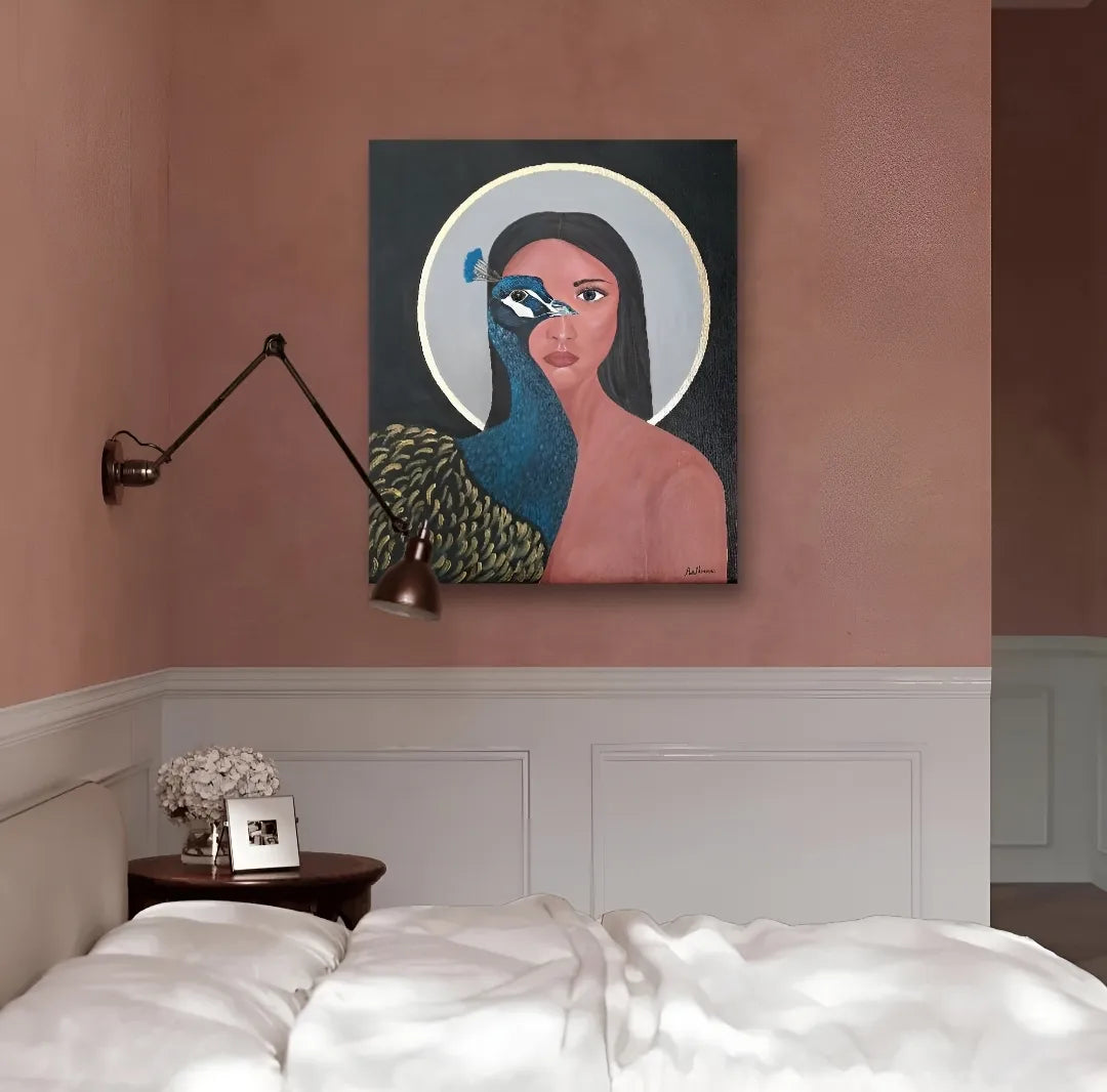 "Rebirth" is a unique acrylic painting on canvas, symbolizing transformation, self-discovery, and personal evolution. The fusion of human and peacock elements represents inner strength, beauty, and the courage to embrace change. The golden halo accentuates the sacred nature of renewal, evoking a sense of enlightenment and rebirth.