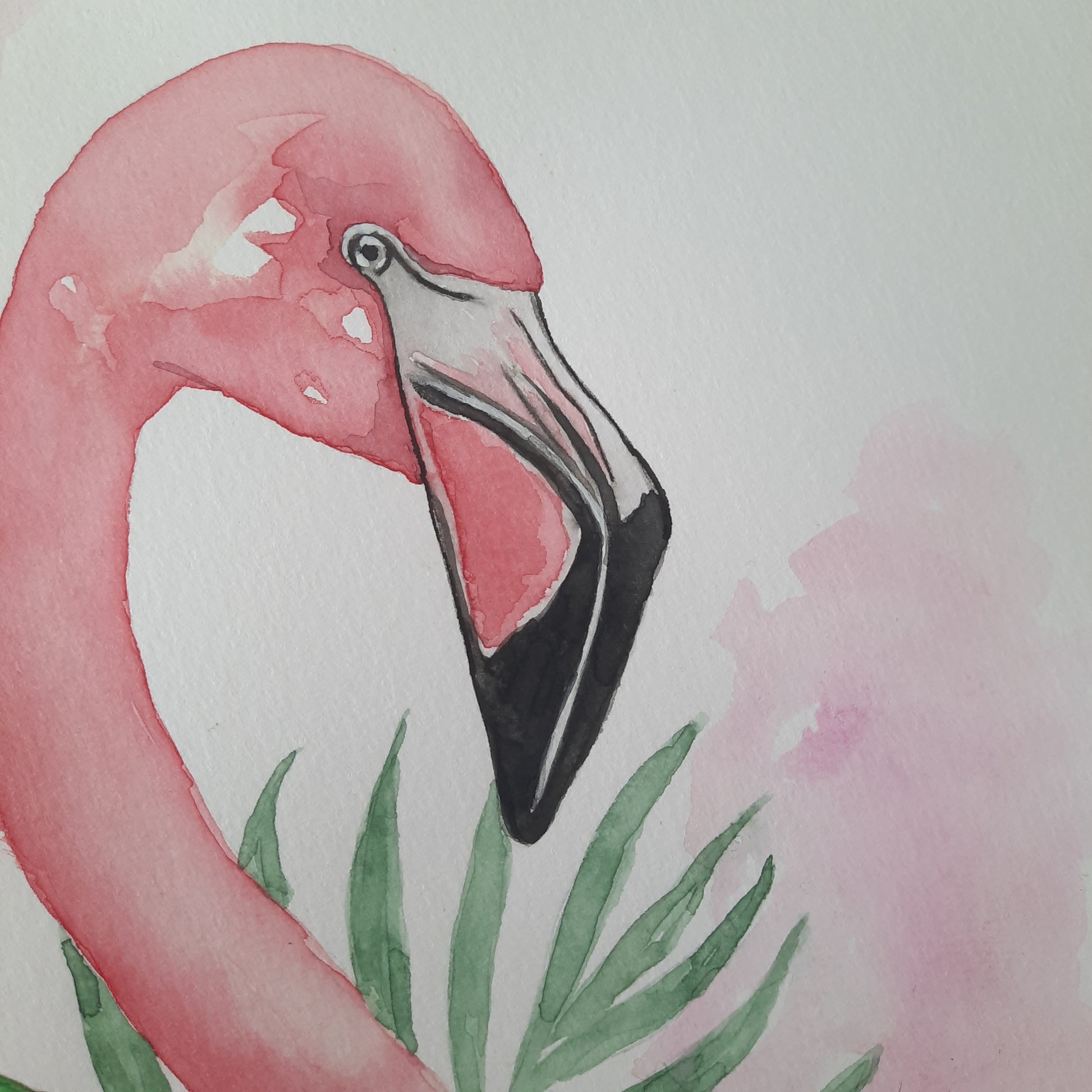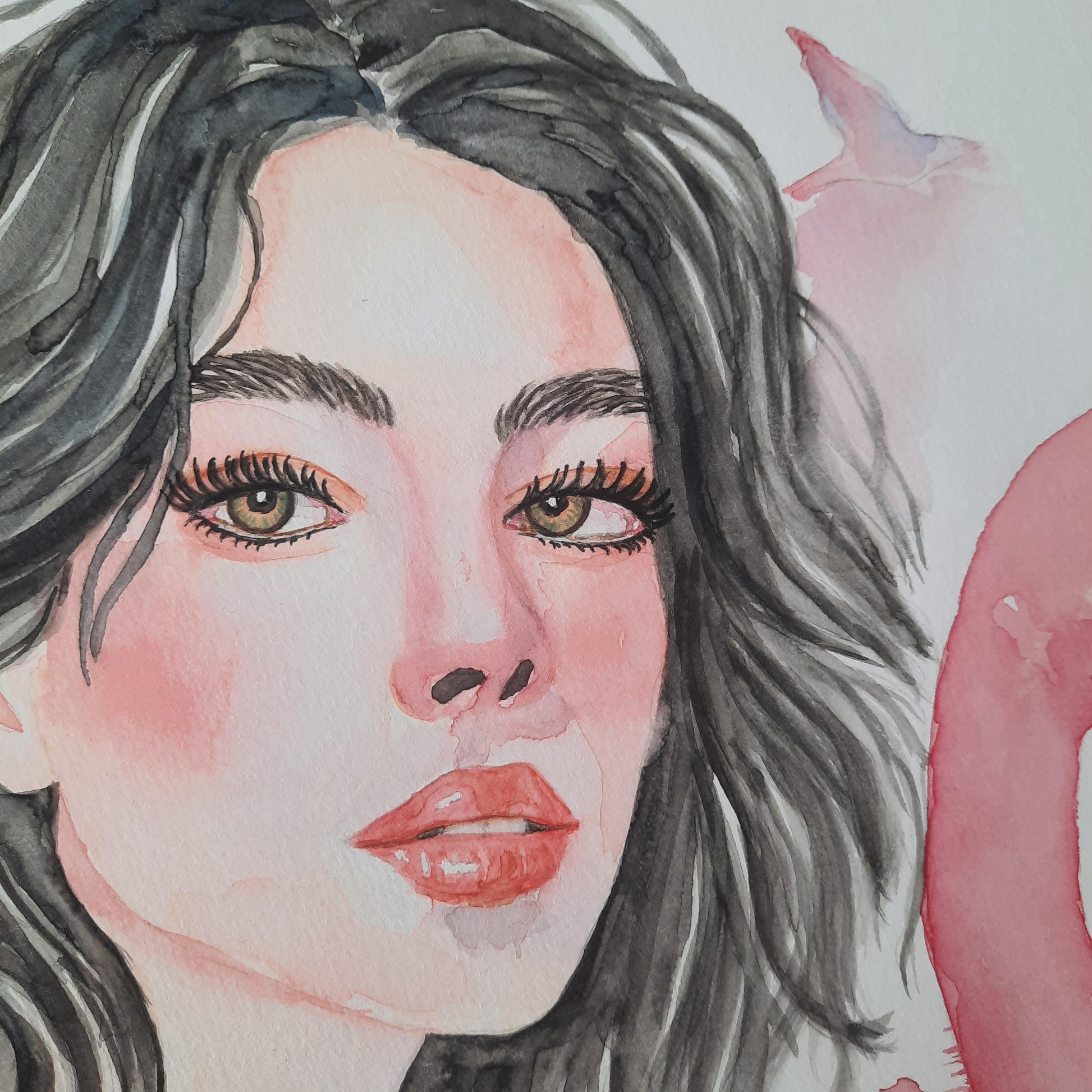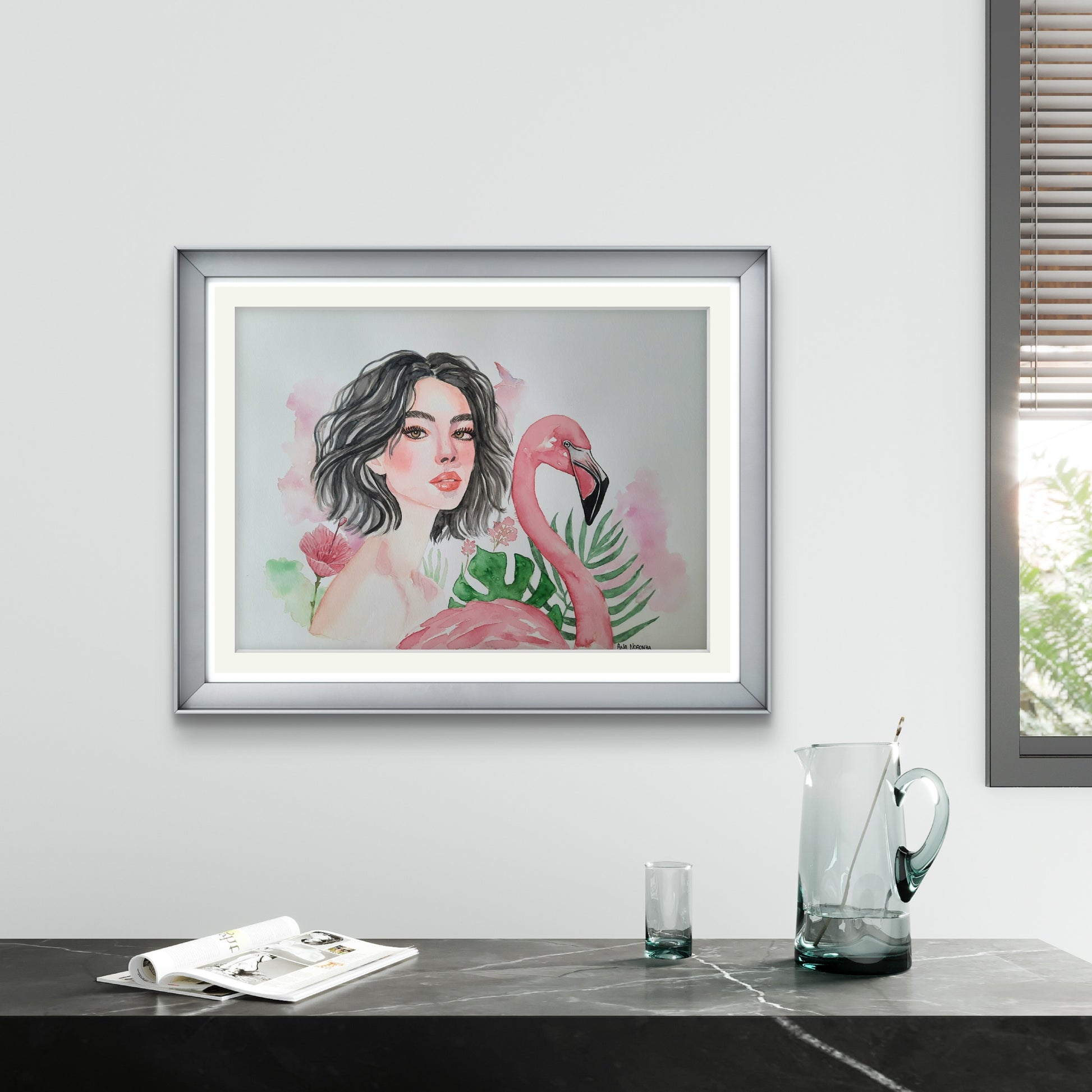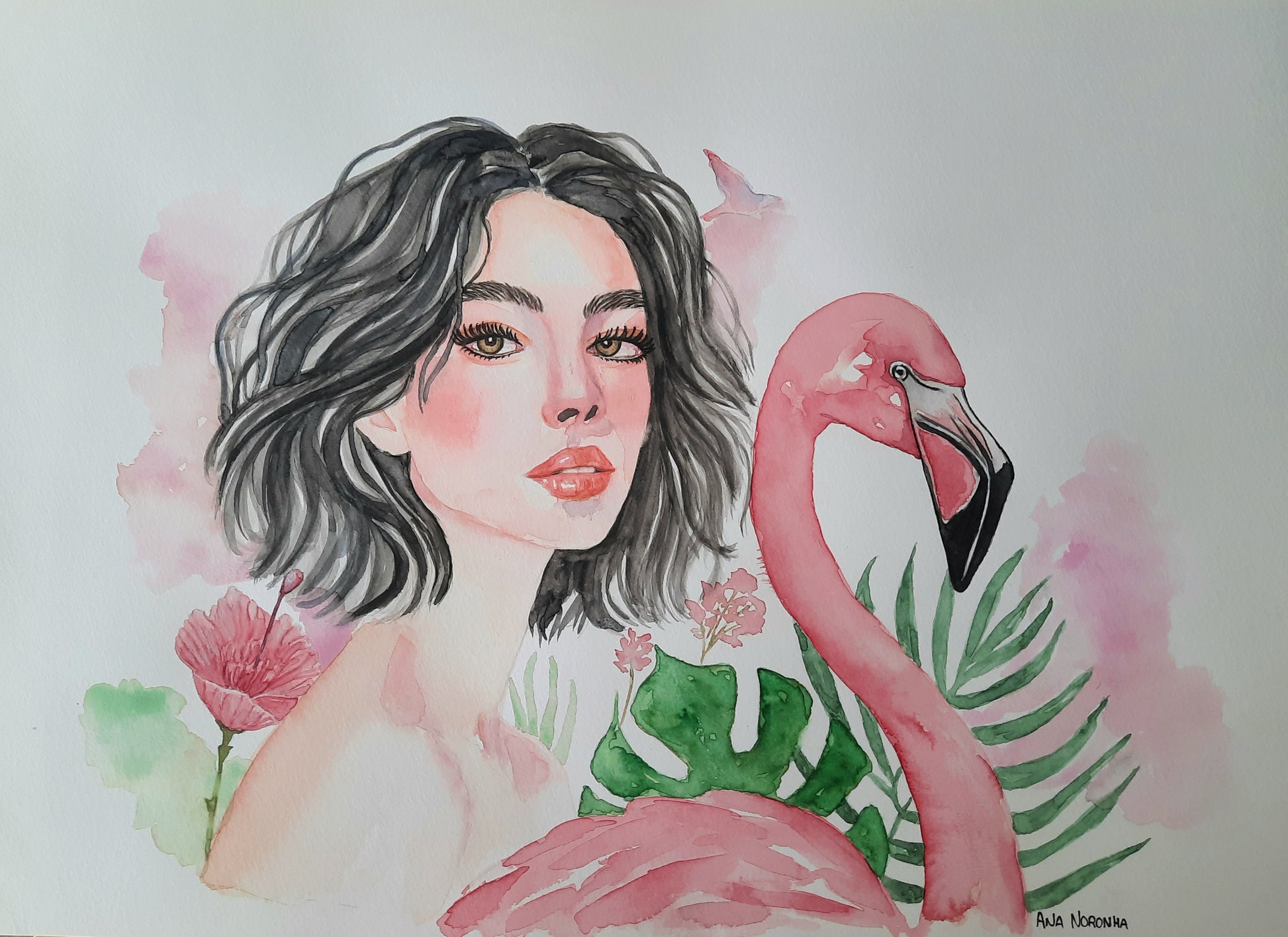 Delicacy and strength coexist in this watercolor, where femininity intertwines with the wild essence of nature. The intense gaze, soft hues, and the serene presence of the flamingo create an atmosphere of mystery and freedom. A reminder that beauty lies in duality—gentleness embracing boldness, nature expressing itself with elegance.