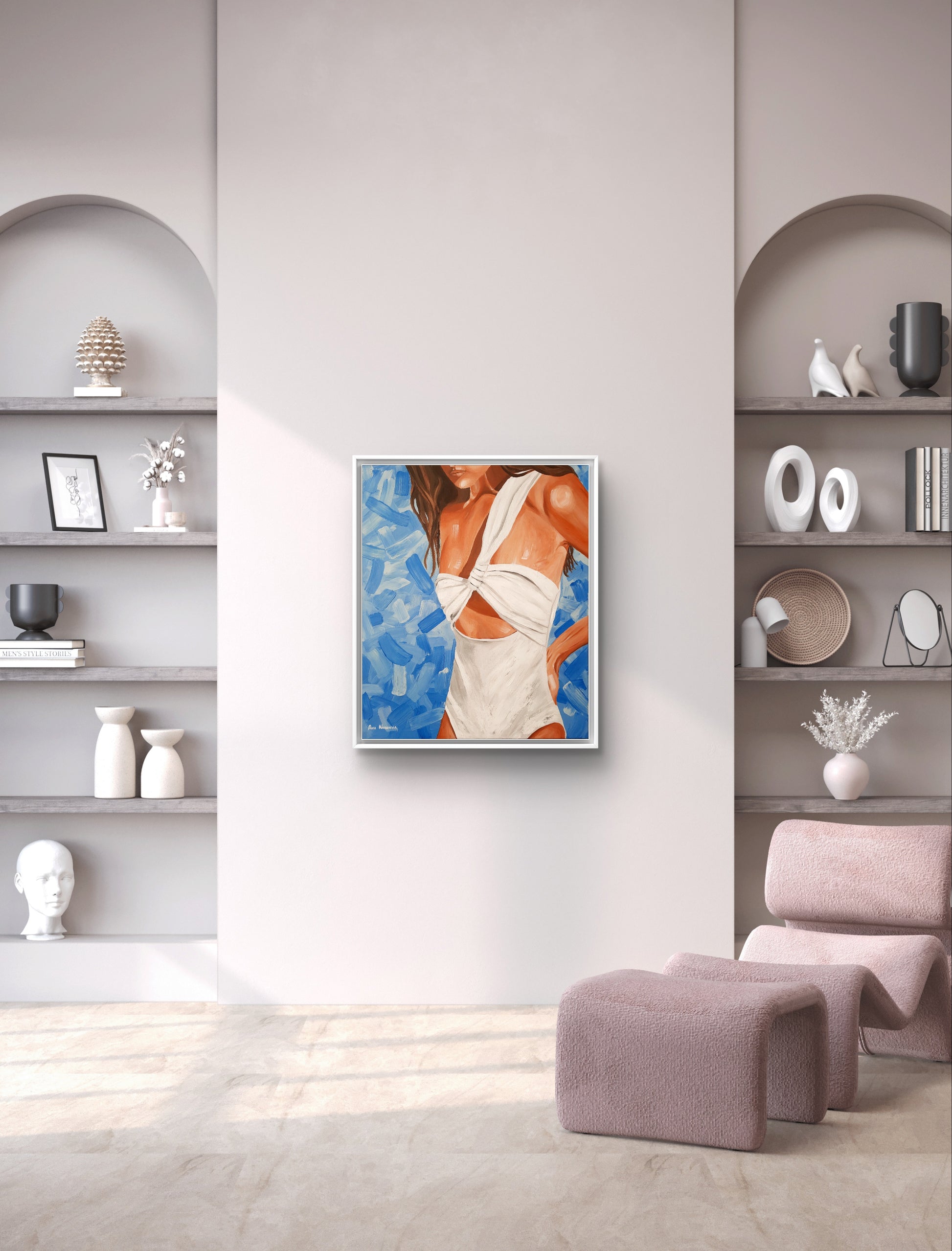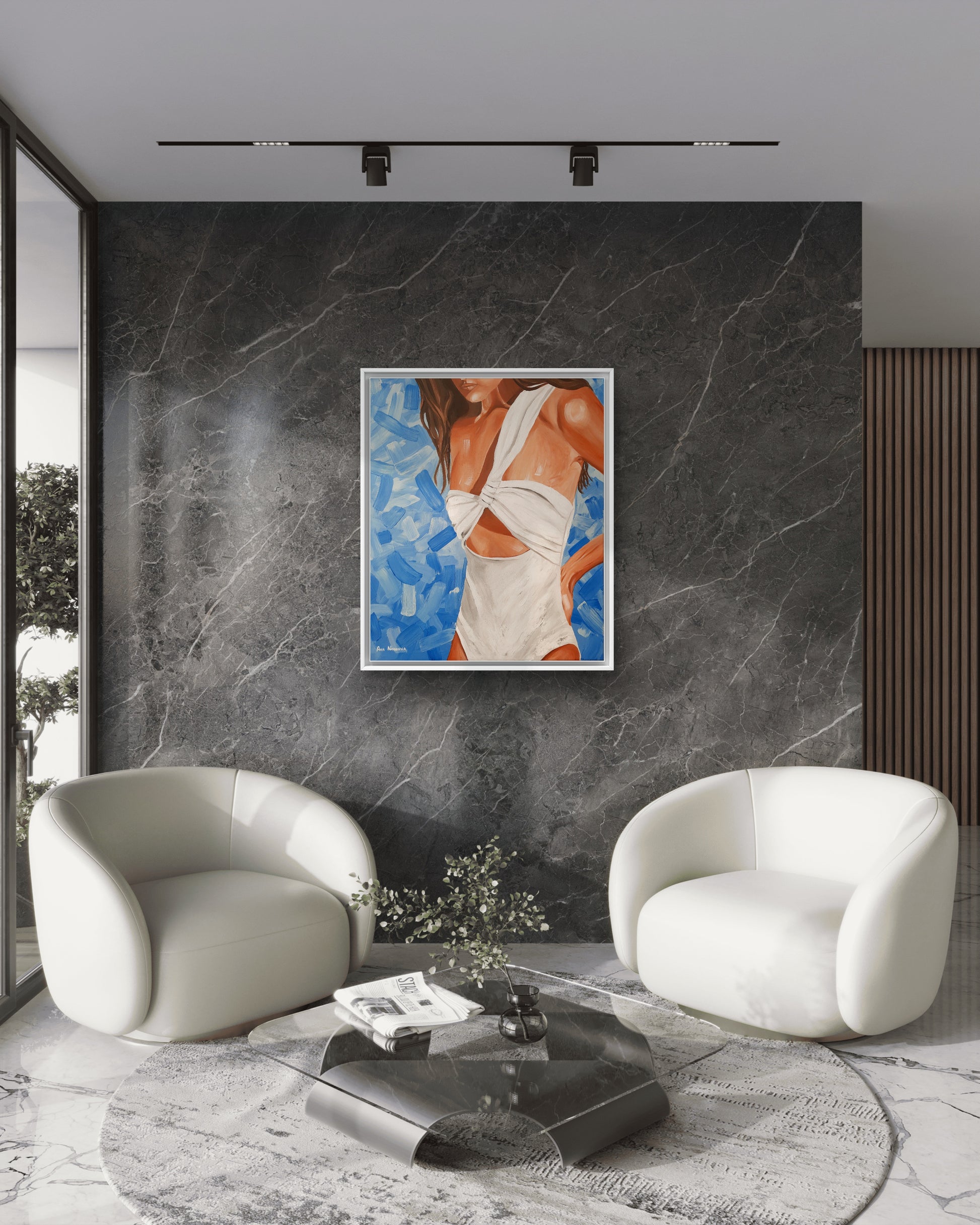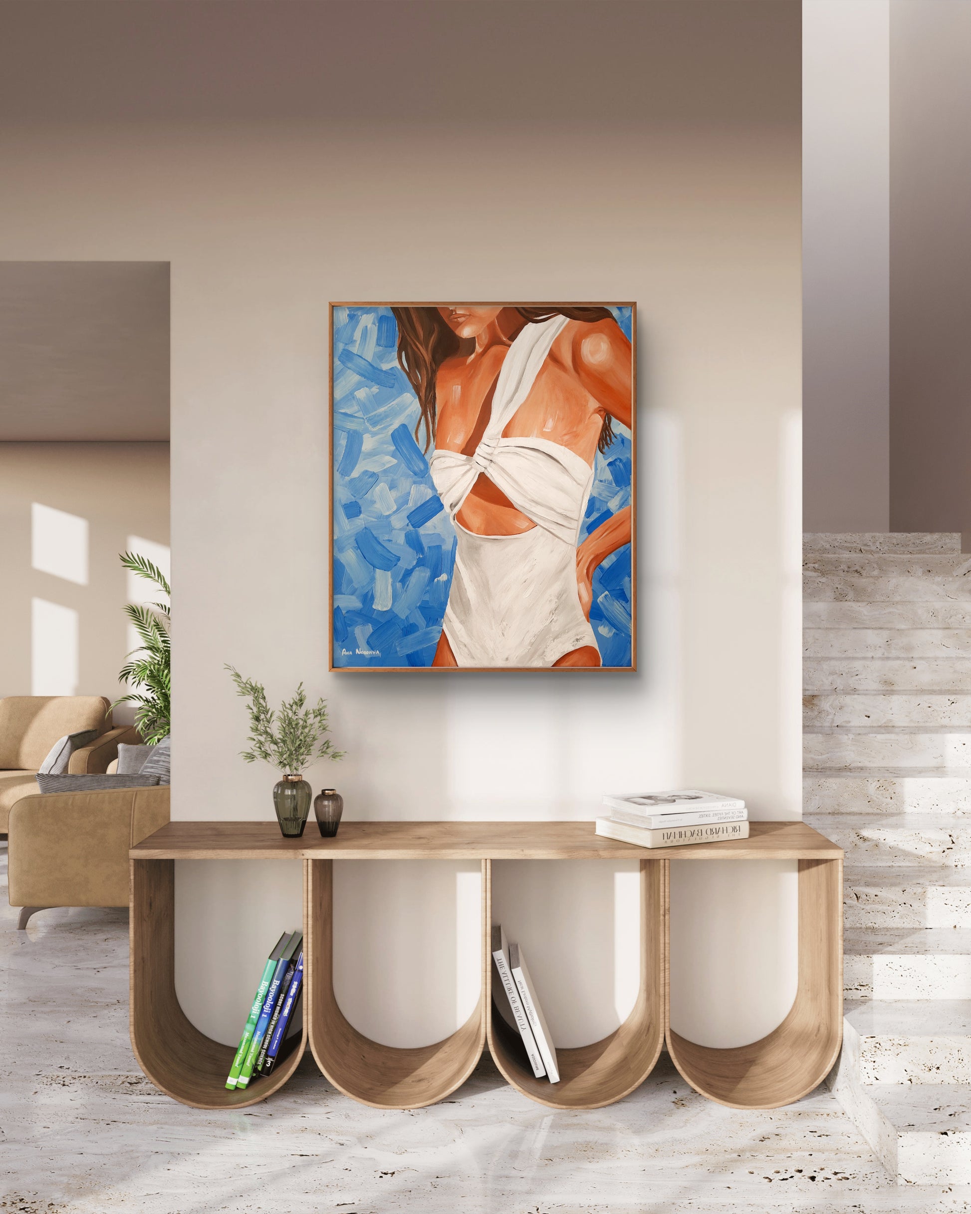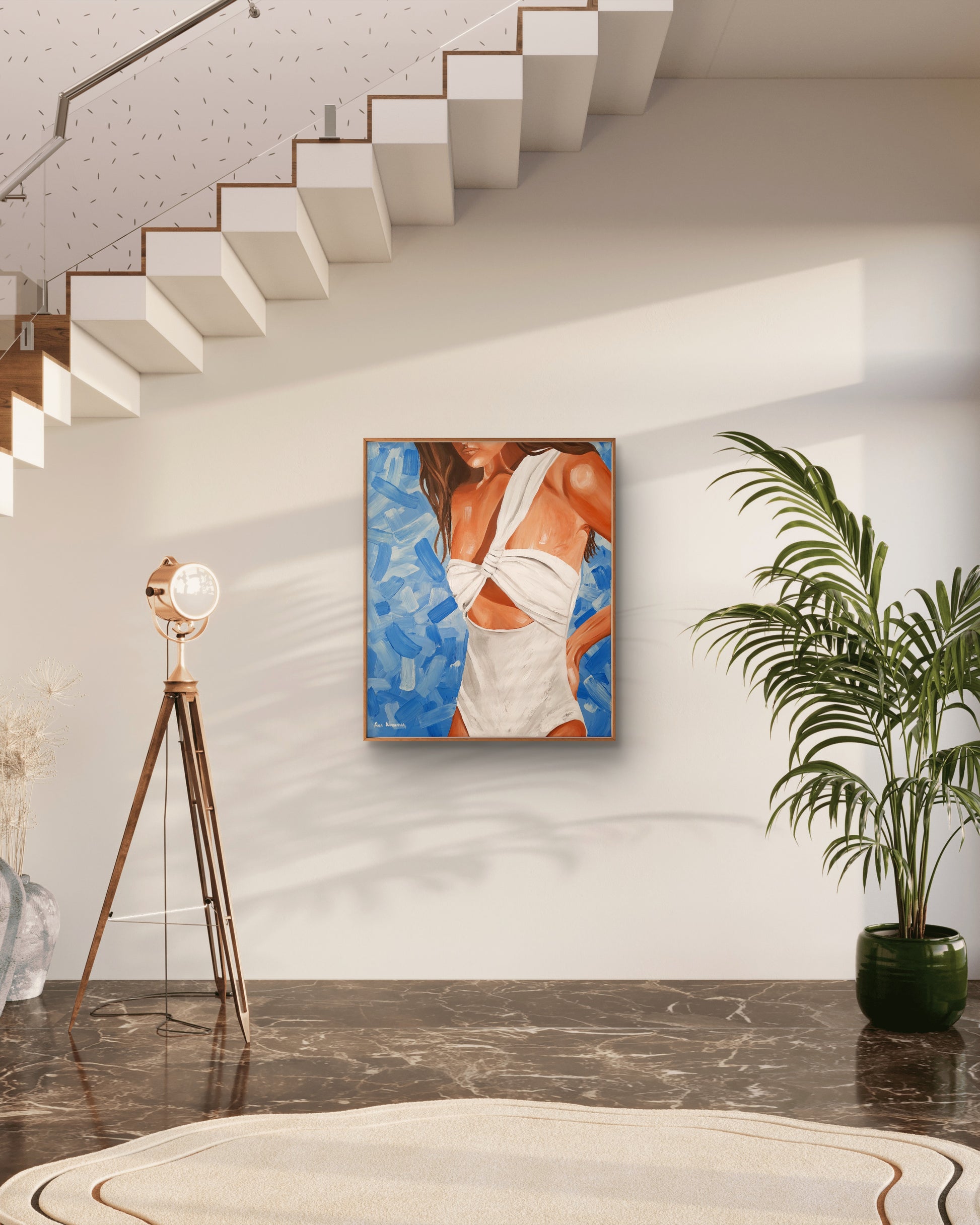 An evocative acrylic painting on canvas, "Sun-Kissed" celebrates the warmth of summer and the radiance of a sunlit figure. The vibrant brushstrokes and contrasting tones highlight both the intensity of the light and the soft elegance of the subject’s form, making this artwork a statement piece in any setting.