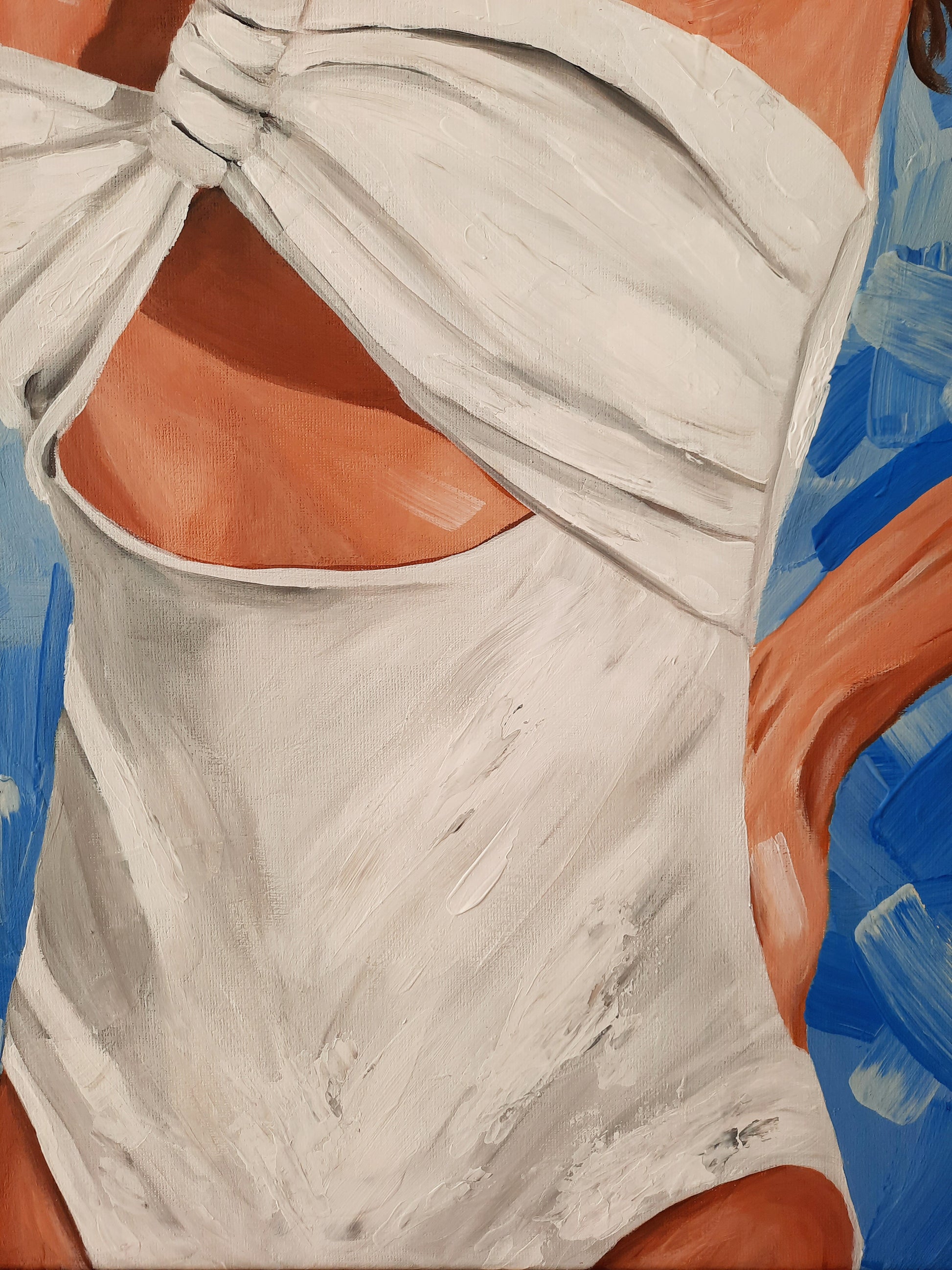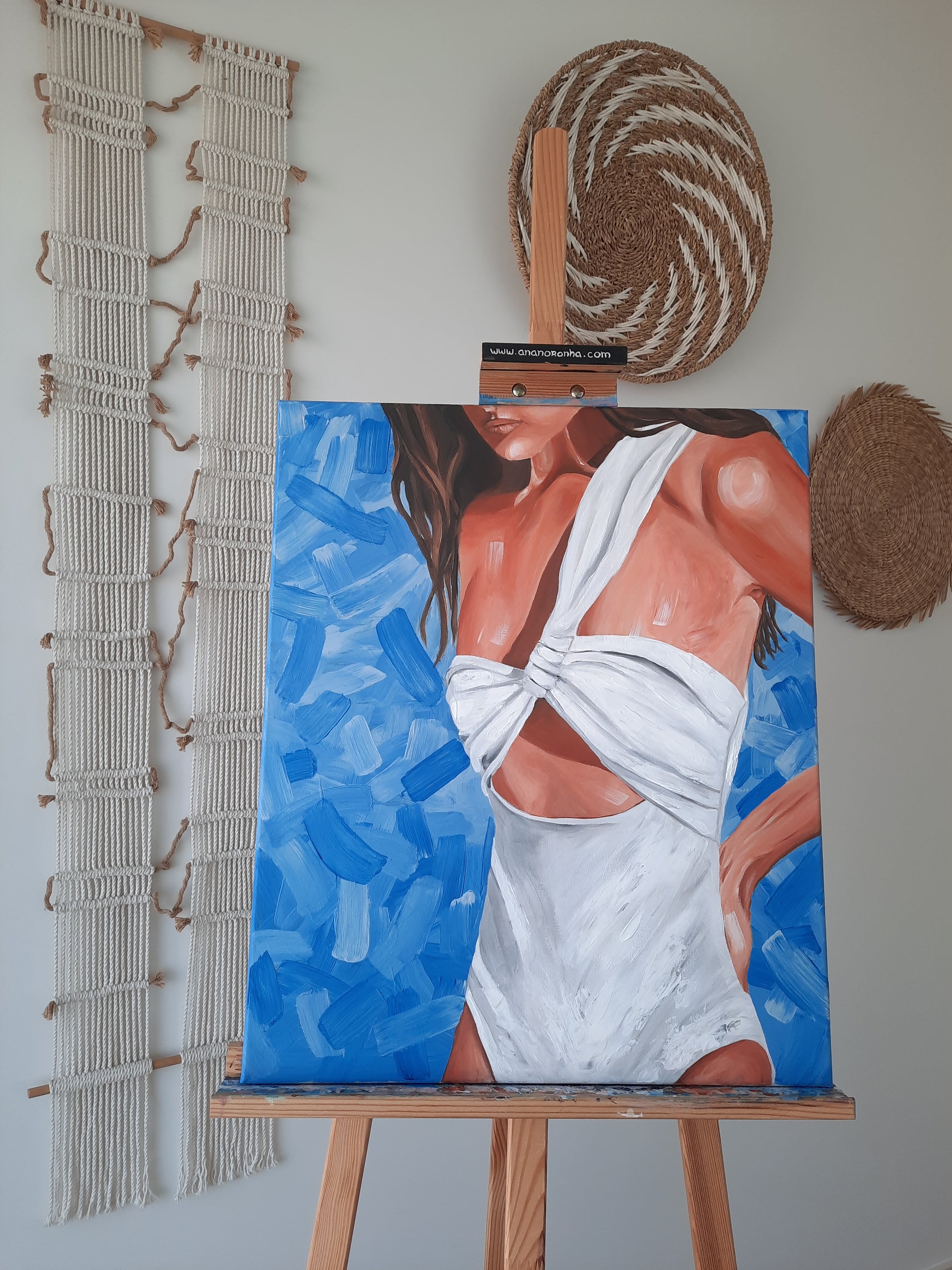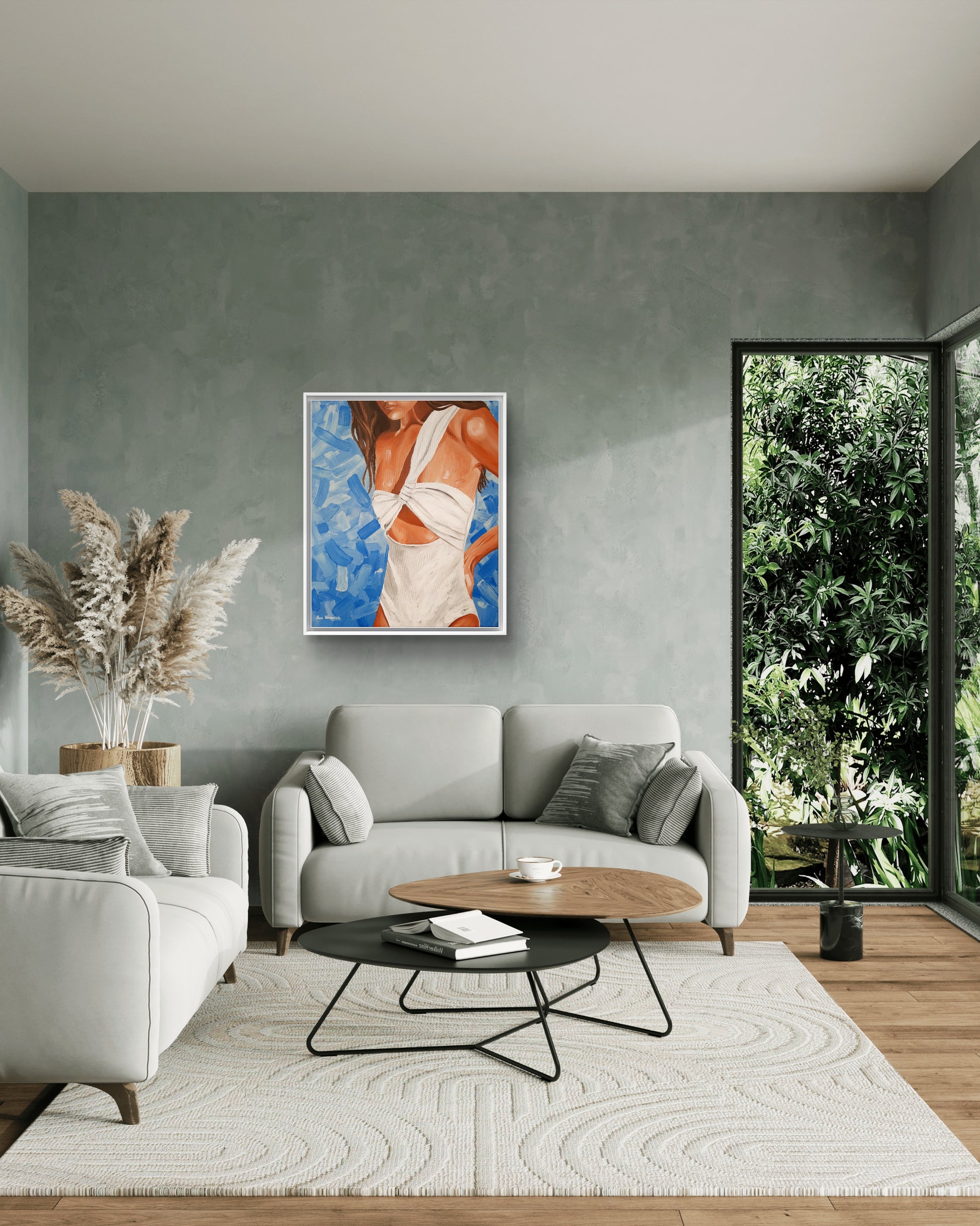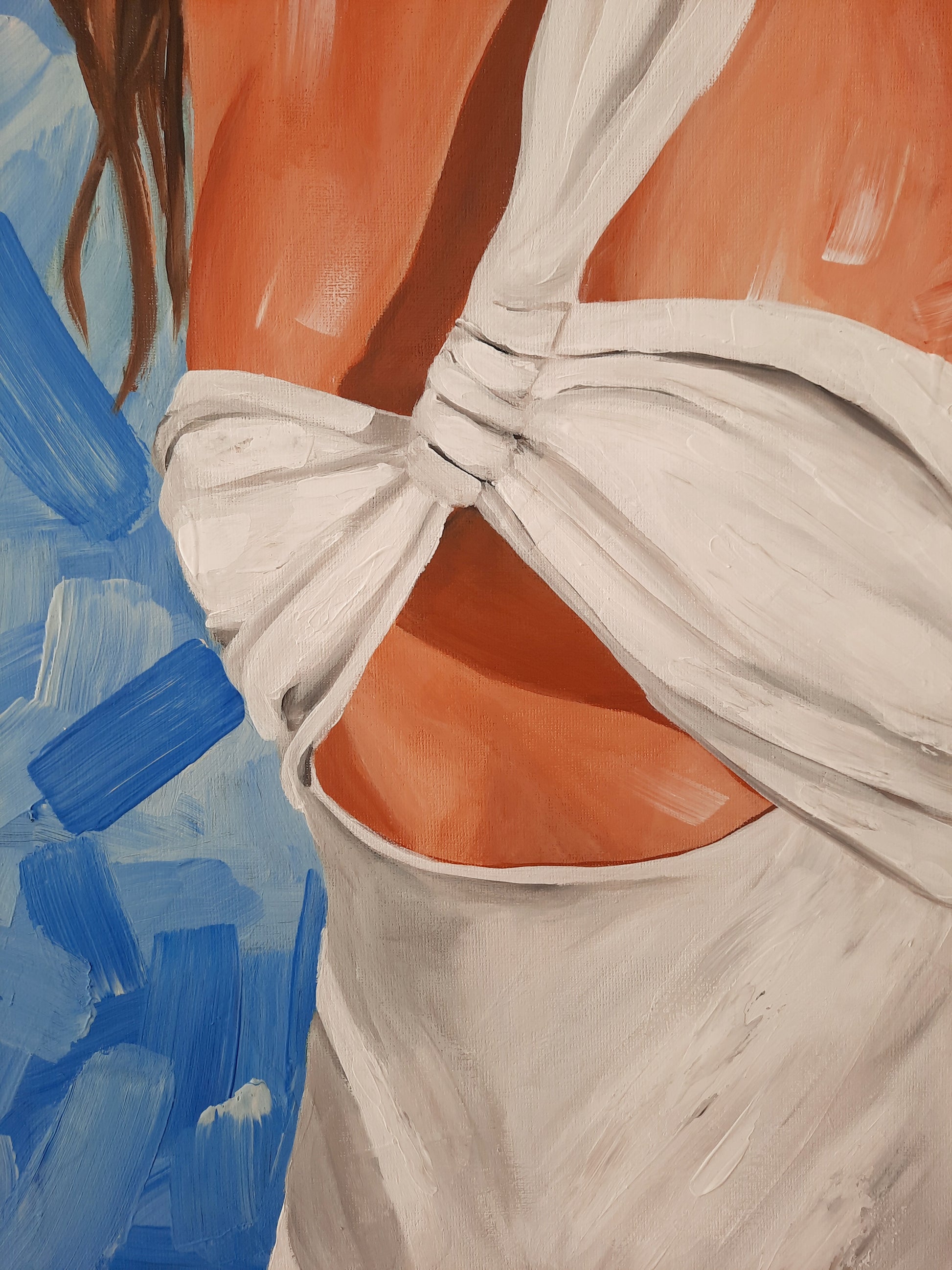 An evocative acrylic painting on canvas, "Sun-Kissed" celebrates the warmth of summer and the radiance of a sunlit figure. The vibrant brushstrokes and contrasting tones highlight both the intensity of the light and the soft elegance of the subject’s form, making this artwork a statement piece in any setting.