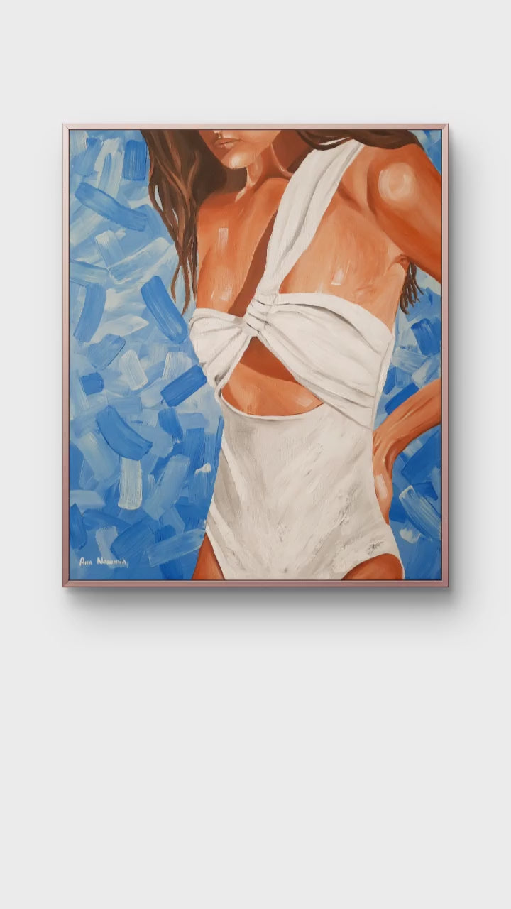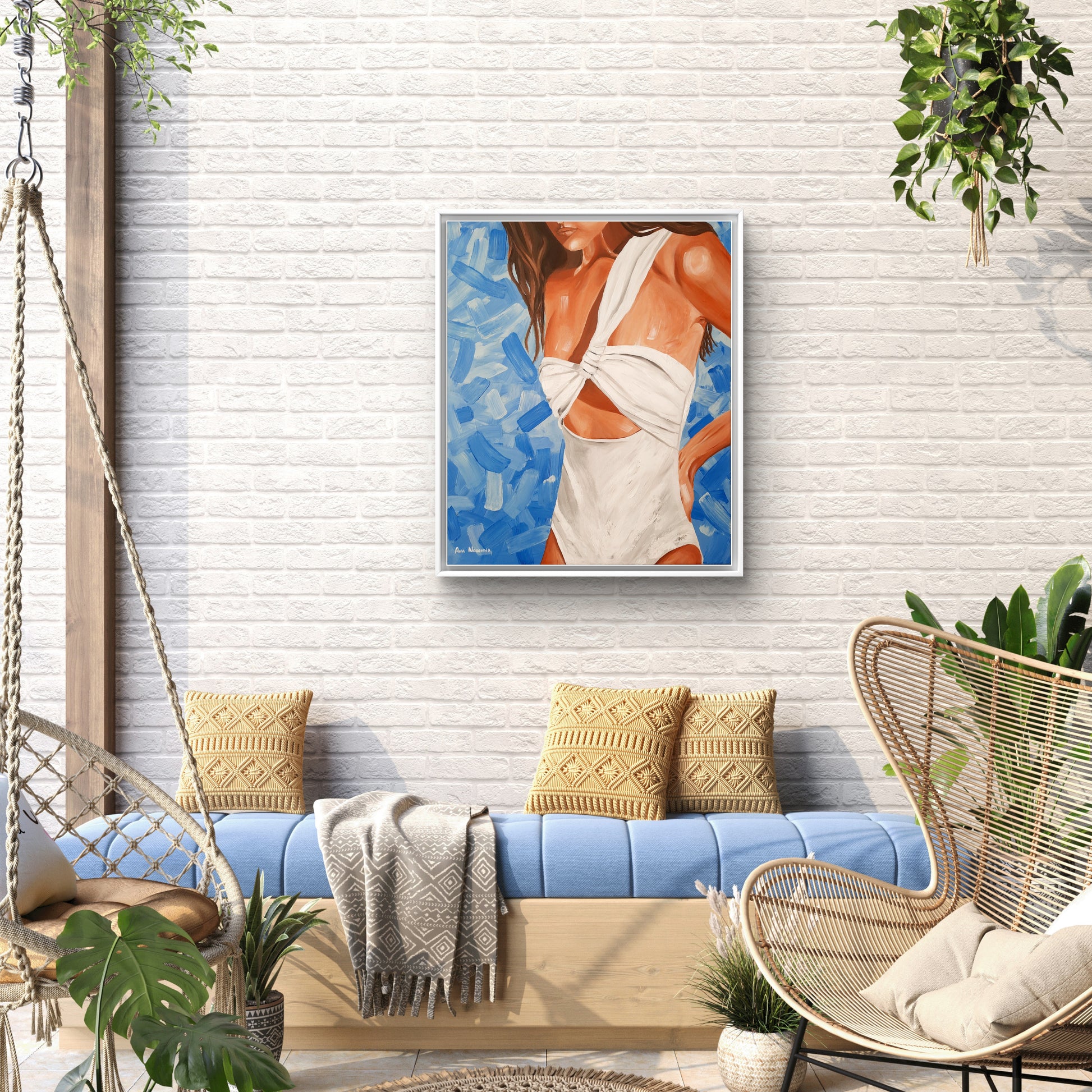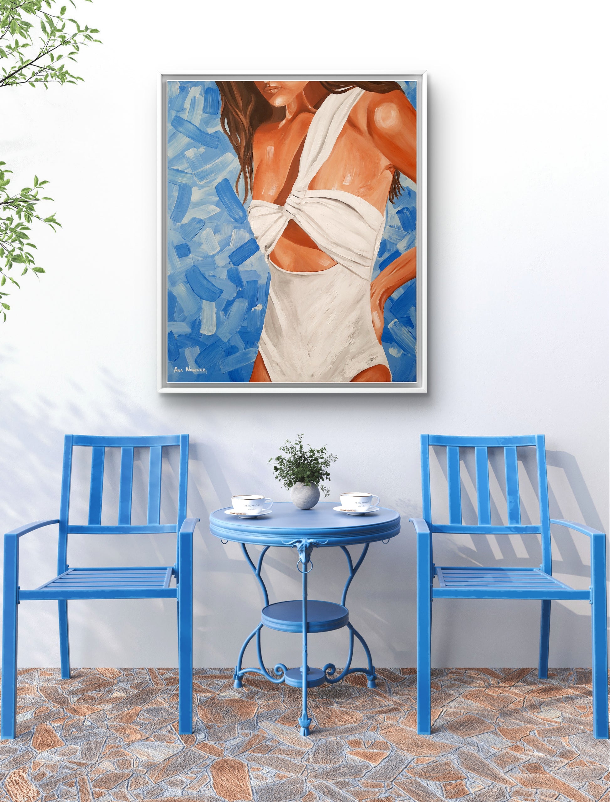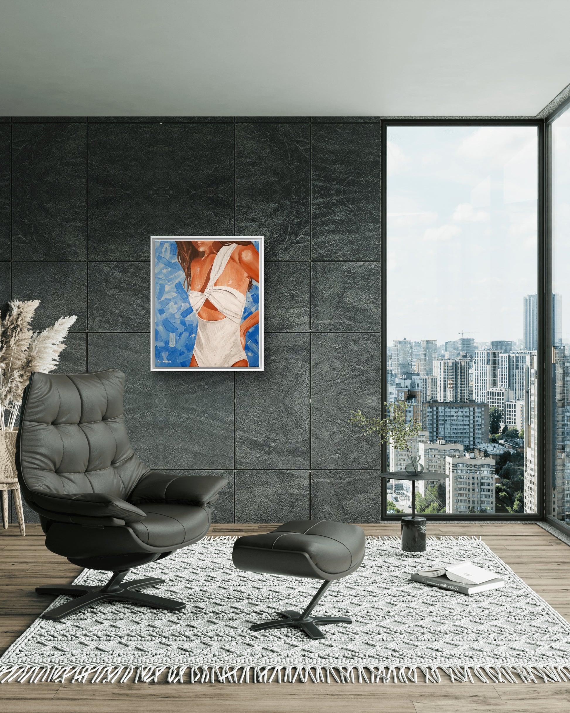 An evocative acrylic painting on canvas, "Sun-Kissed" celebrates the warmth of summer and the radiance of a sunlit figure. The vibrant brushstrokes and contrasting tones highlight both the intensity of the light and the soft elegance of the subject’s form, making this artwork a statement piece in any setting.