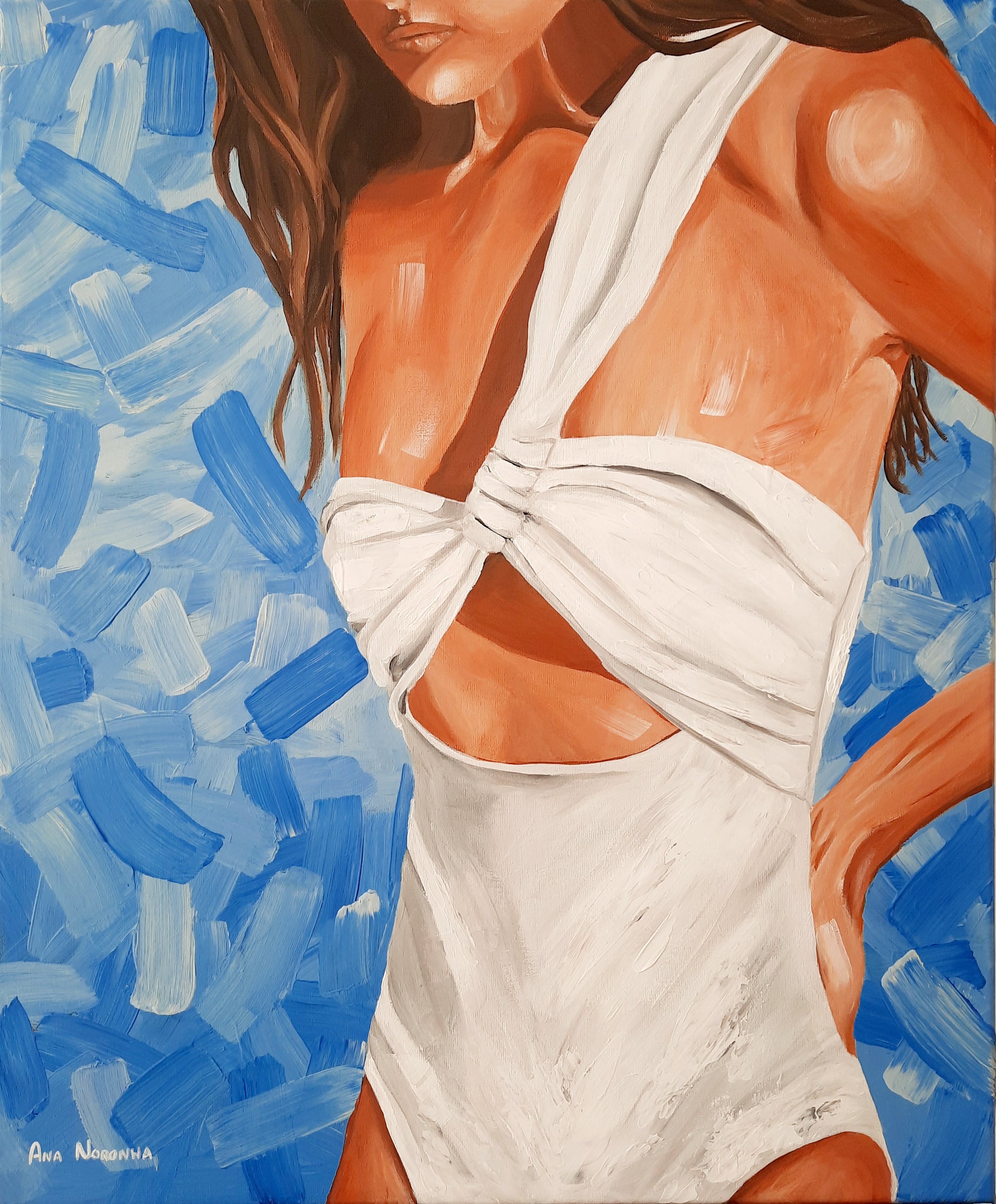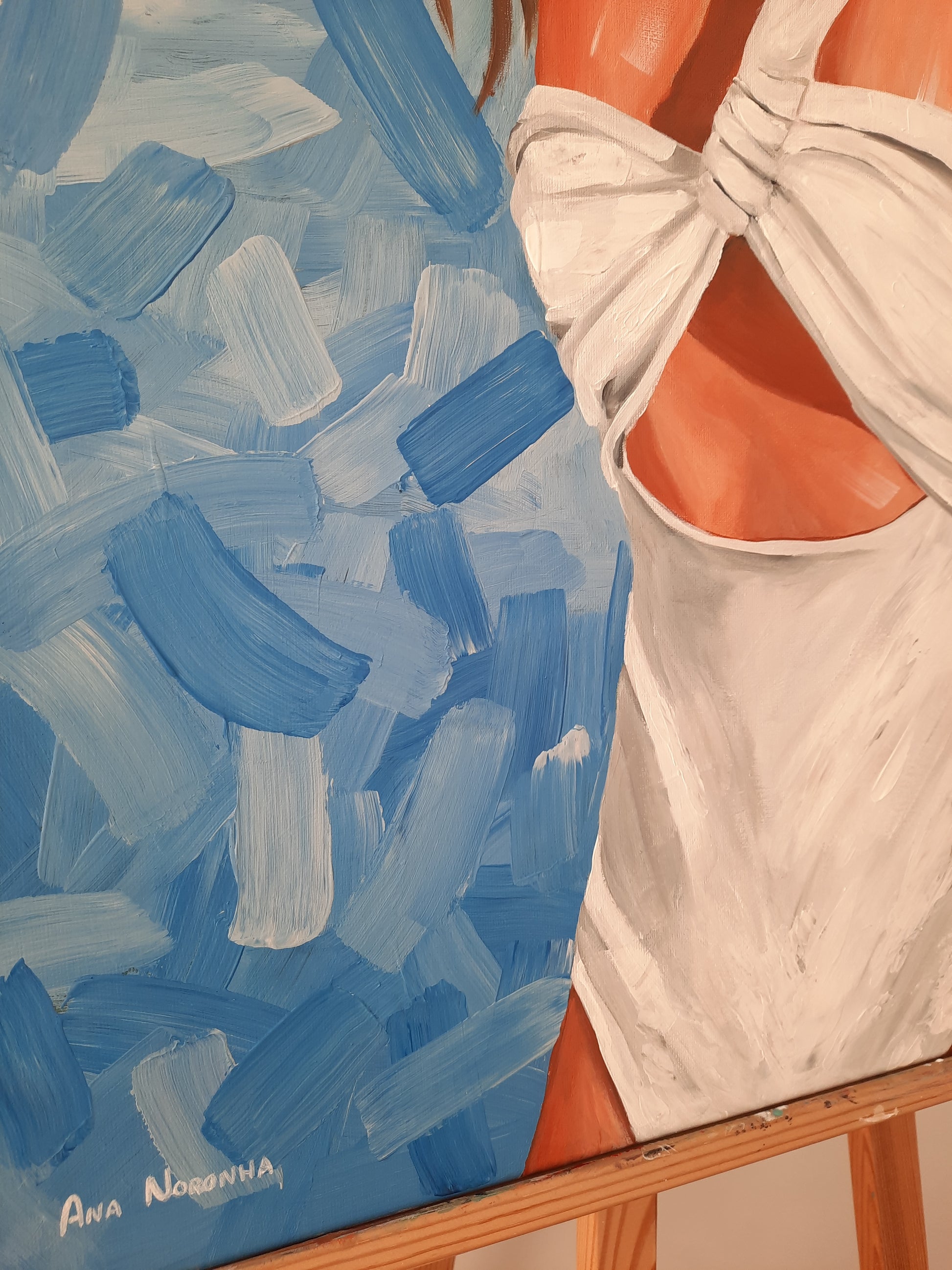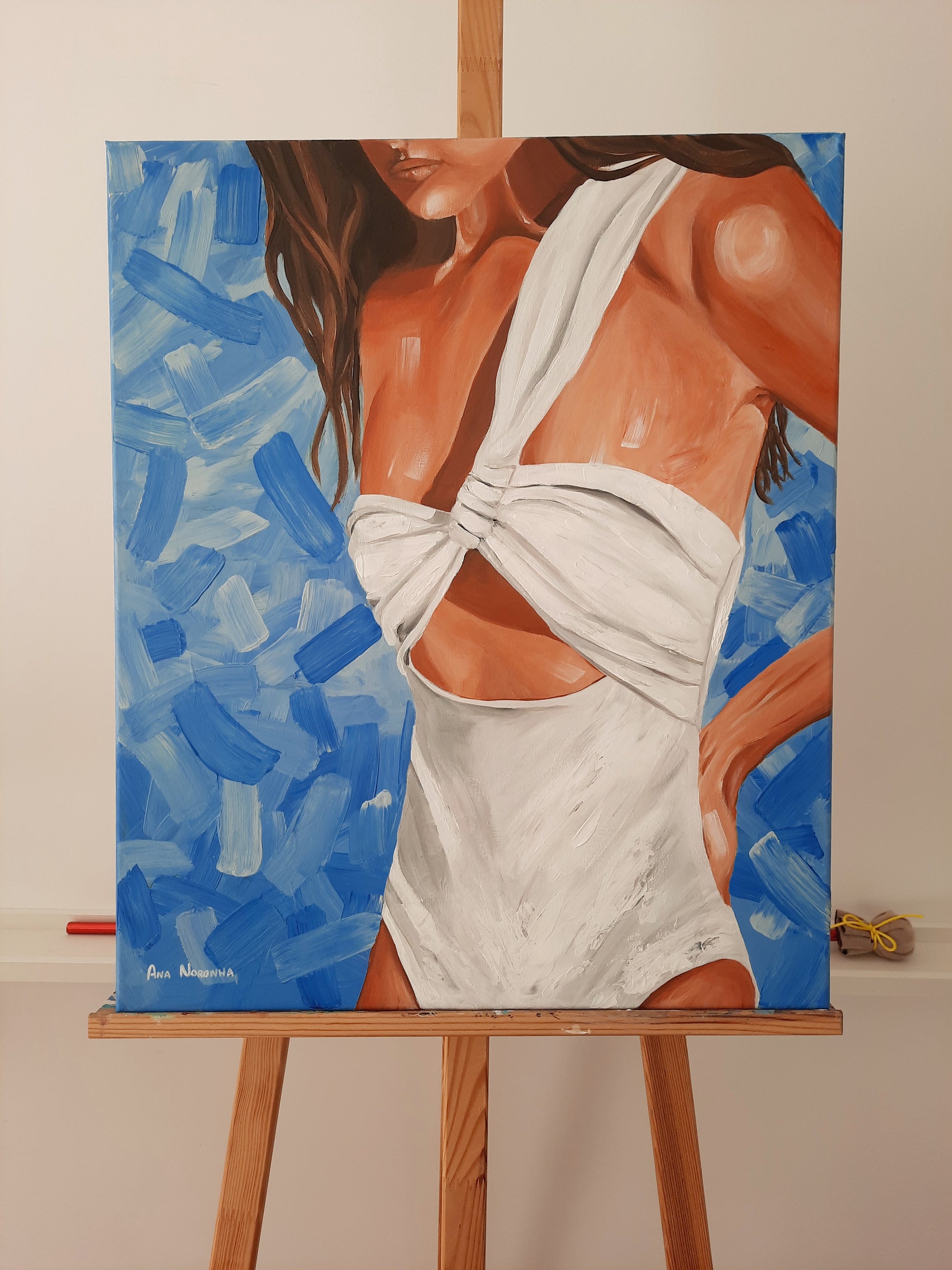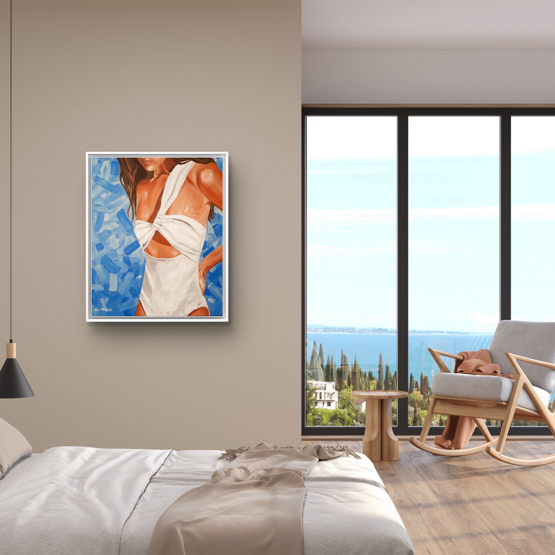 An evocative acrylic painting on canvas, "Sun-Kissed" celebrates the warmth of summer and the radiance of a sunlit figure. The vibrant brushstrokes and contrasting tones highlight both the intensity of the light and the soft elegance of the subject’s form, making this artwork a statement piece in any setting.