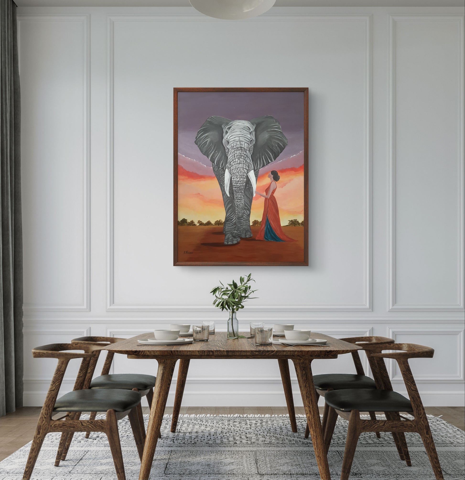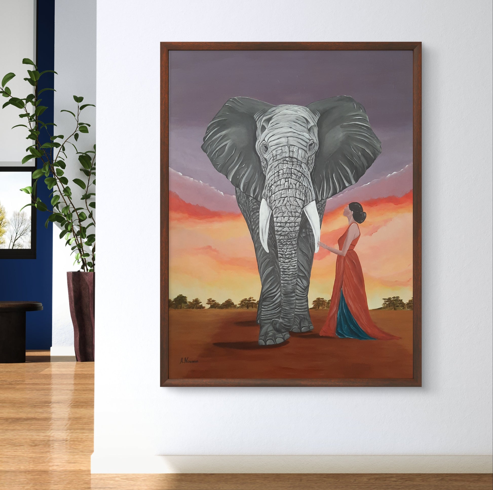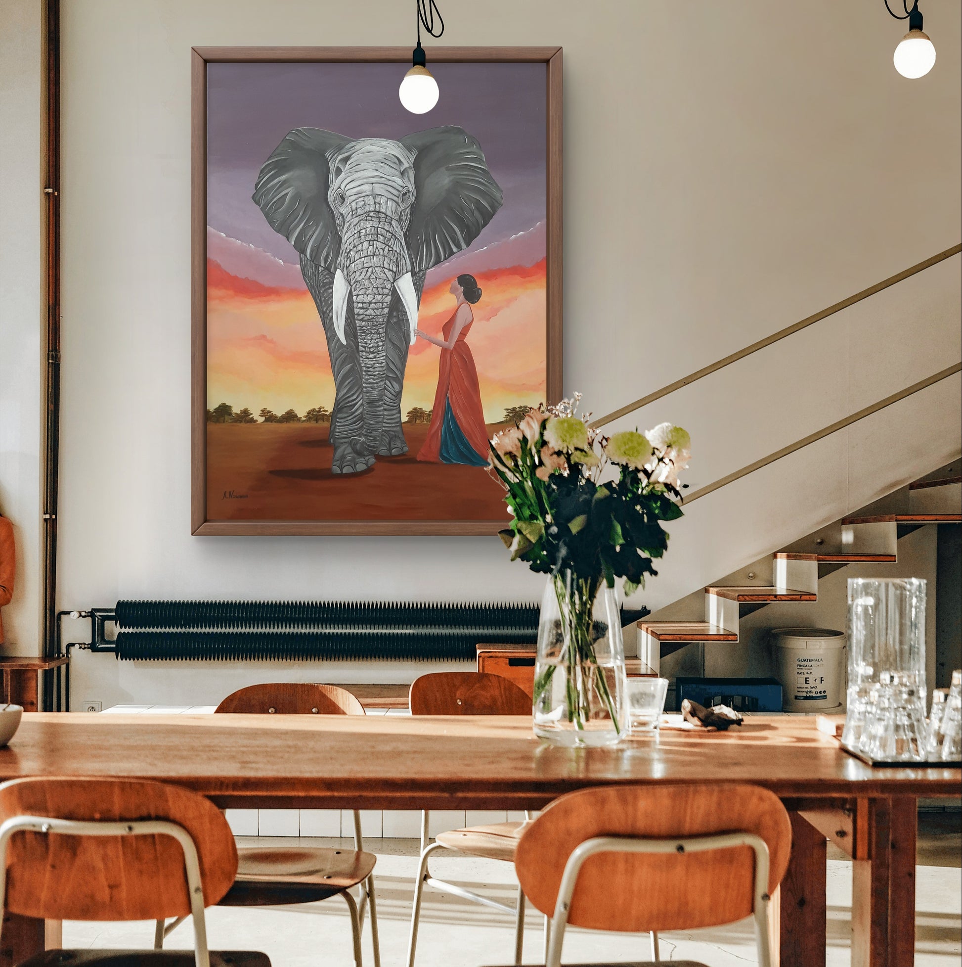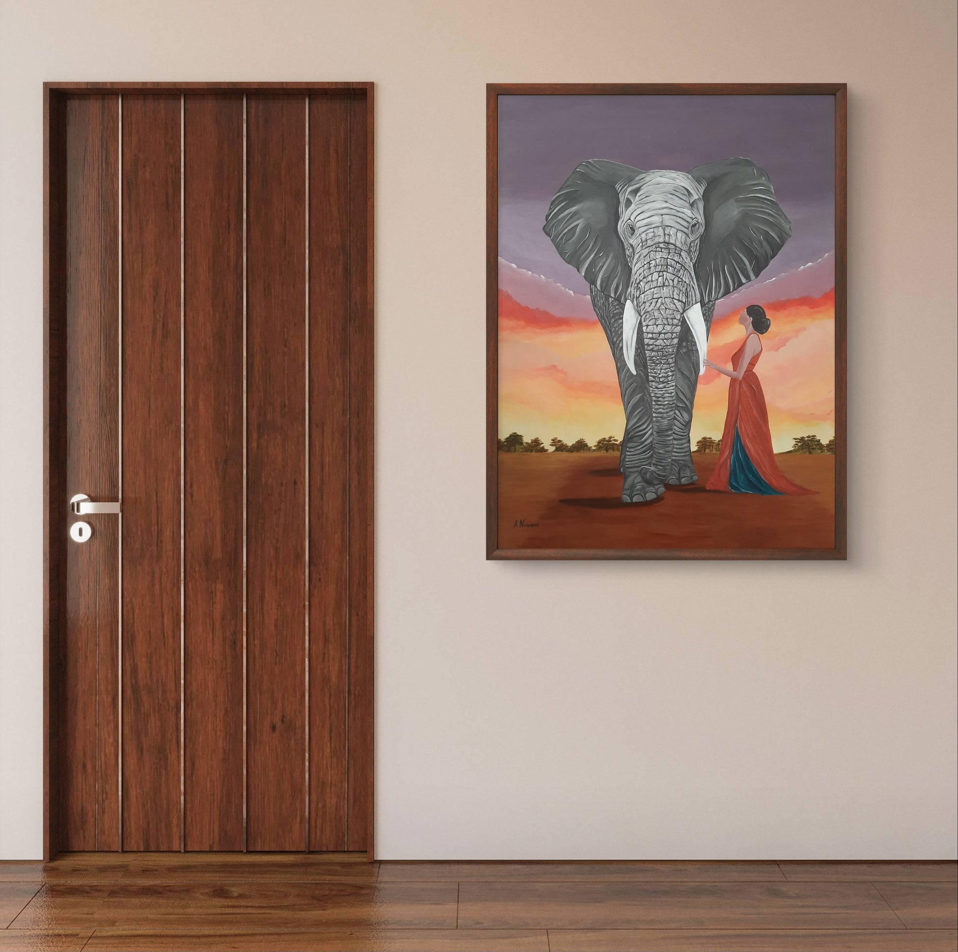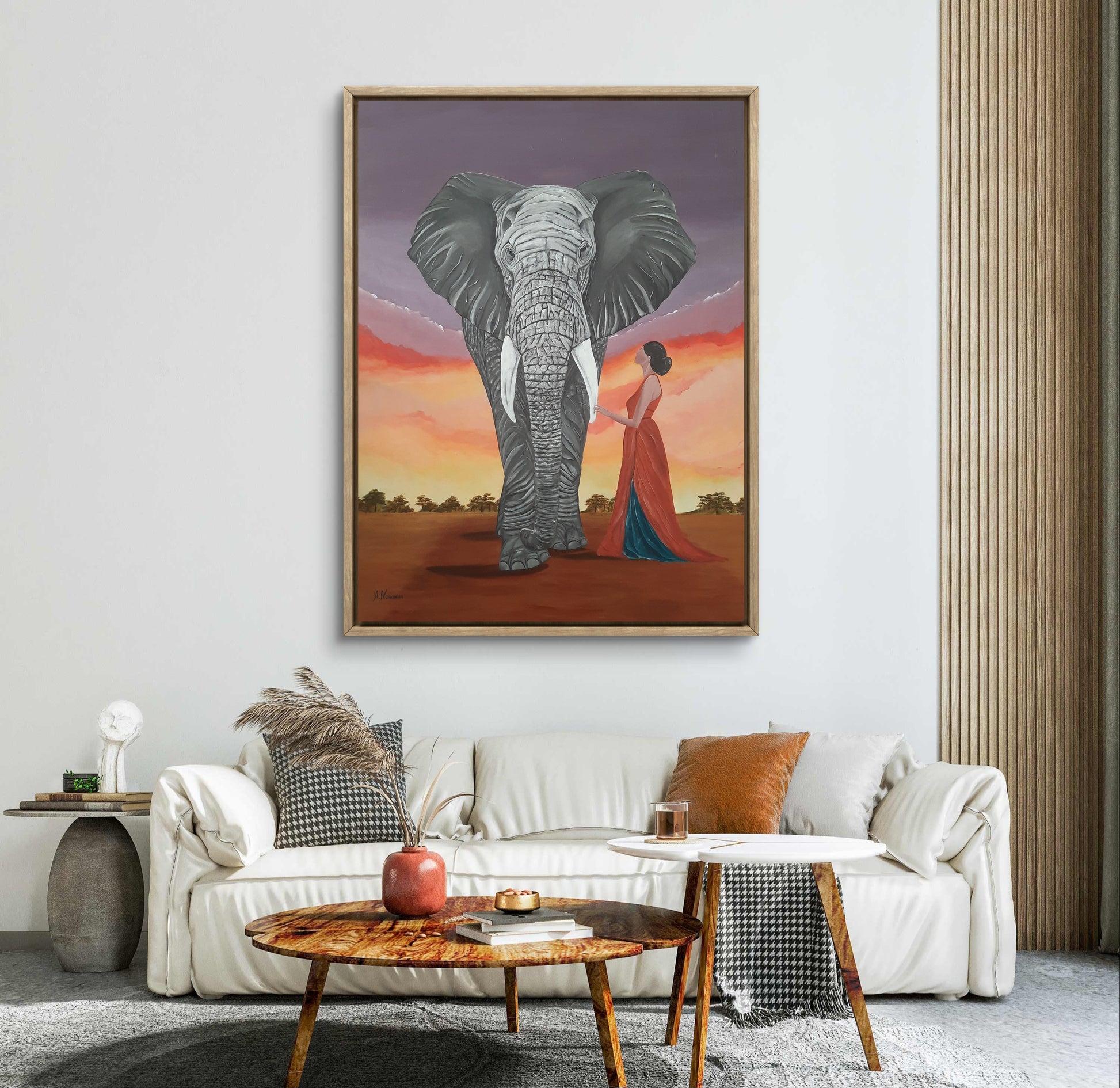 A striking acrylic painting on canvas, this artwork captures the profound connection between strength and serenity. The detailed depiction of an elephant alongside a poised woman against a stunning sunset backdrop evokes themes of harmony, courage, and self-reflection.