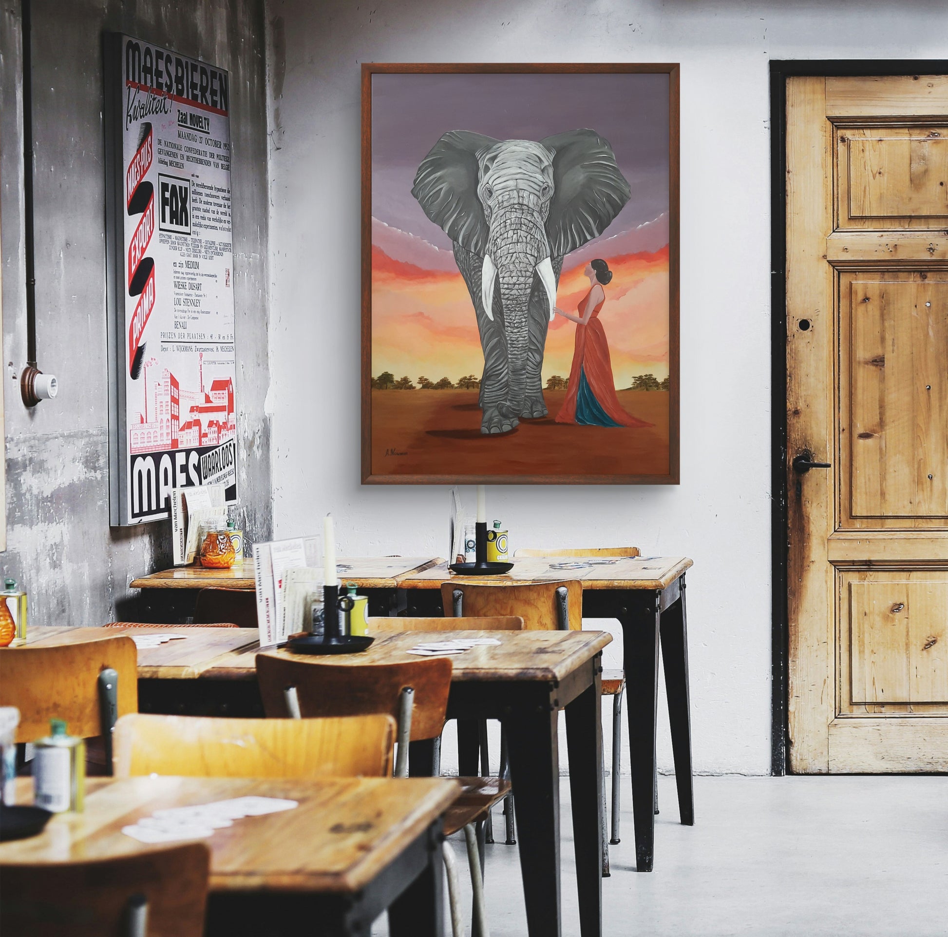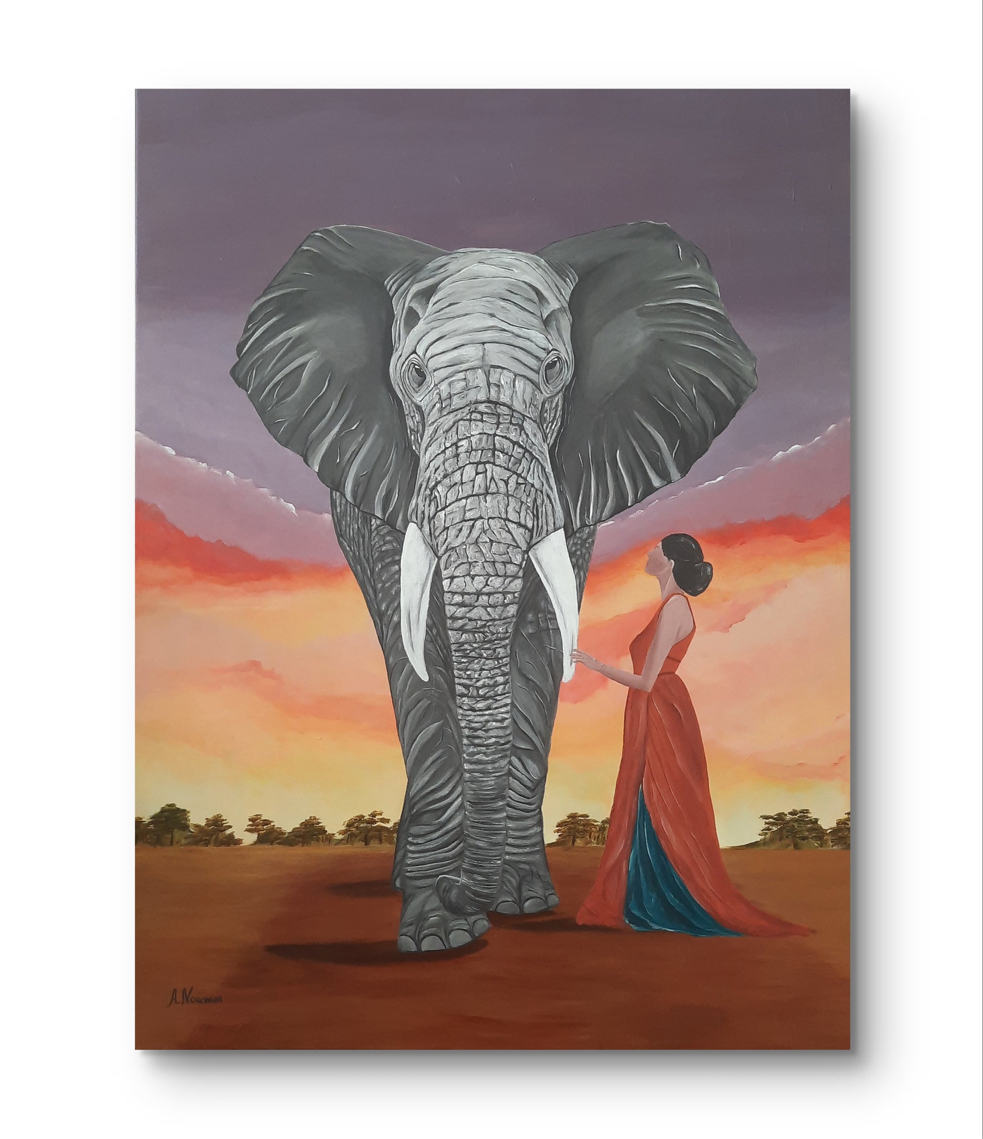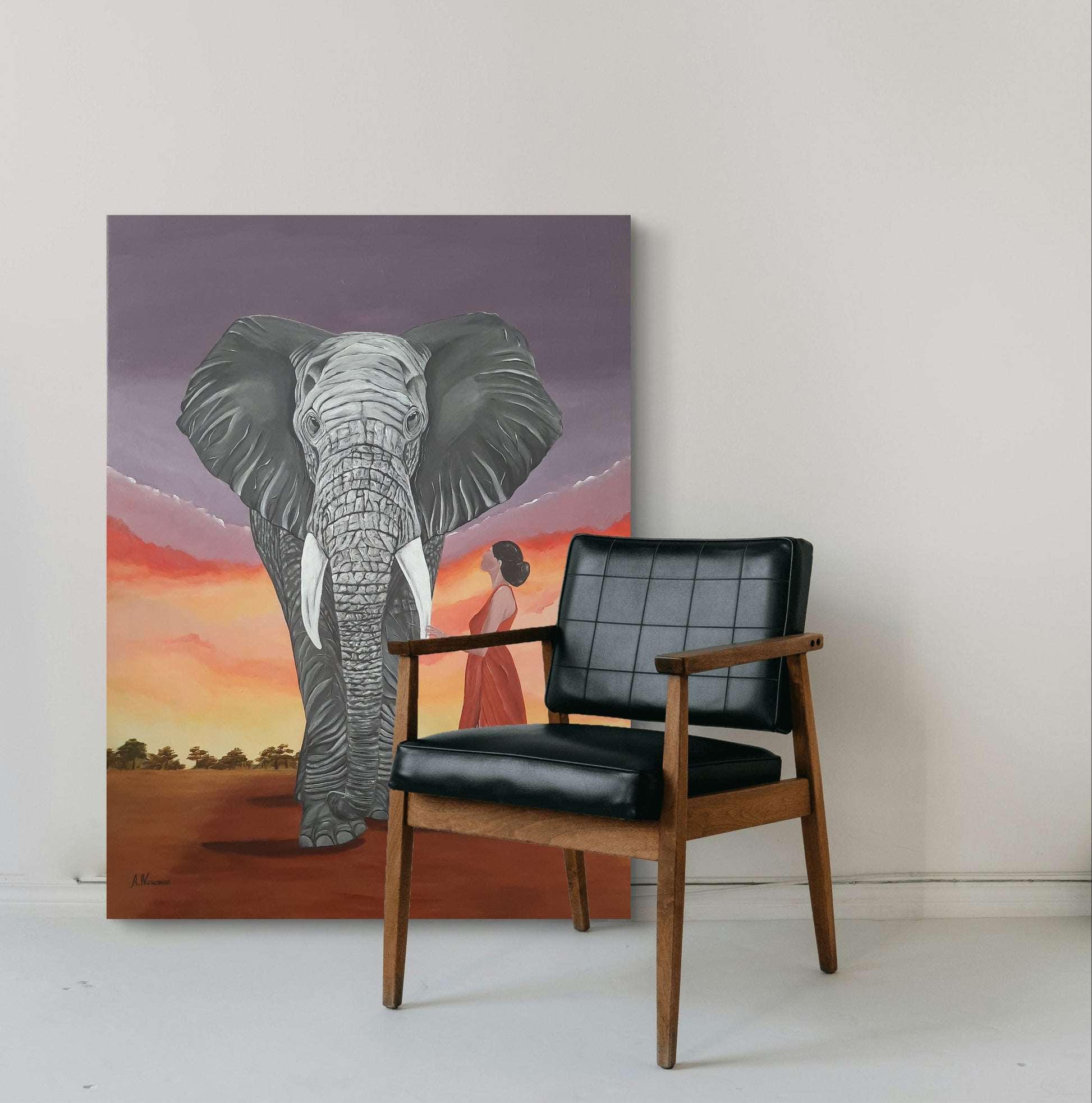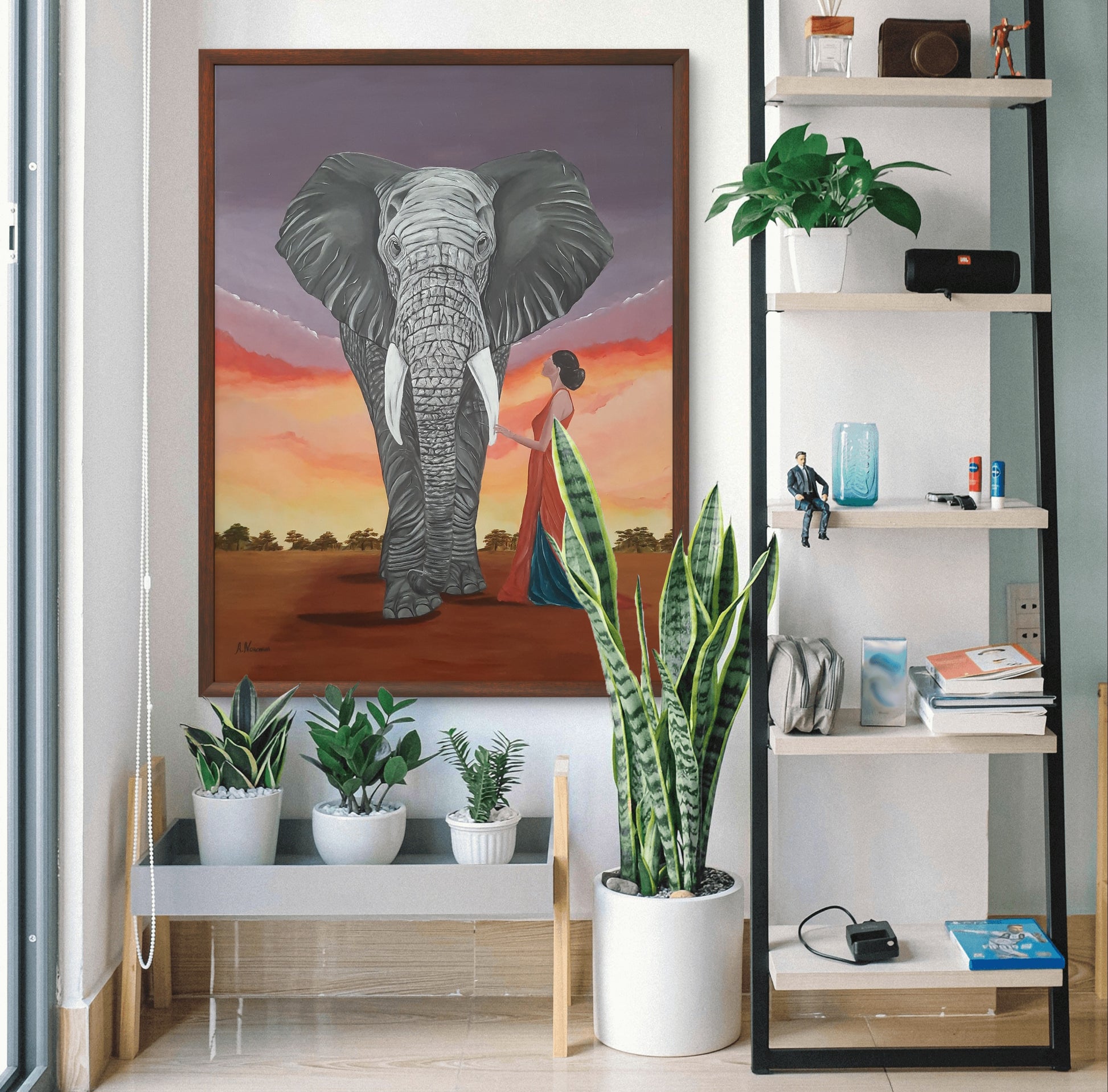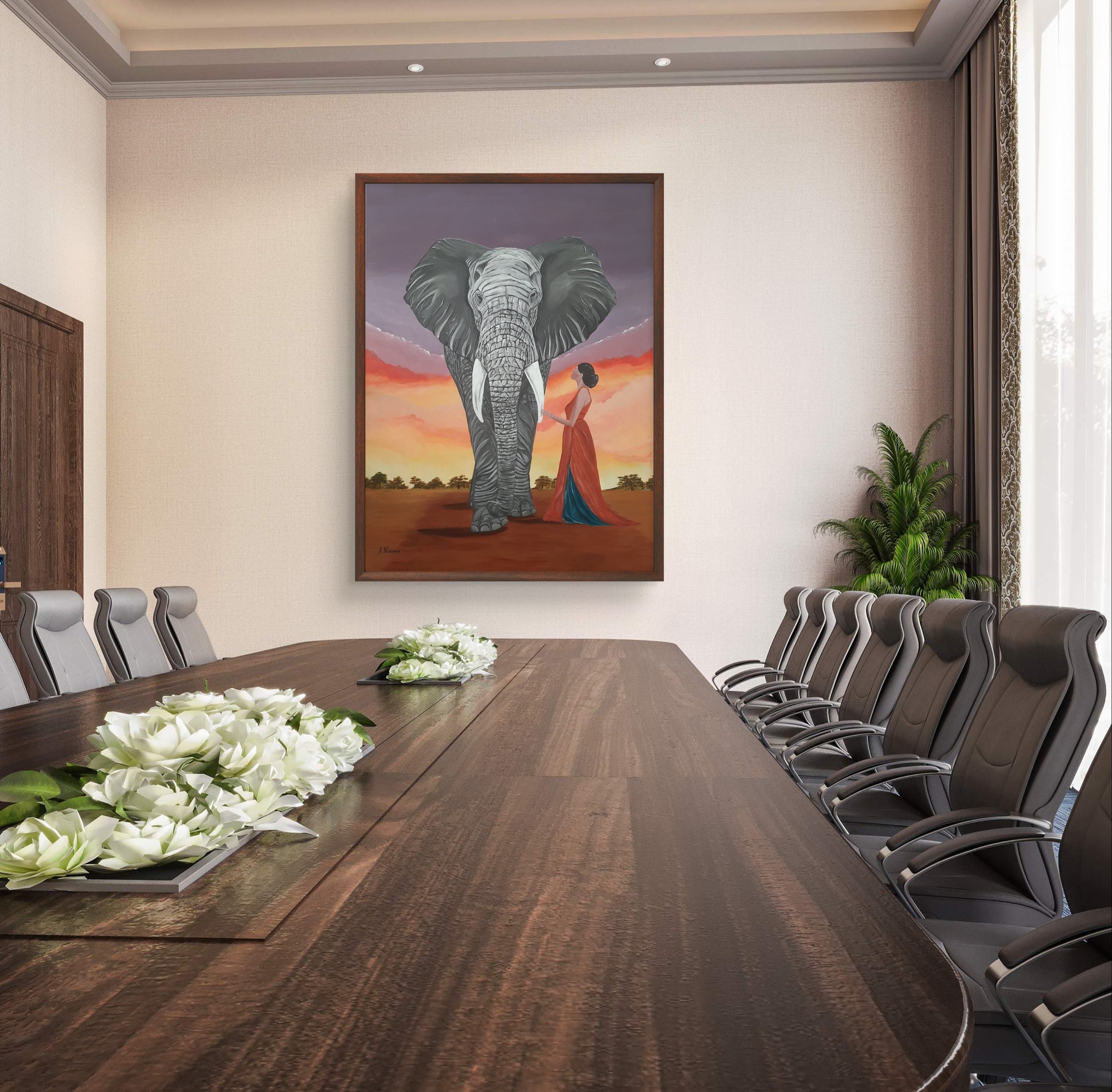 A striking acrylic painting on canvas, this artwork captures the profound connection between strength and serenity. The detailed depiction of an elephant alongside a poised woman against a stunning sunset backdrop evokes themes of harmony, courage, and self-reflection.