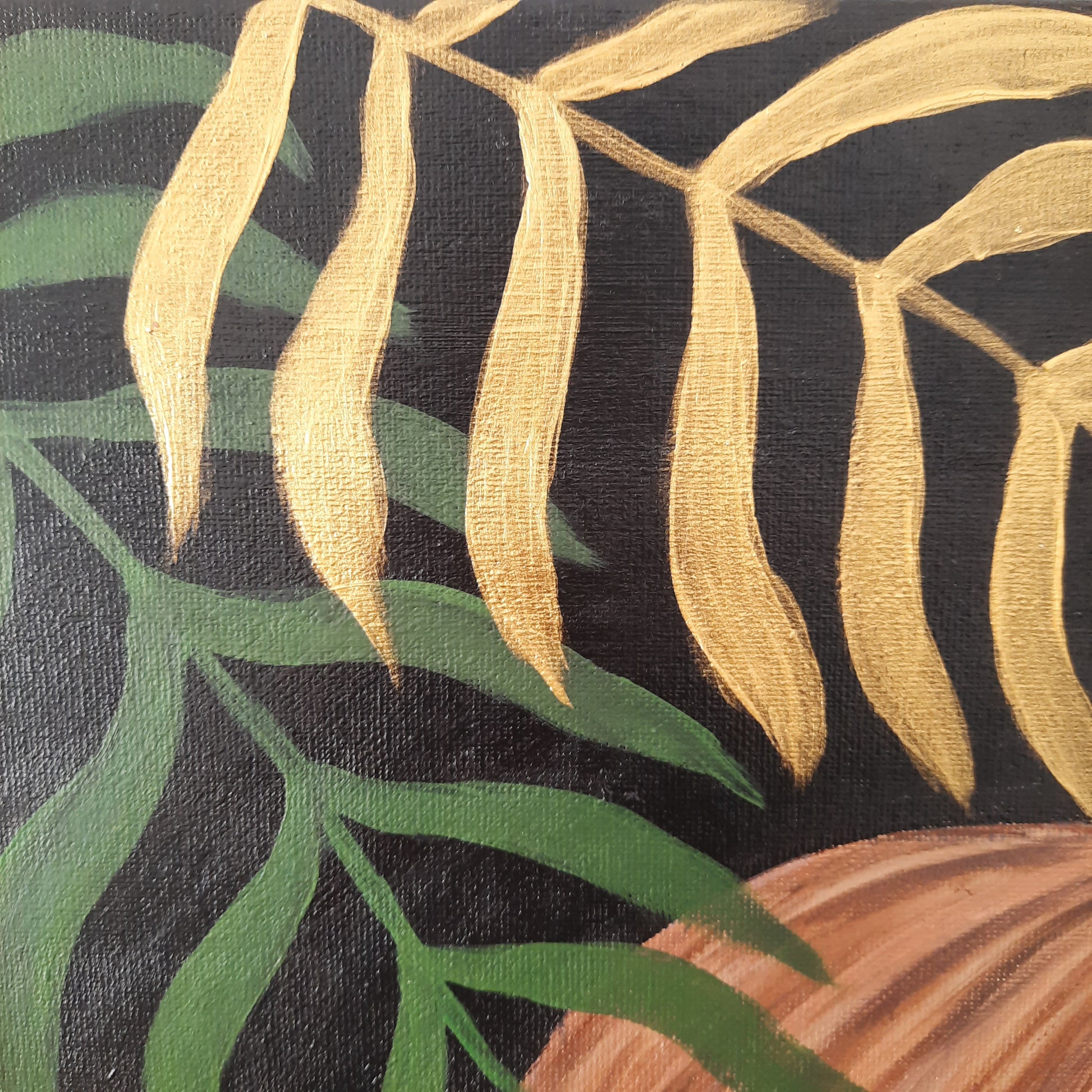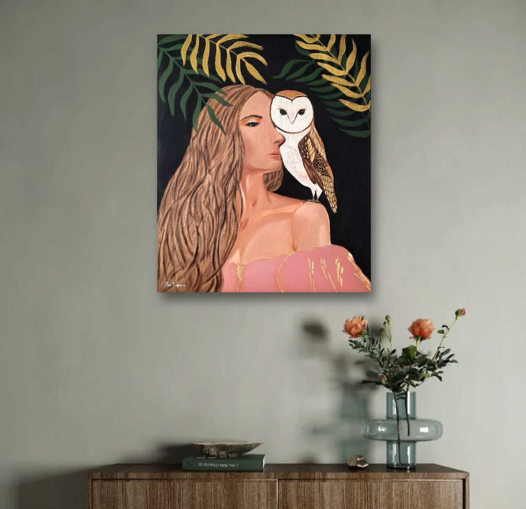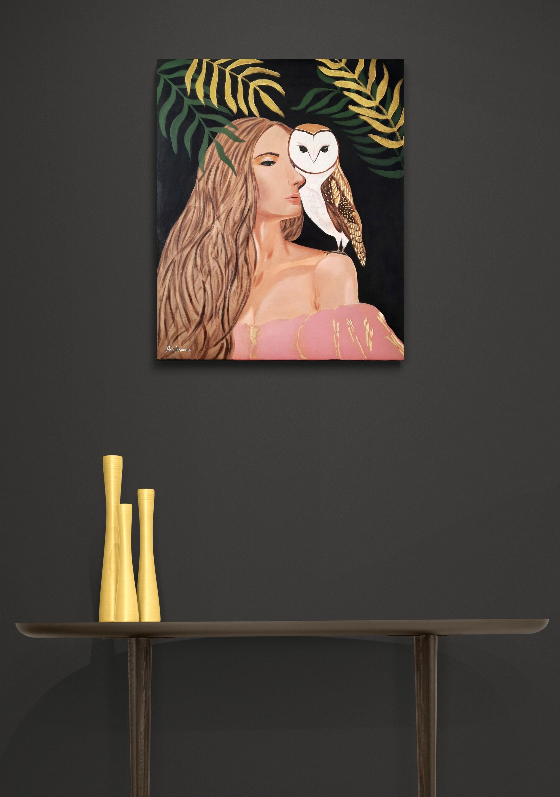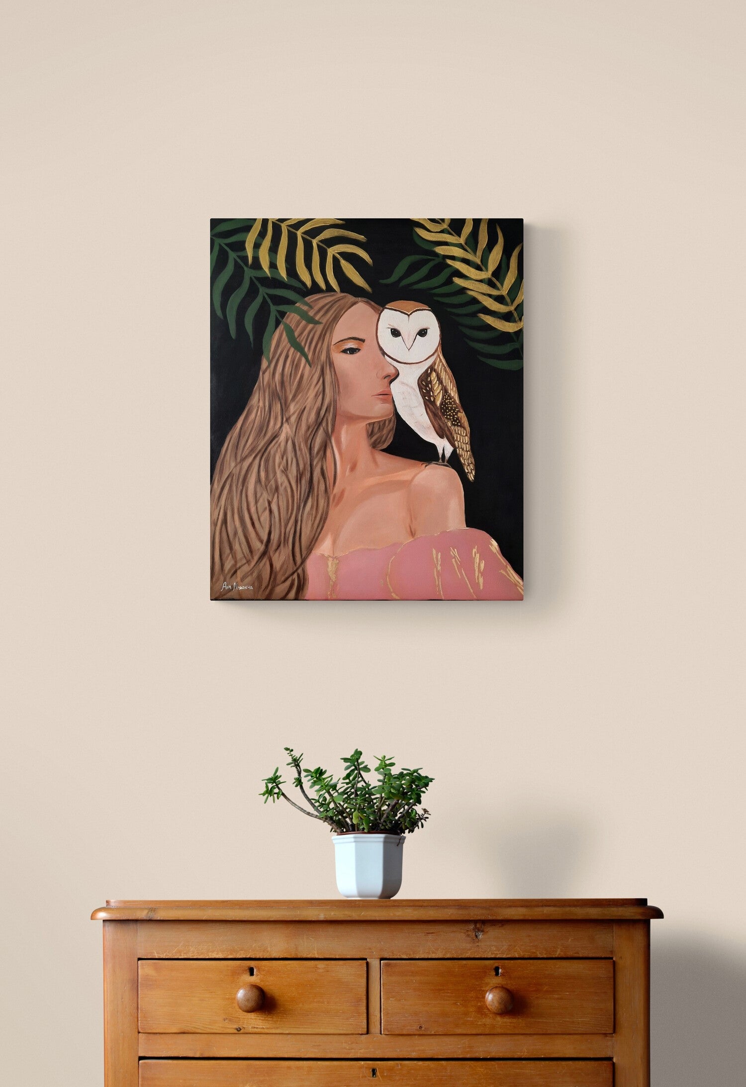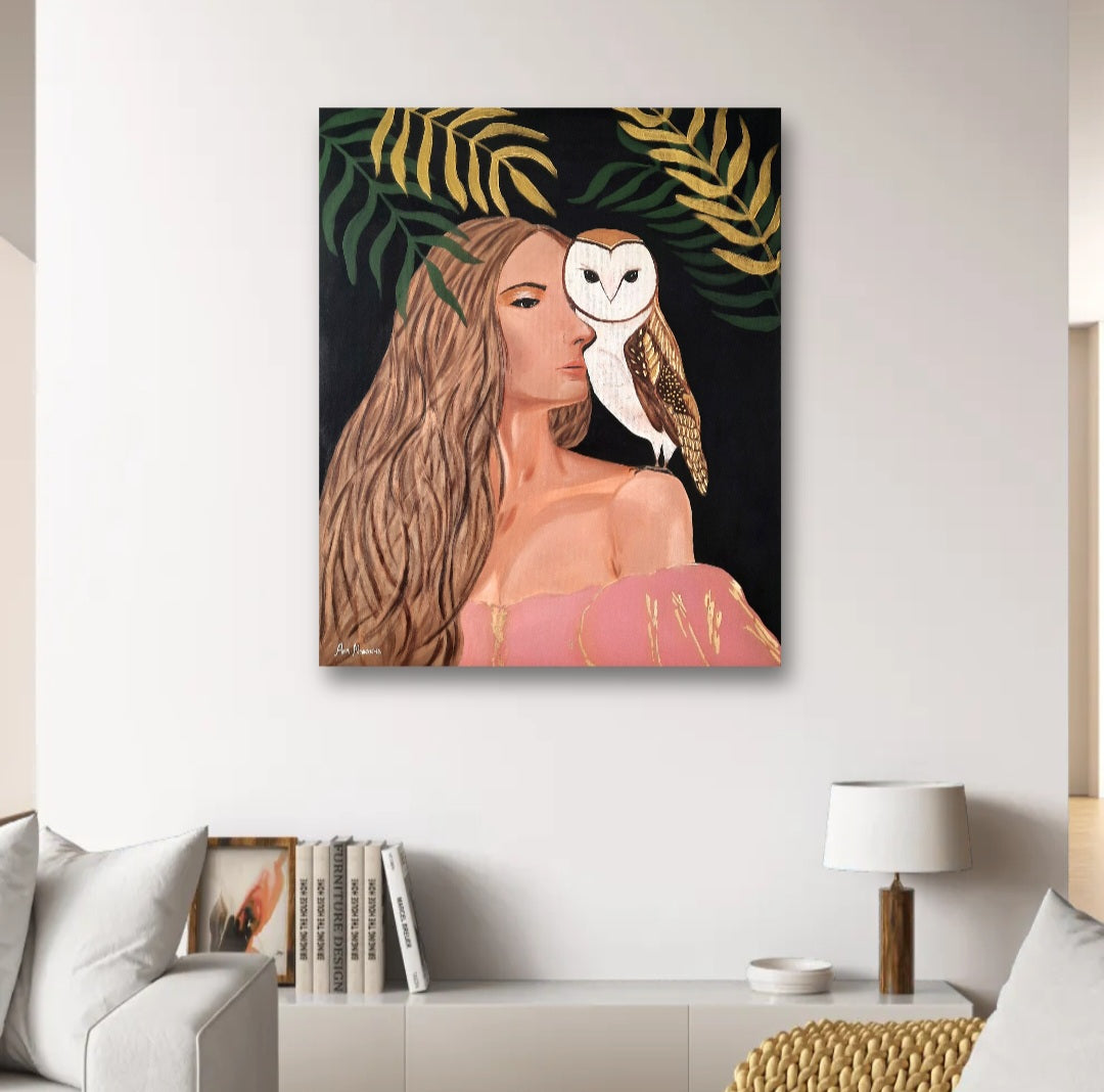 "The Silent Observer" is an original acrylic painting on canvas, signed and dated on the back by the artist. This striking piece captures the quiet connection between a woman and a barn owl, symbolizing wisdom, intuition, and silent strength. The deep black background contrasts beautifully with golden foliage, adding depth and elegance.